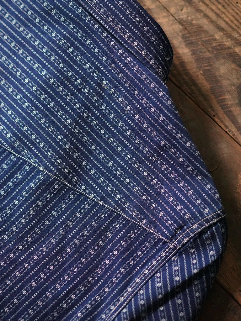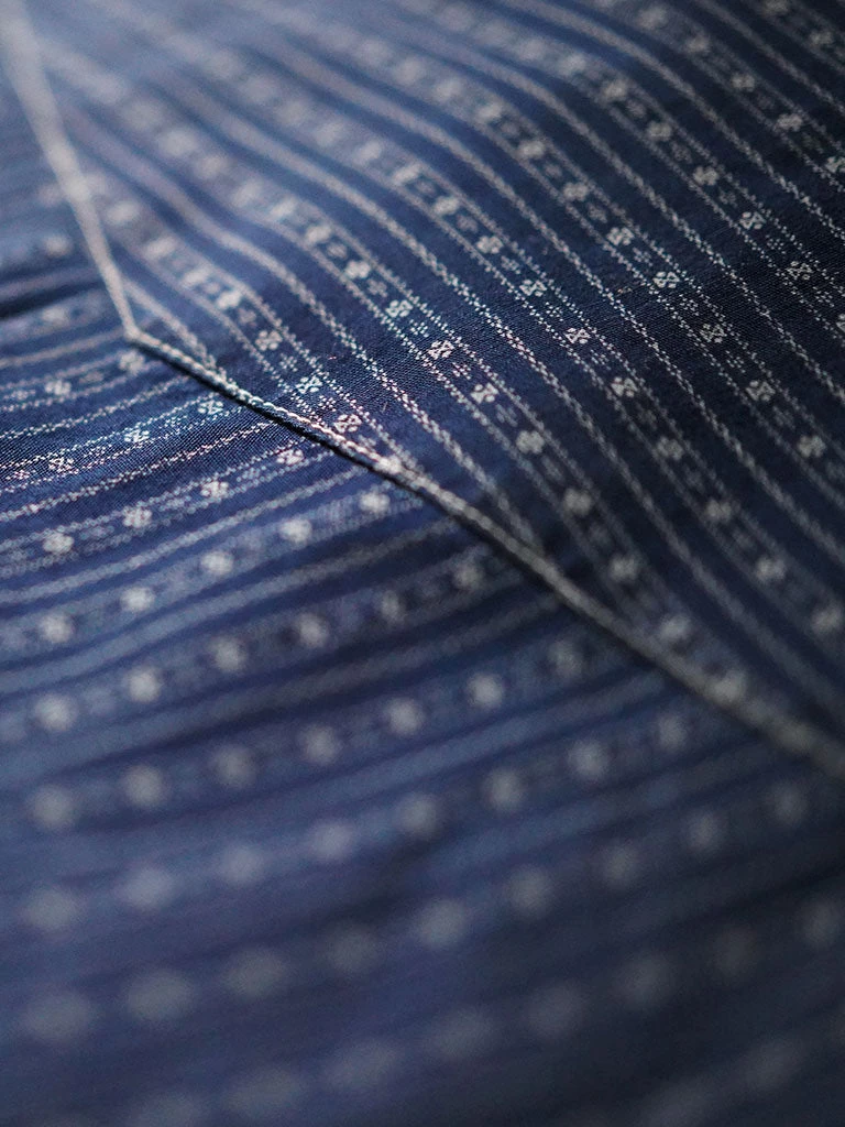 The fabric of the shirt is a reproduction of a piece of indigo cloth from the 1880s, with minor modifications to give it its original appearance. The cloth was made in the United States and exported to Africa, where it was later found by an American retro enthusiast. The printing pattern is seemingly simple, but it is not easy to produce. It was tried in four print dye factory, the depth of the bottom dye, the number of dyeing, the temperature and time of washing, and the previous debugging of the cloth sample for many times, so that the current satisfactory effect was achieved. The old cloth of 1880 has become thin and fragile after years of baptism. After many times of analysis and comparison, the thickness of the yarn has been increased, and the density has been improved, making the cloth surface more in line with the contemporary wearing environment.