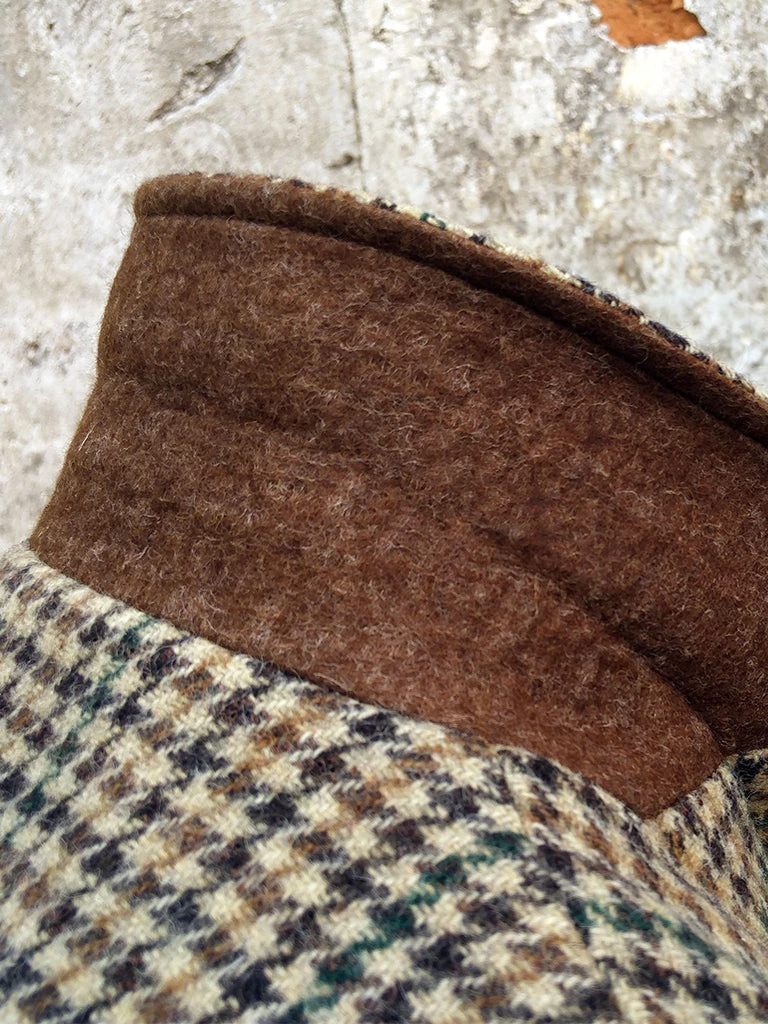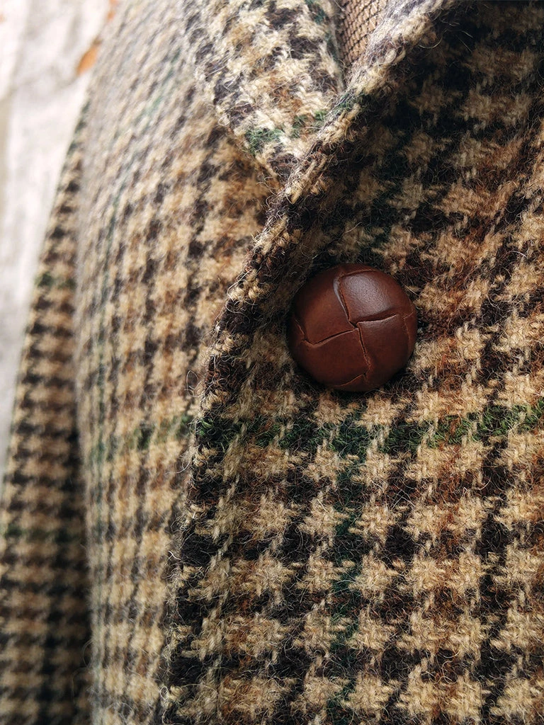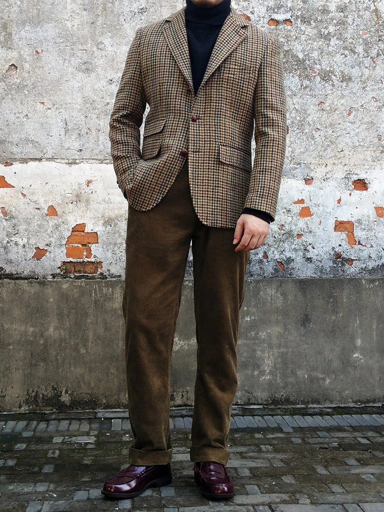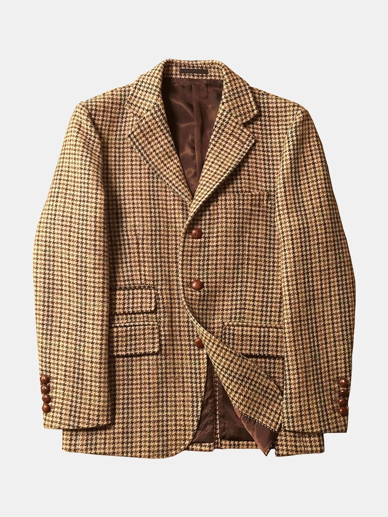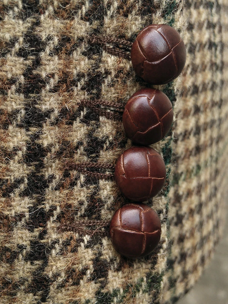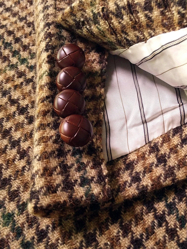 This jacket is made of Hound’s Tooth Check tweed, which was popular in the 1950s, in a classic American three-button blazer style, and with hand-woven cowhide buttons.