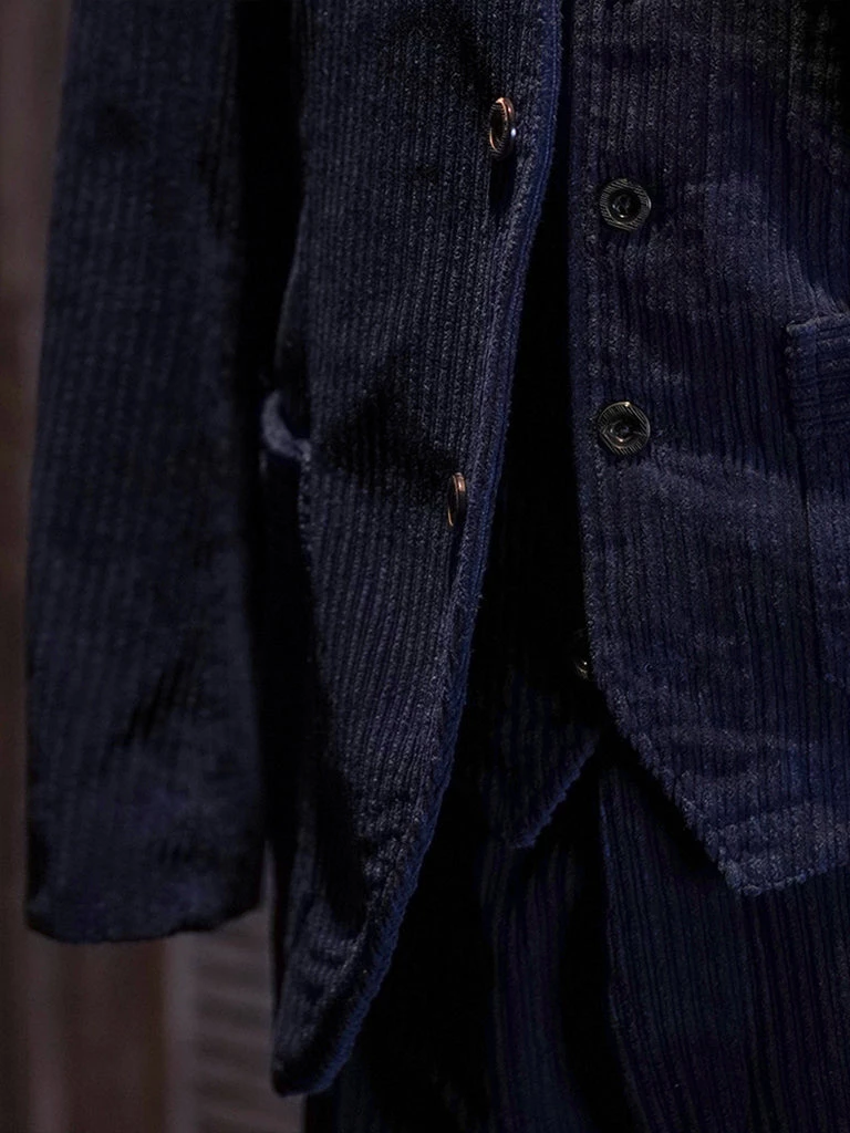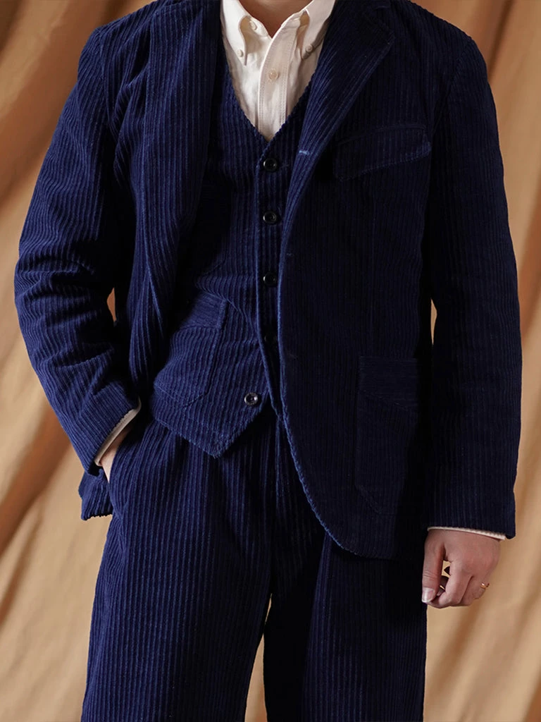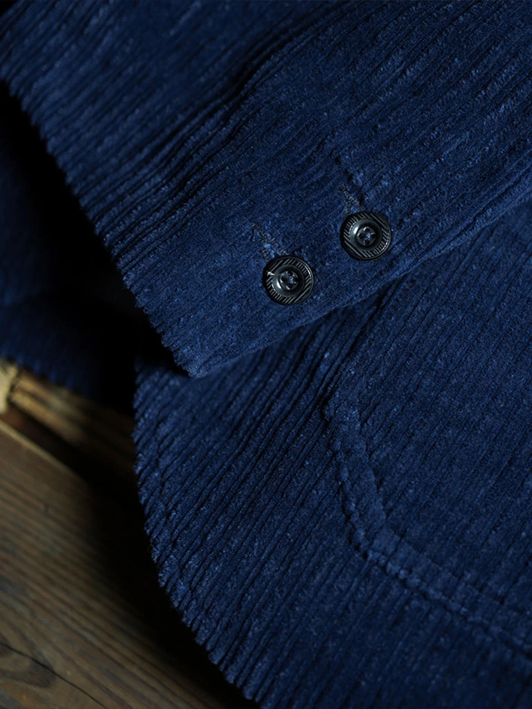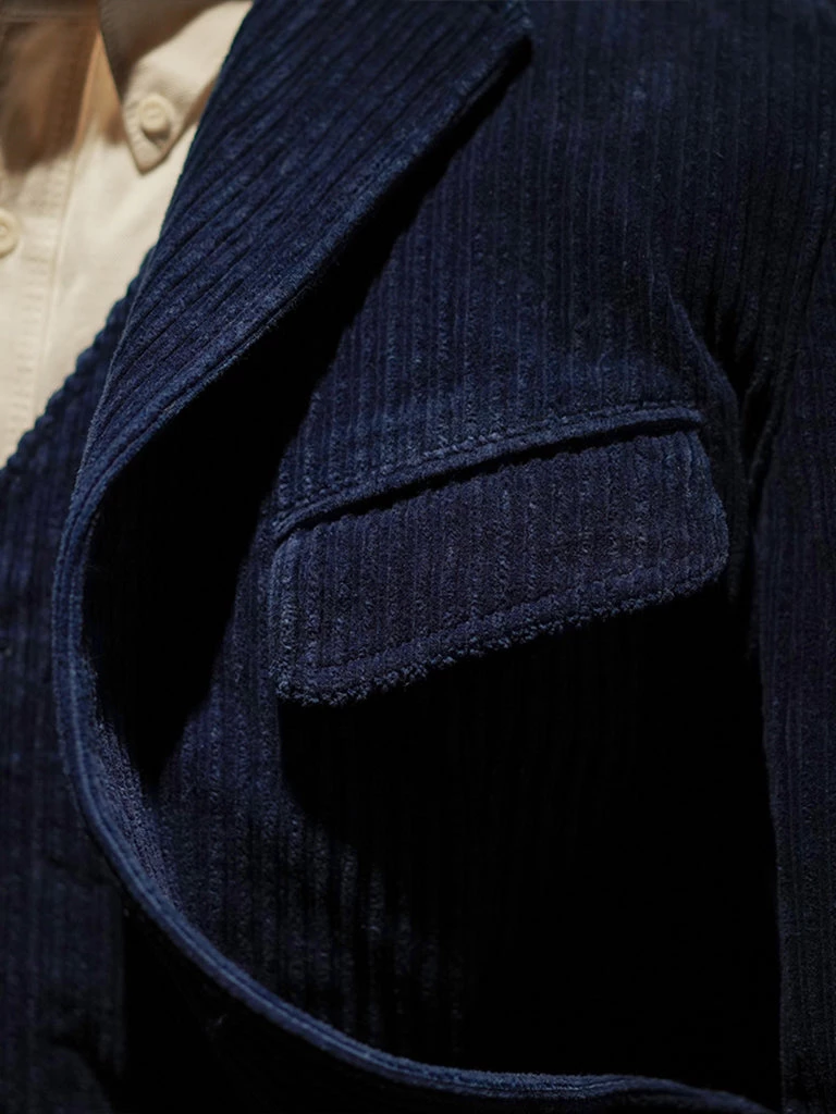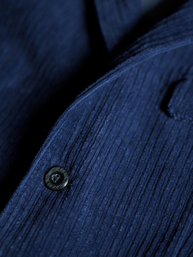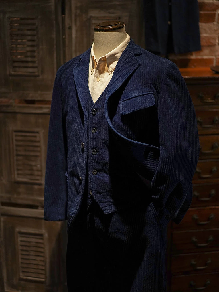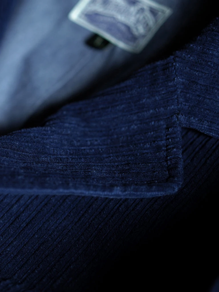 Annual Ring applies the French workwear jacket’s classic design details to the suit, making the original rigorous and staid suit more interesting and suitable for everyday life. The classic indigo-dyed thick and thin stripes corduroy fabric as the primary material, velvet width is different, do not taste. The suede is full and smooth, the lining is high-density chambray cloth, and the Japanese Bemberg cloth is in the sleeve lining. The whole is a structure-free craft, easy to wear and comfortable. Charming pure indigo blue, blue transparent and not rigid, with a long time wearing will develop their own color effect, return to the primitive nature.