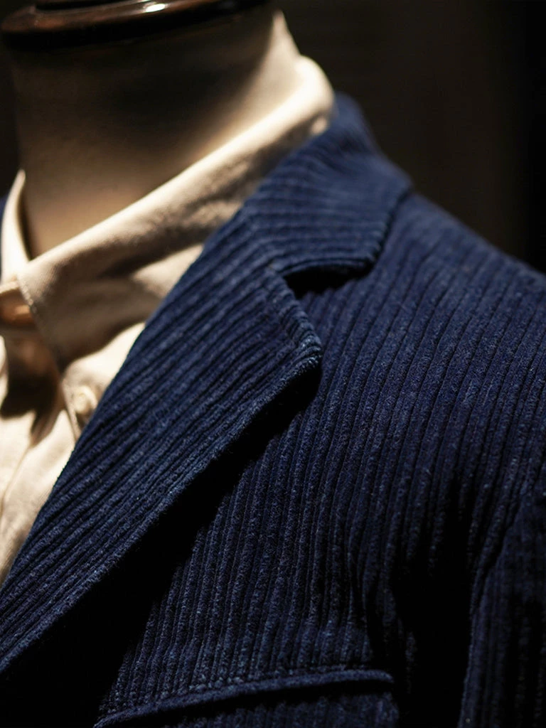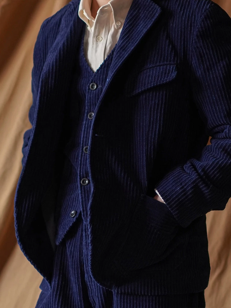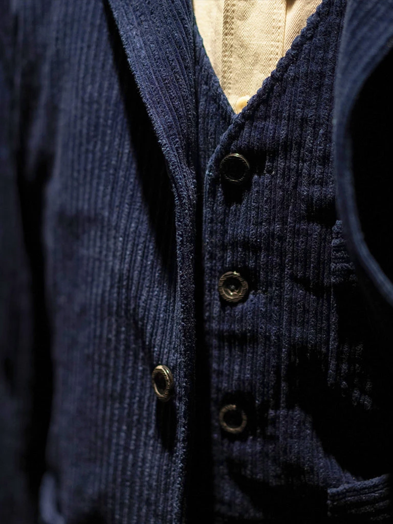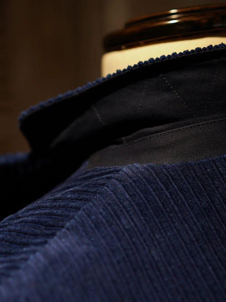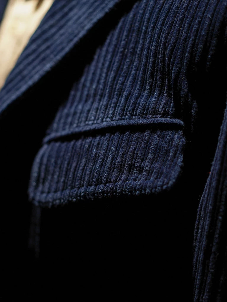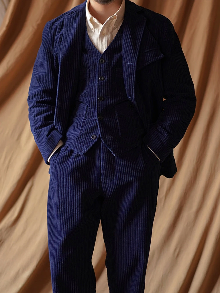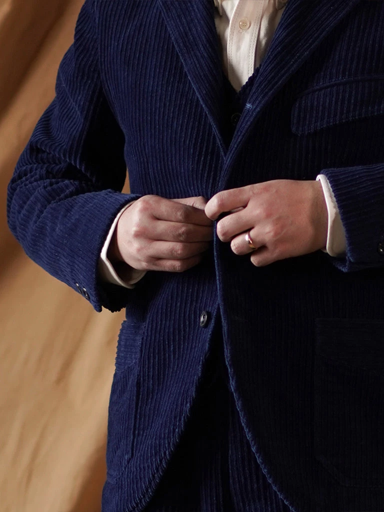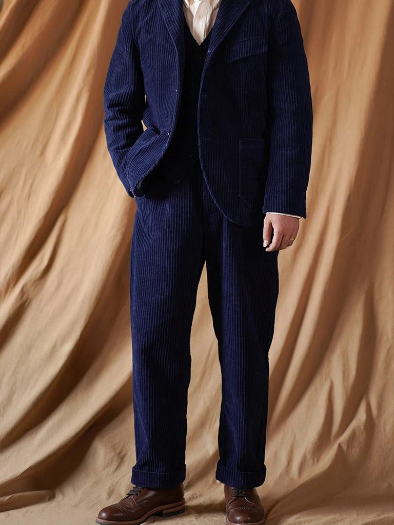 Annual Ring applies the French workwear jacket’s classic design details to the suit, making the original rigorous and staid suit more interesting and suitable for everyday life. The classic indigo-dyed thick and thin stripes corduroy fabric as the primary material, velvet width is different, do not taste. The suede is full and smooth, the lining is high-density chambray cloth, and the Japanese Bemberg cloth is in the sleeve lining. The whole is a structure-free craft, easy to wear and comfortable. Charming pure indigo blue, blue transparent and not rigid, with a long time wearing will develop their own color effect, return to the primitive nature.