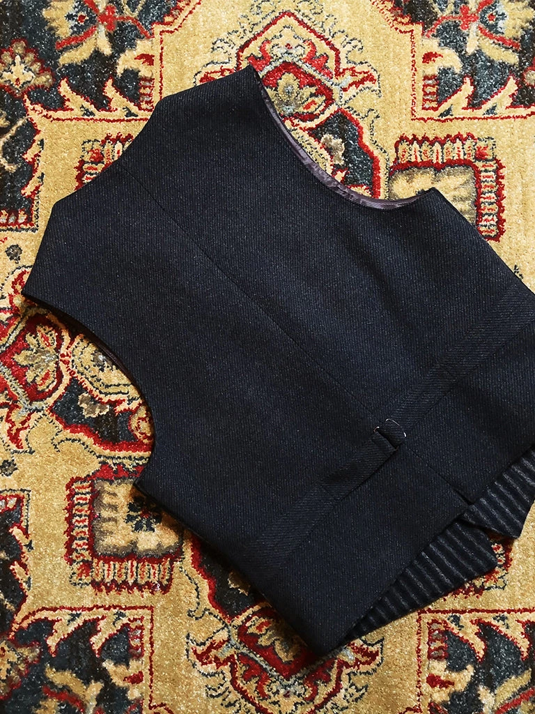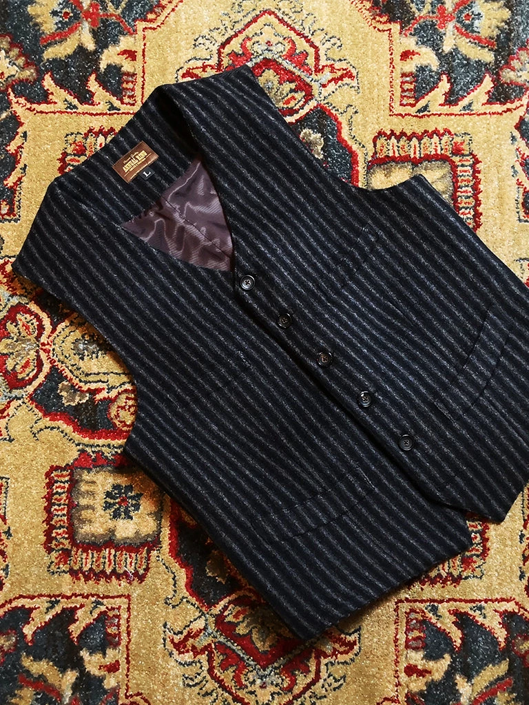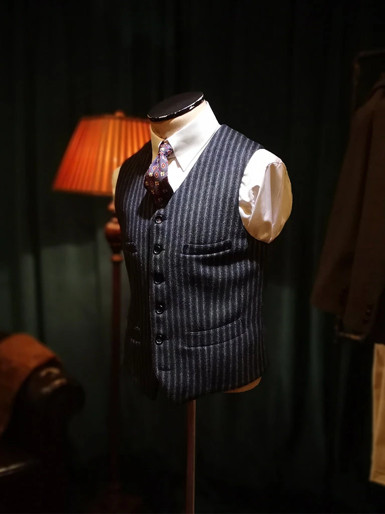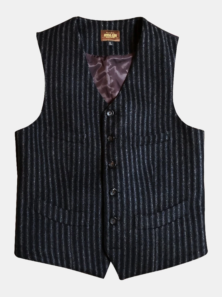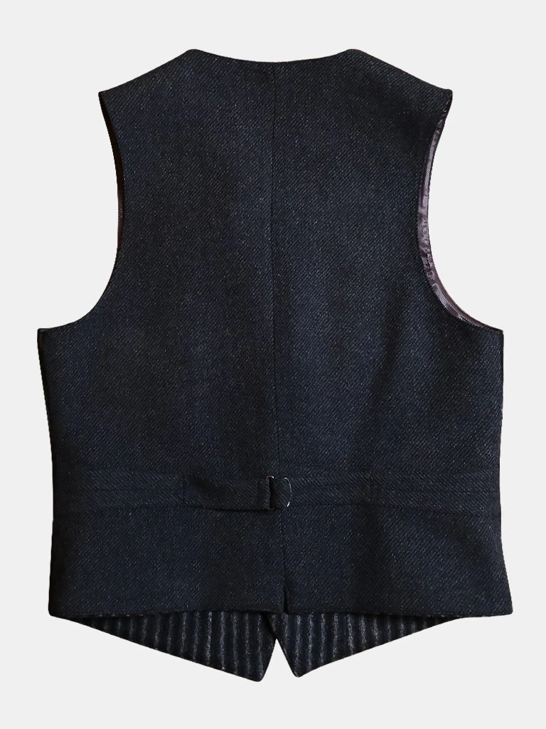Inspired by the vest worn by gentlemen in the early 20th century, made of 18.5 oz. black & white stripe tweed (100% wool) for the front body, and 17 oz. grey twill tweed (80% wool) for the back body, and with natural ox horn buttons, vintage style brass buckle-back.