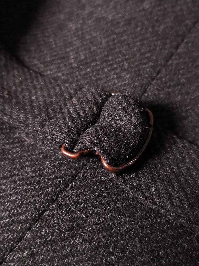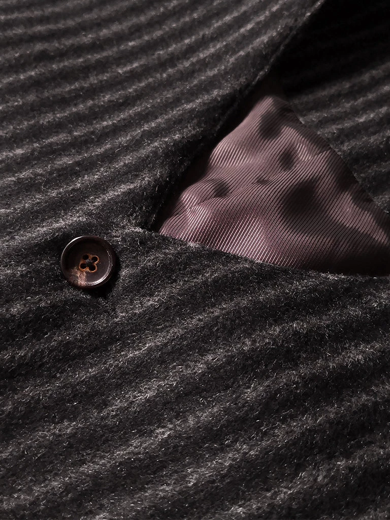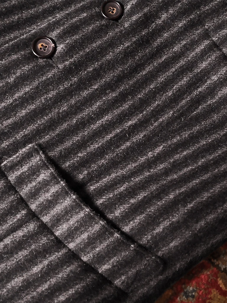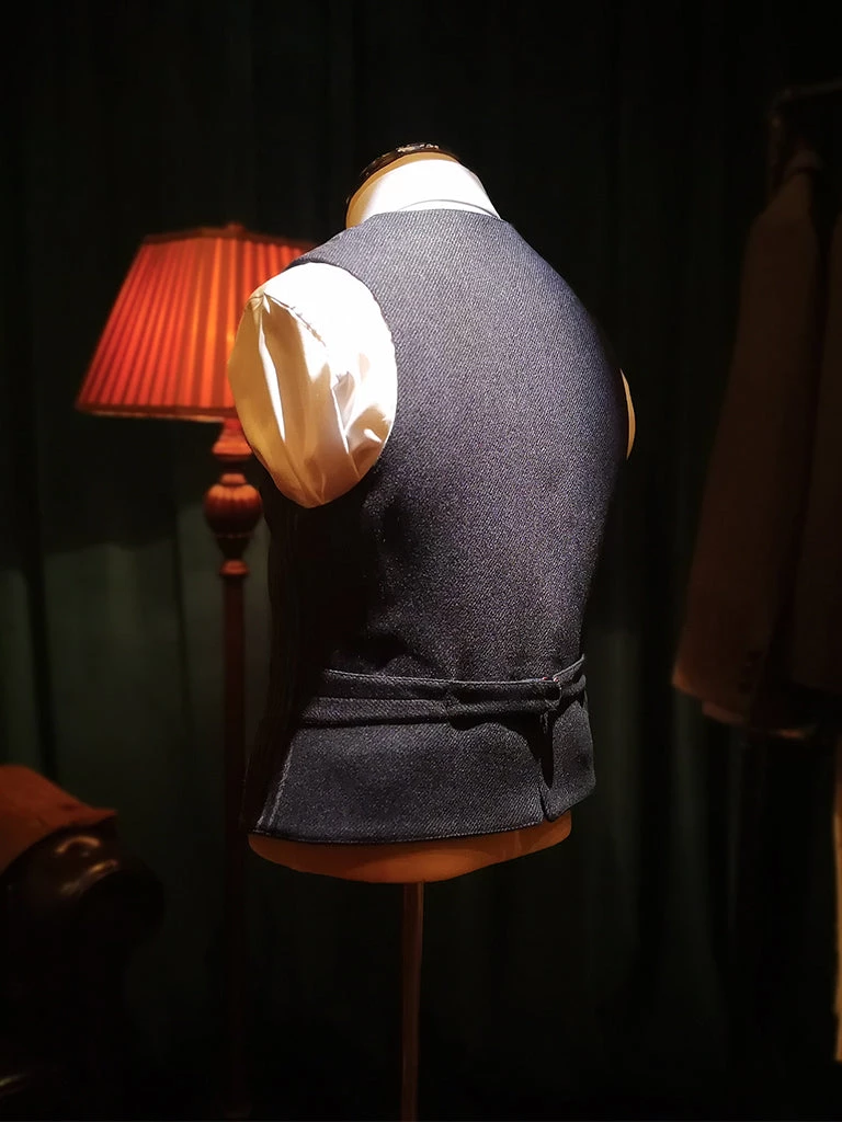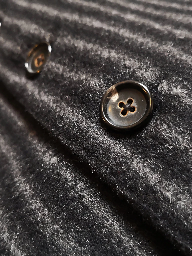 Inspired by the vest worn by gentlemen in the early 20th century, made of 18.5 oz. black & white stripe tweed (100% wool) for the front body, and 17 oz. grey twill tweed (80% wool) for the back body, and with natural ox horn buttons, vintage style brass buckle-back.