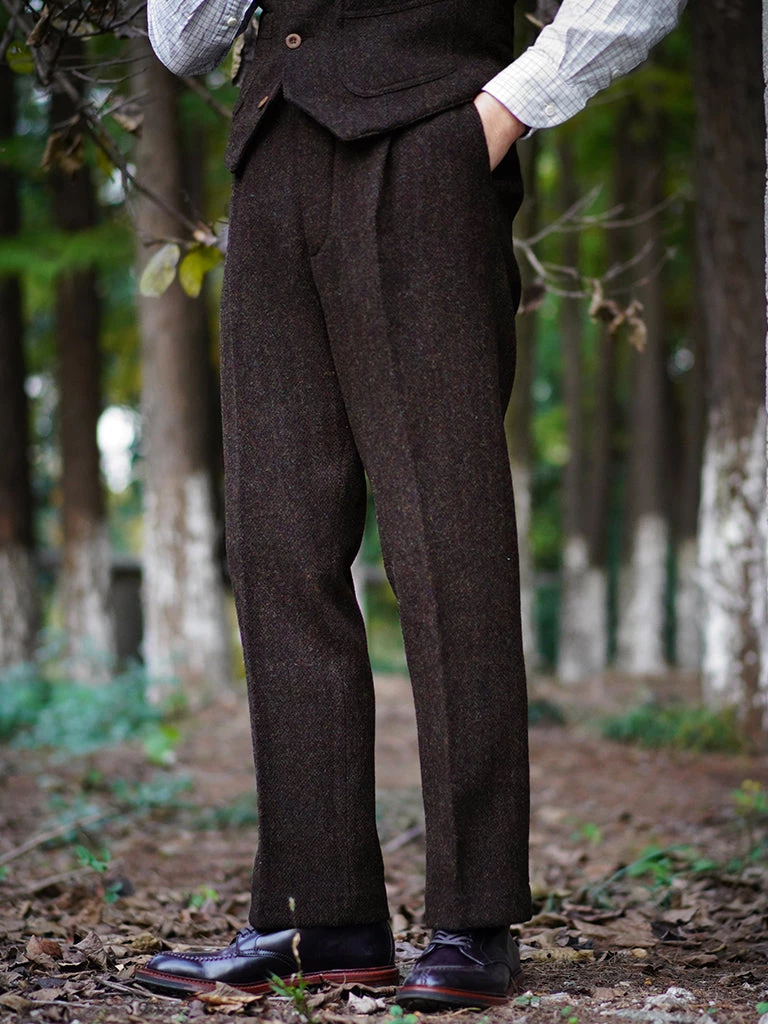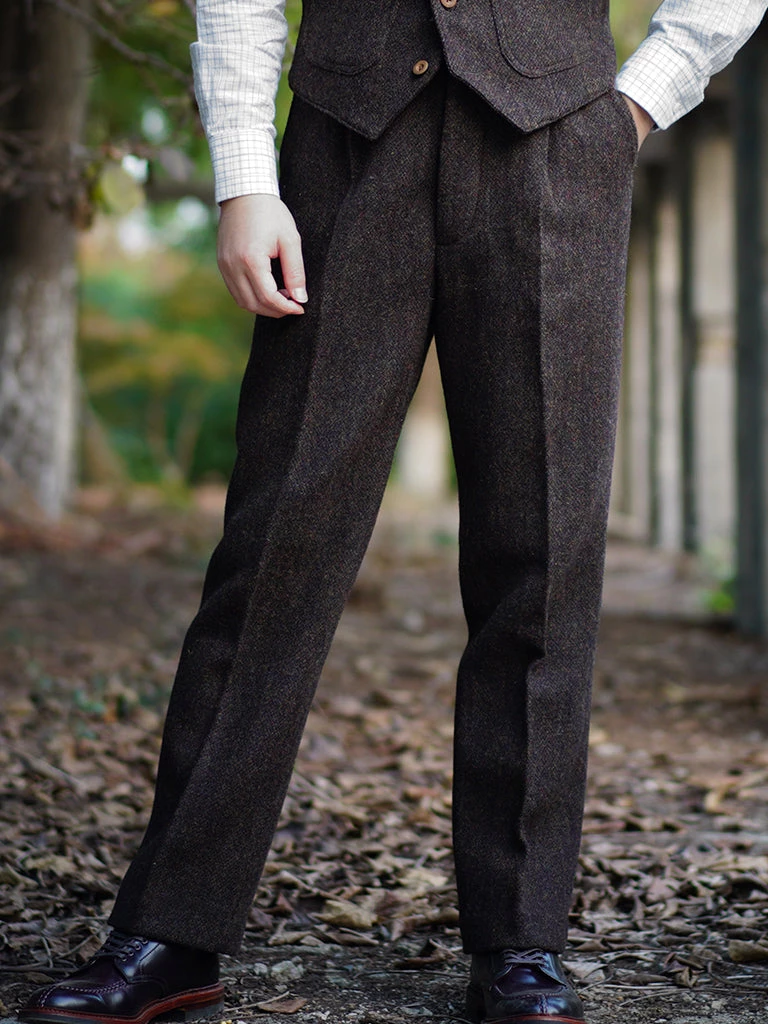 These trousers are based on the classic high-rise trousers worn by gentlemen in the 1920s, retain the looseness of the thigh and calves, straight leg, slightly loose. The small pocket (pocket watch pocket) added below the waist, and the classic details of single pleats, are common features of the 19th – 20th century early. The trousers are a very retro style, and perfect for daily wear.