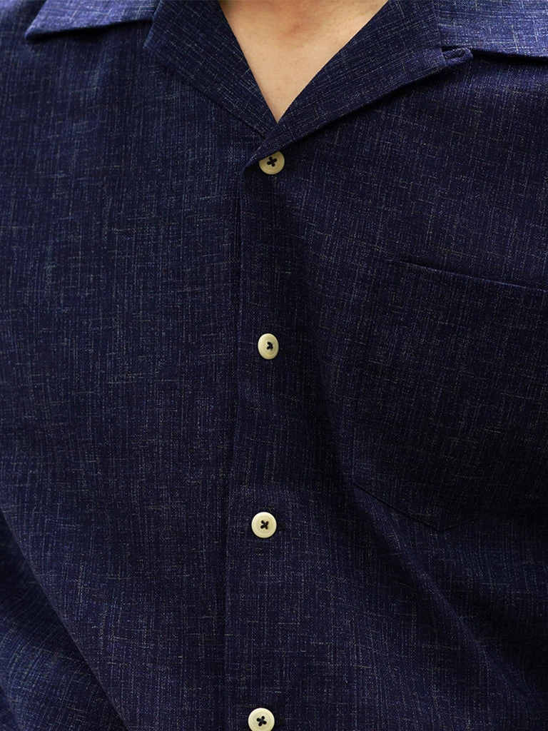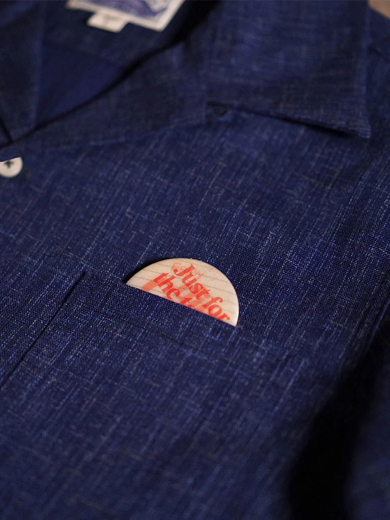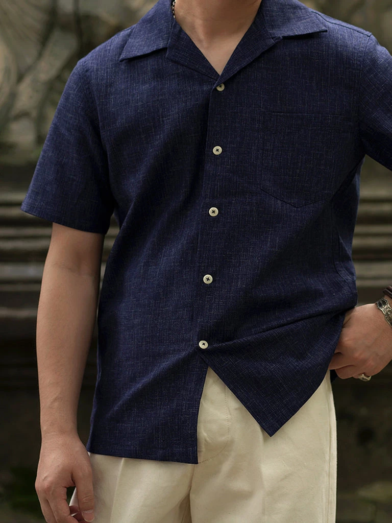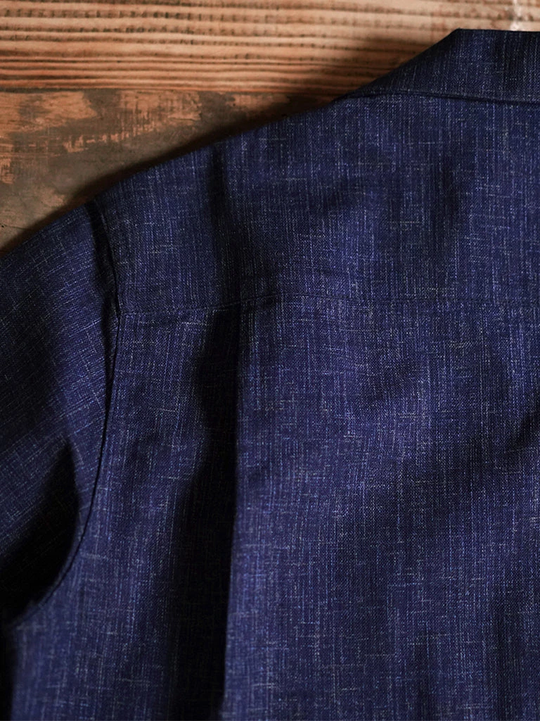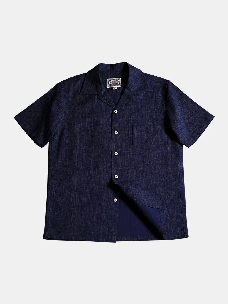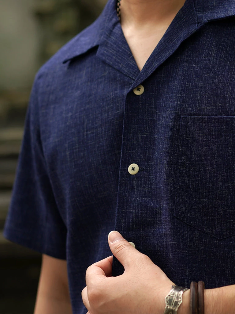 Classic open collar shirt made from Japanese indigo printed cotton fabric. Finished with natural corozo buttons.