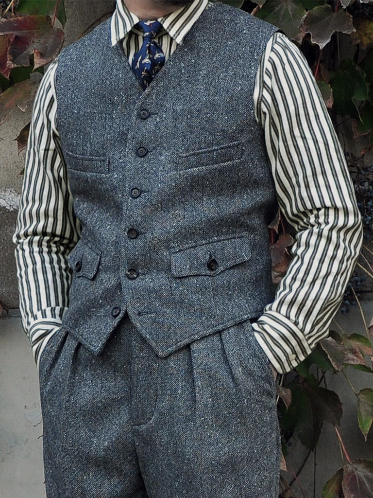 Unlike common gentleman vests, hunting vests pay more attention to practicality. In the scarcity era, people wouldn’t spend more money to use high-quality fabrics for the back of the waistcoat, but chose cheaper linen, cotton or lining. In terms of color, the back material will be used the contrasting color than the front, so that the exposed back will not look cheap after taking off the jacket. The traditional hunting vest pays attention to practicality. In order to keep warm when hunting in the cold and humid season, thick and wear-resistant fabrics with better warmth are used for both front and back, and there are multiple large pockets to store more items.
