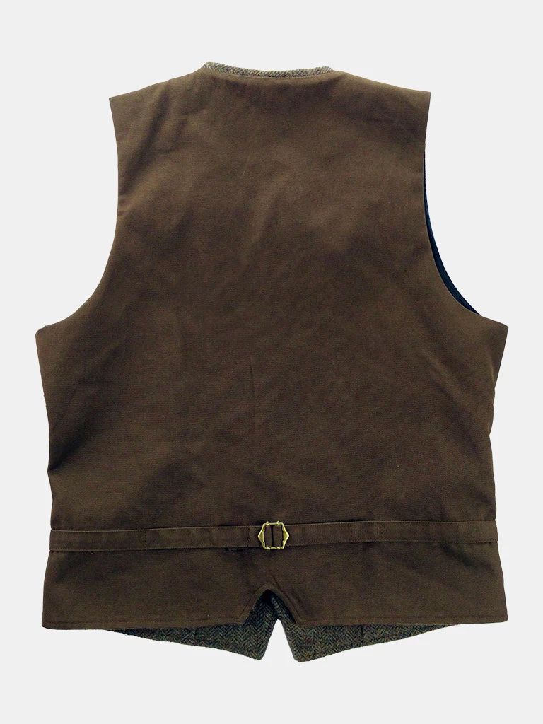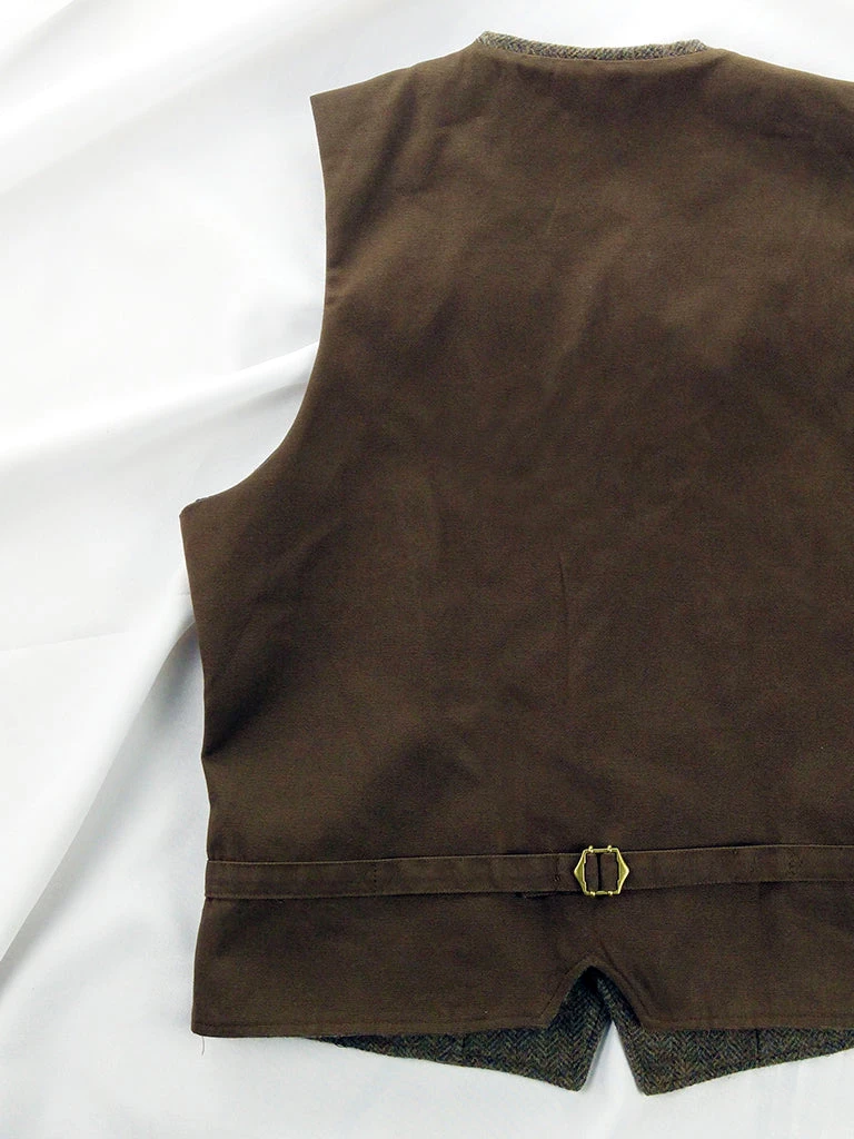 This waistcoat is based on the British and American waistcoats from the late 19th century to the early 20th century and improved the cutting and silhouette, made of 480g tweed on the front, 11oz Martin fabric on the back, and with hand-woven cowhide buttons, Antique style brass buckle-back.