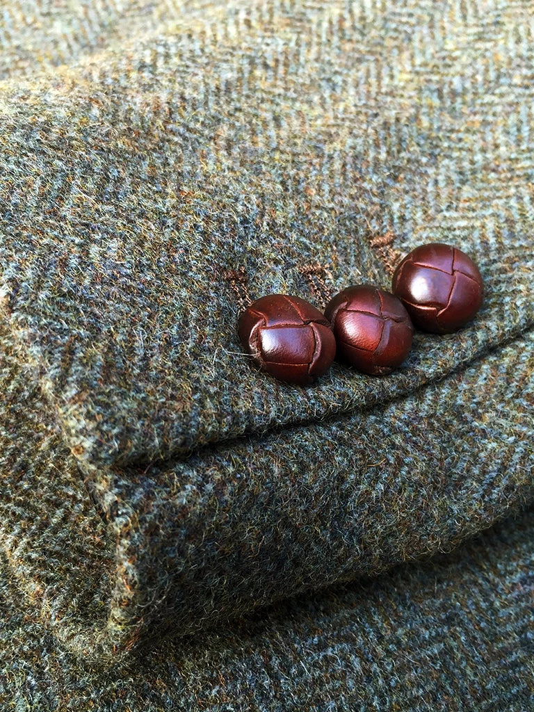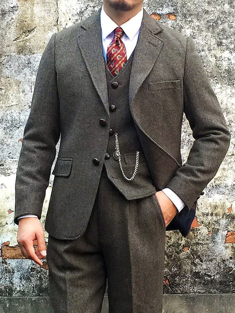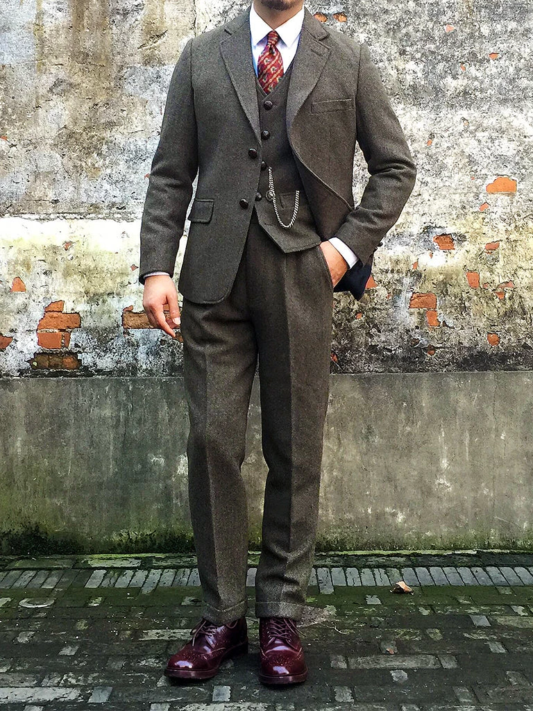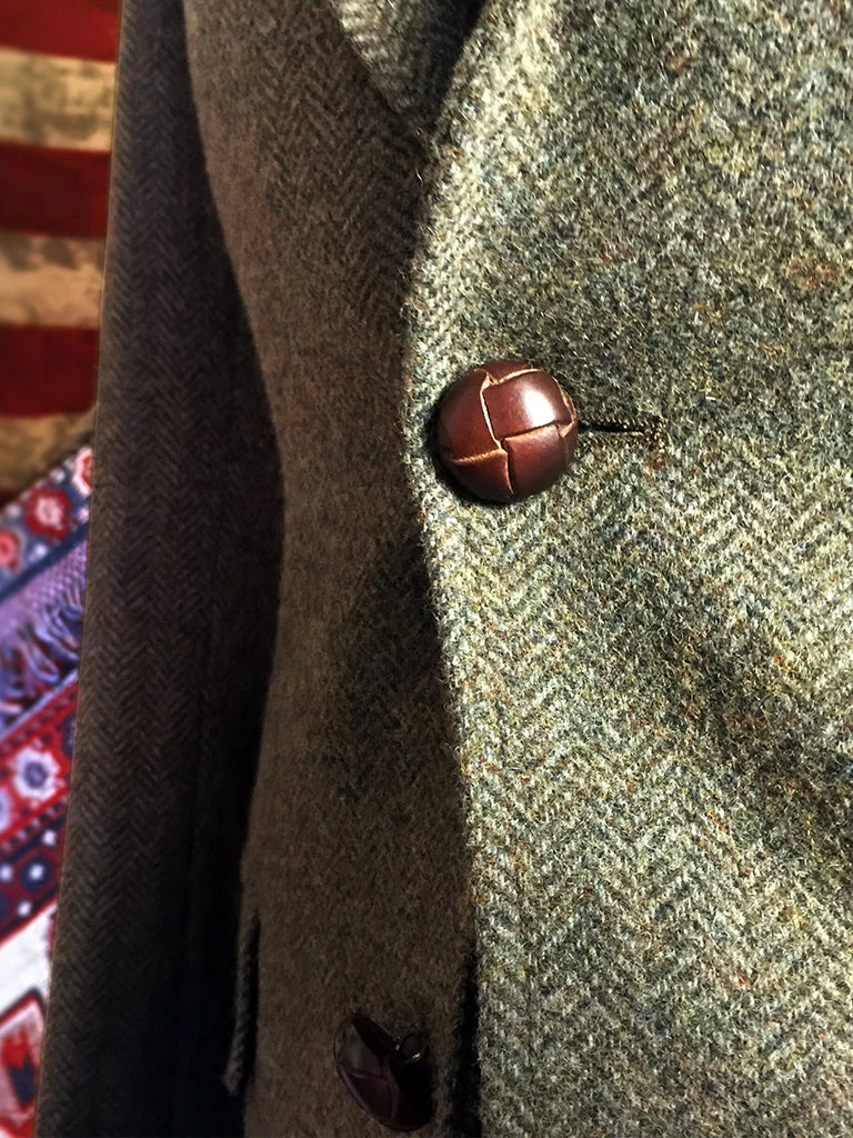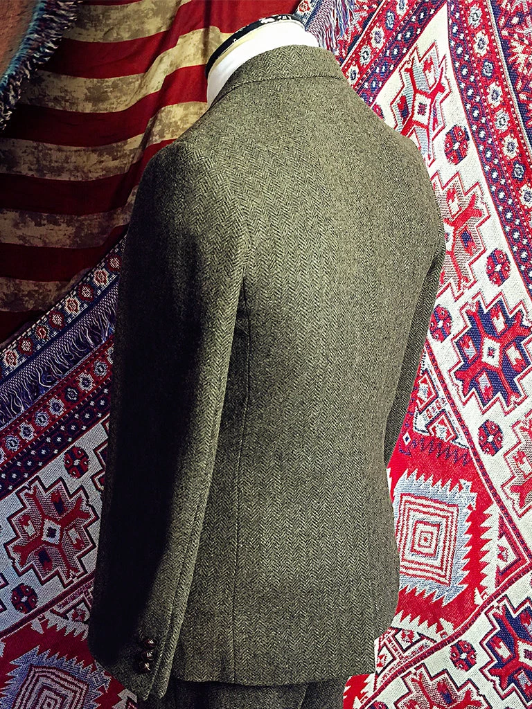 This suit jacket is based on the classic American style suit jacket after the 1920s, a single row of two-button (hand-woven cowhide buttons), two patch pockets with flap, single vent, made of 17.5 oz. tweed.
