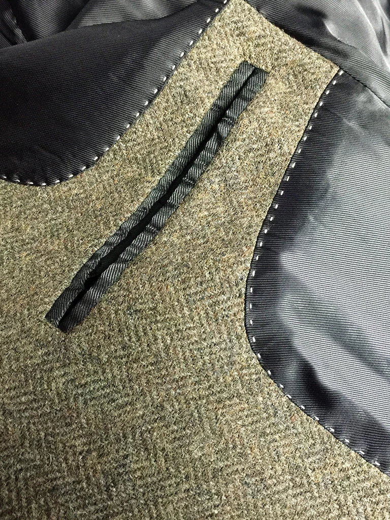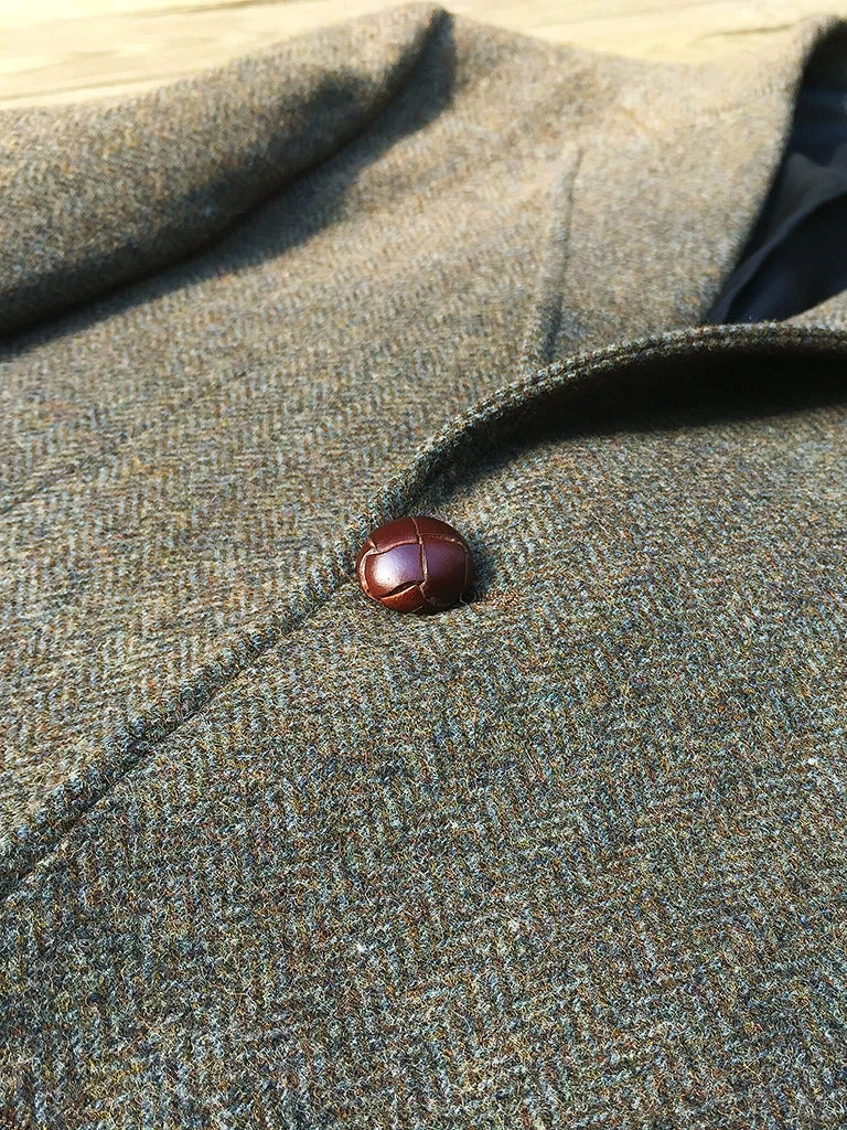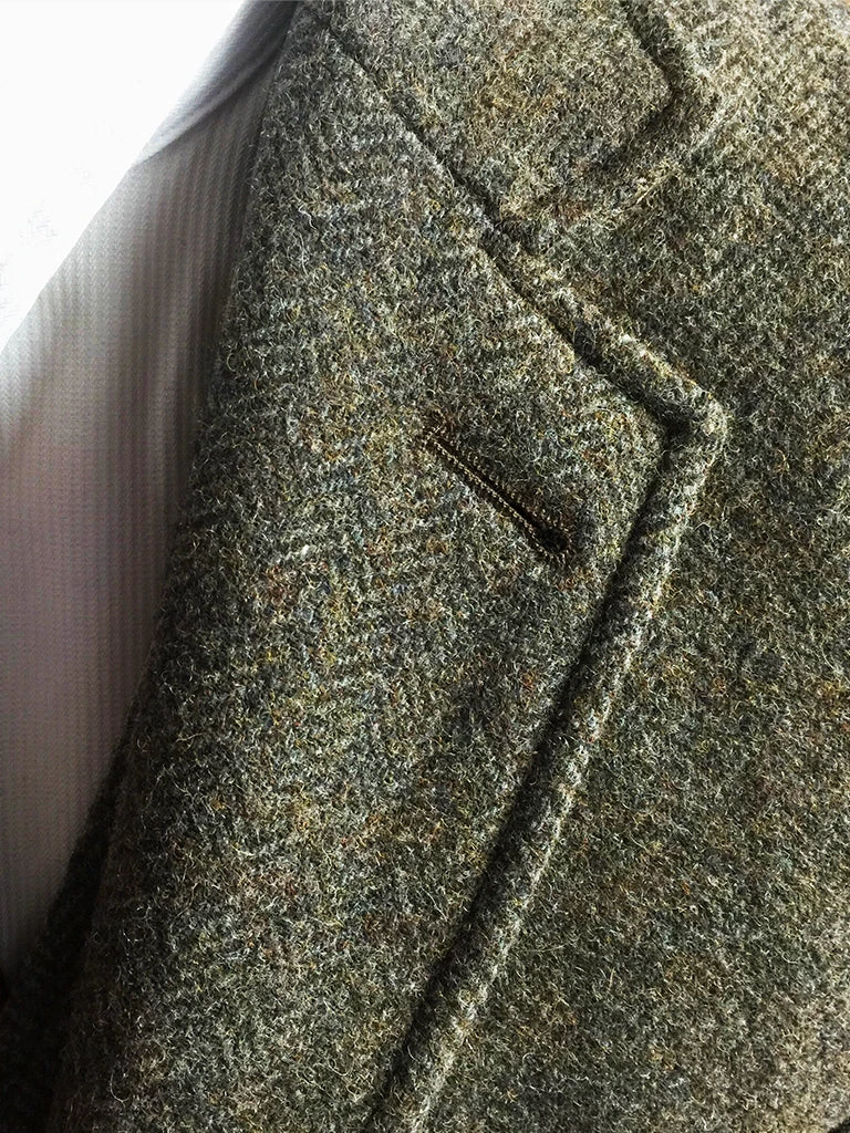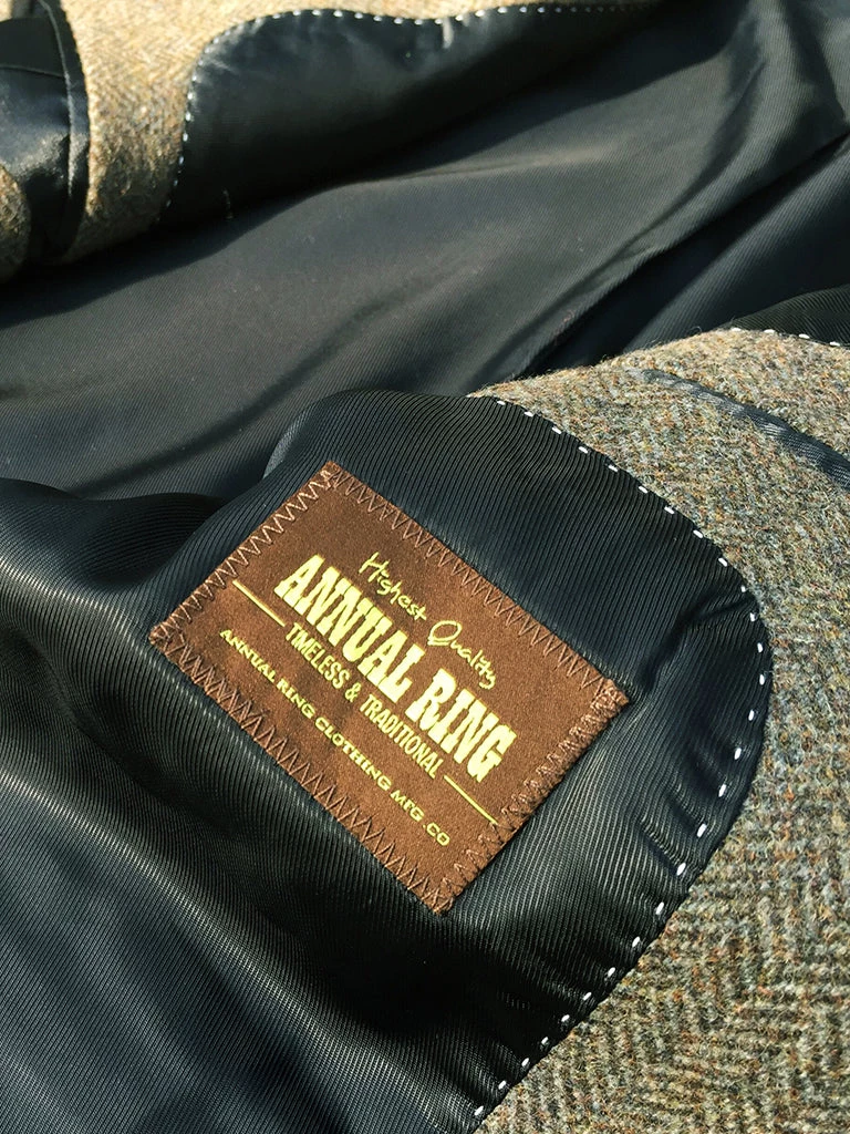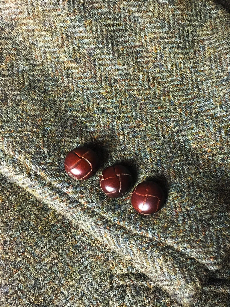This suit jacket is based on the classic American style suit jacket after the 1920s, a single row of two-button (hand-woven cowhide buttons), two patch pockets with flap, single vent, made of 17.5 oz. tweed.
