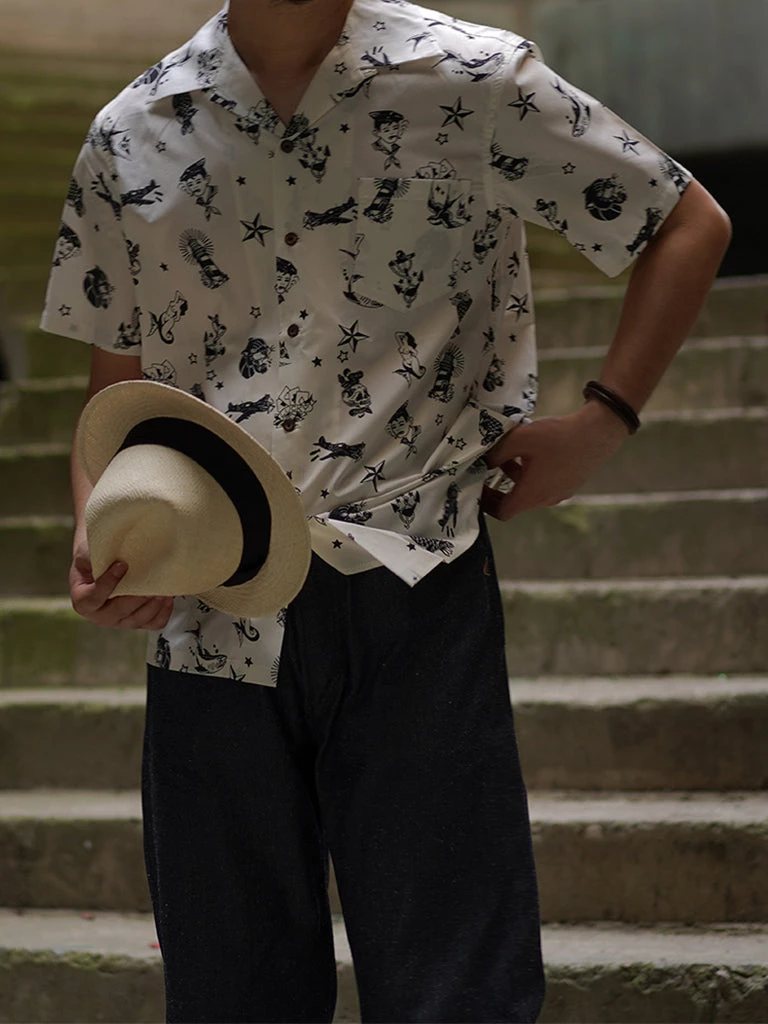 The Hawaiian shirts with vintage tattoo design as the theme, Annual Ring team looking for all kinds of books and the old data, choosing a representative mermaid, petrel, black panther, knives, and other interesting and meaningful 1900-1950s the retro tattoo, chose lyocell fibers and cotton blended fabric, cool air, good drape effect, and with natural coconut buttons, Each one is hand-polished and engraved with a unique pattern, very characteristic.