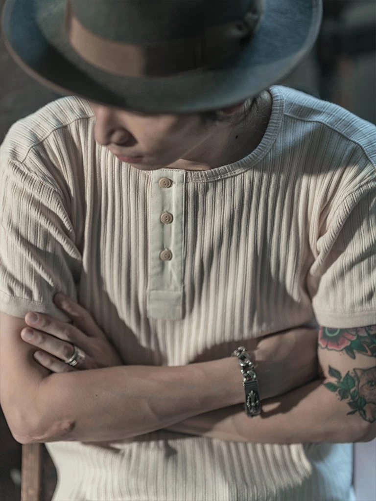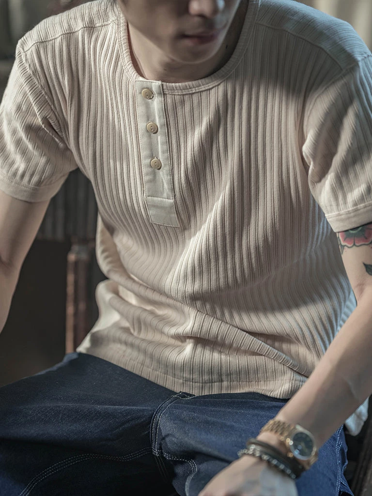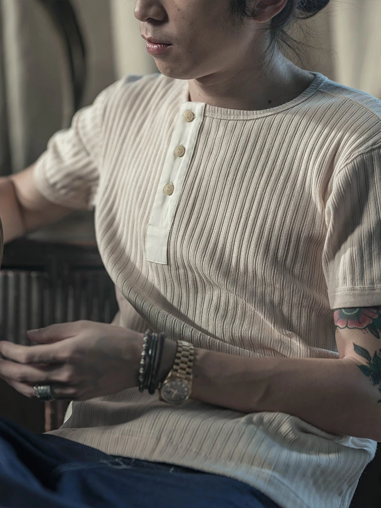 This Henley T-shirt is made of a unique wale ribbed cotton fabric. The fabric has excellent ductility, It’s soft-touch and is comfortable to wear, but the elasticity of the fabric is not tight. After wearing it for some time, it will feel roomier and return to normal after washing. This T-shirt has been garment washed, so it will not shrink after washing.