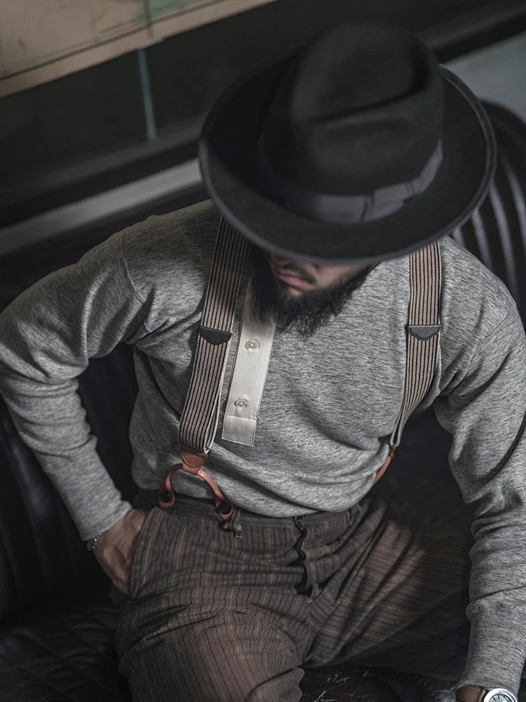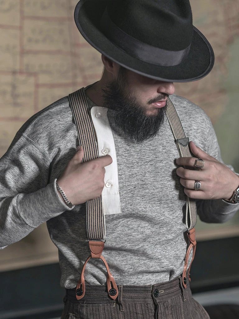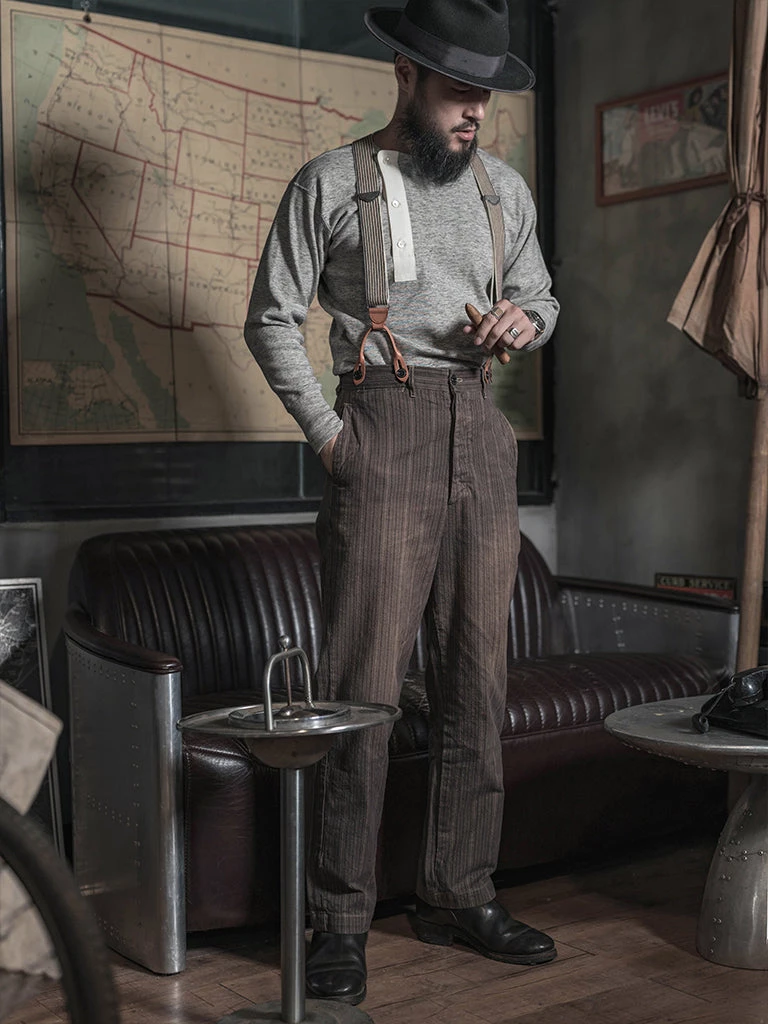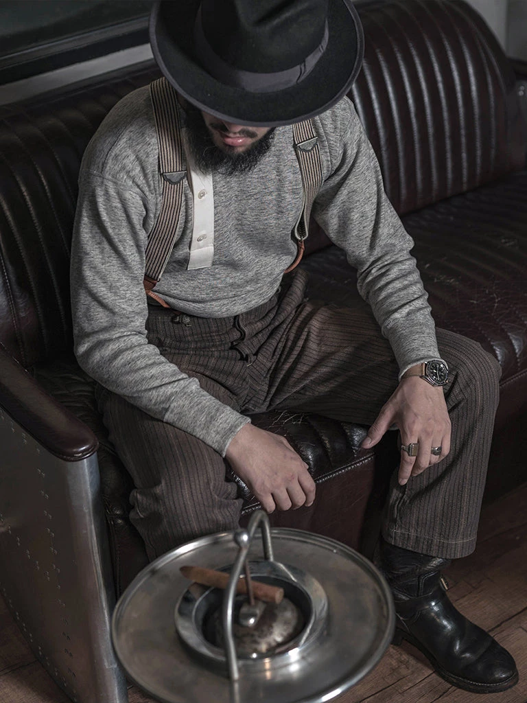 This Henry t-shirt is made of heavyweight cotton thread fabric. According to old-time underwear standards, with four-needle six lines sewing, it’s very comfortable to wear. It’s a broad shoulder cut and a threaded hem, appears in an inverted triangle, flatter the figure even more. It works well with old-style suspenders, denim overalls, military pants, and various overalls and military coats.