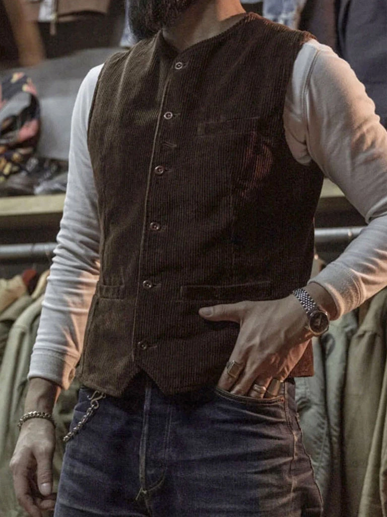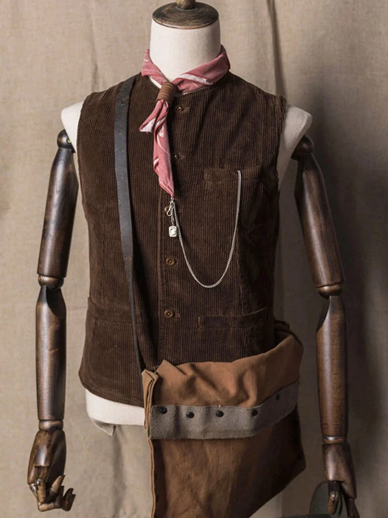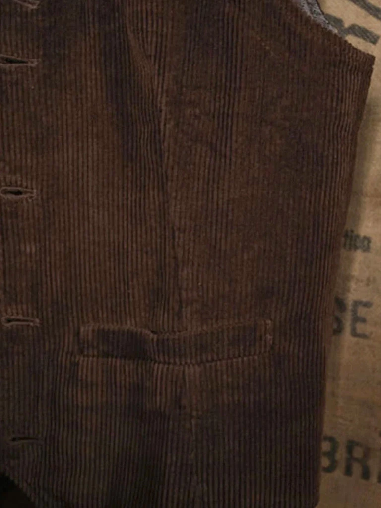 This corduroy vest is based on the European immigrant vest of the 1910s. It reproduces the elegance of early casual wear. It adopts the design of the old-time vest with three pockets, the retro stripe linen/cotton fabric lining, and the waistline is just right. There is no BUCKLE on the back, so it is convenient to match other close-fitting jackets. The overall tailoring is fitted. You can wear it alone or with a coat.