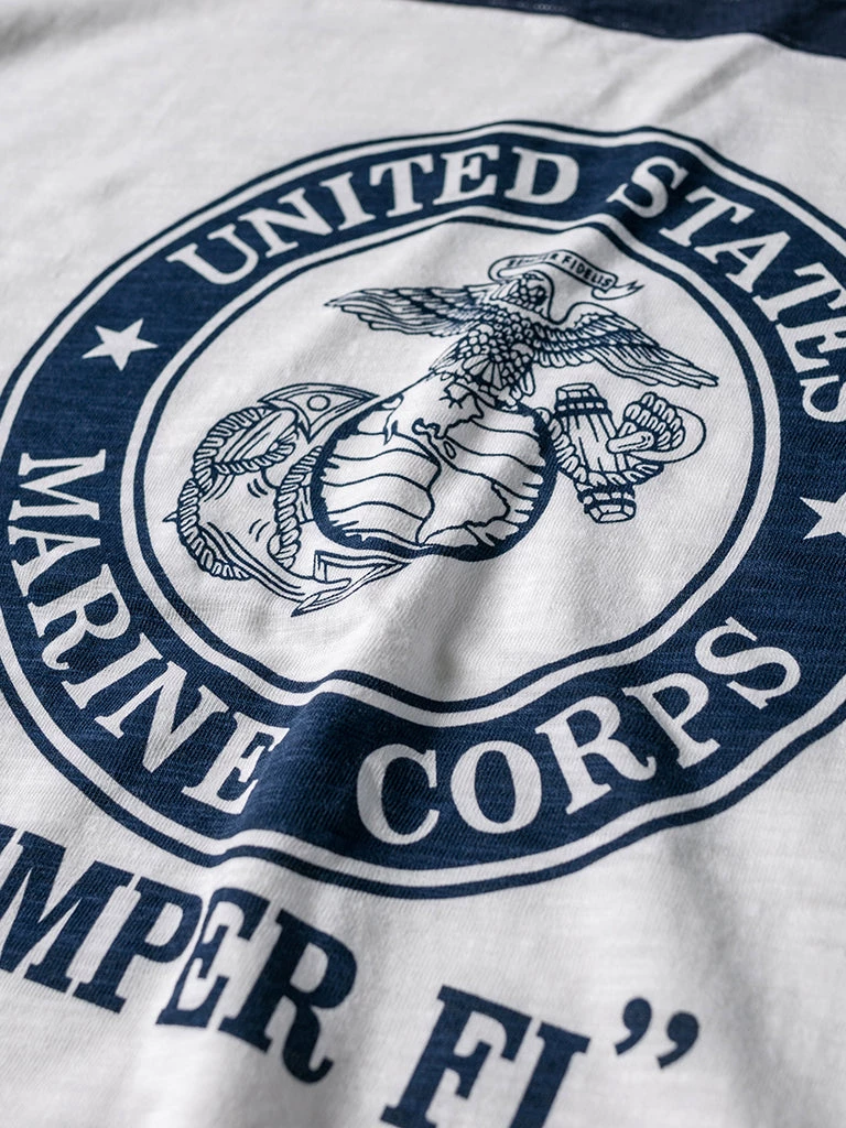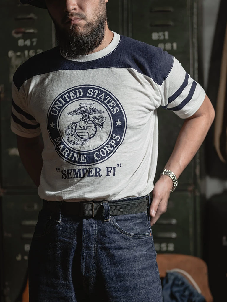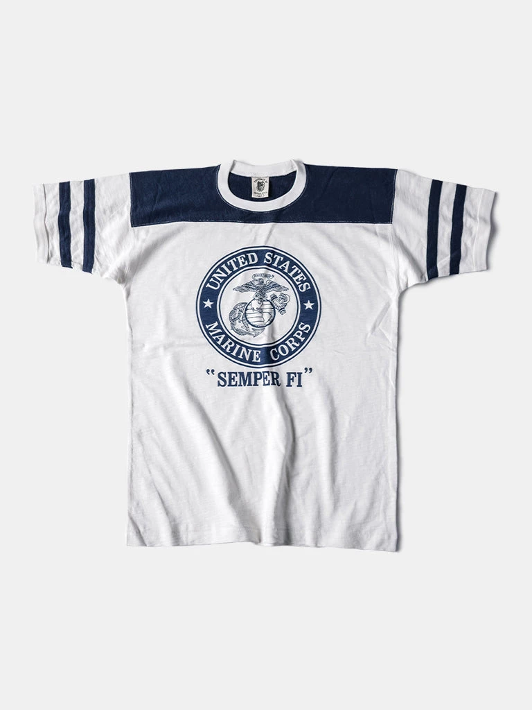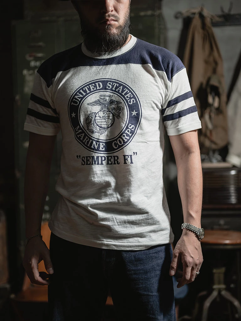 This t-shirt prototype taken from a 1970-1980s vintage USMC t-shirt. It adopts the exterior features of a football t-shirt, with the USMC logo and “SEMPER FI” print on the front. Cut from about 6.2 oz (175 gsm) slub yarn fabric with good air permeability and moisture absorption. It is not only suitable for daily wear but also for sports wear.