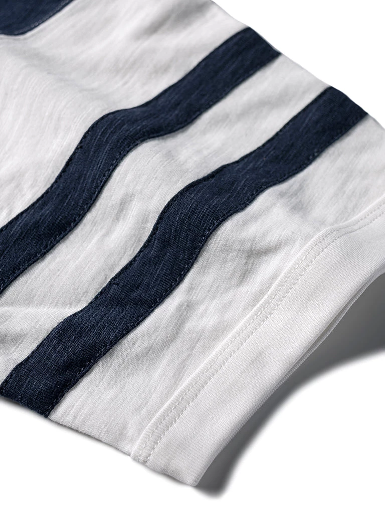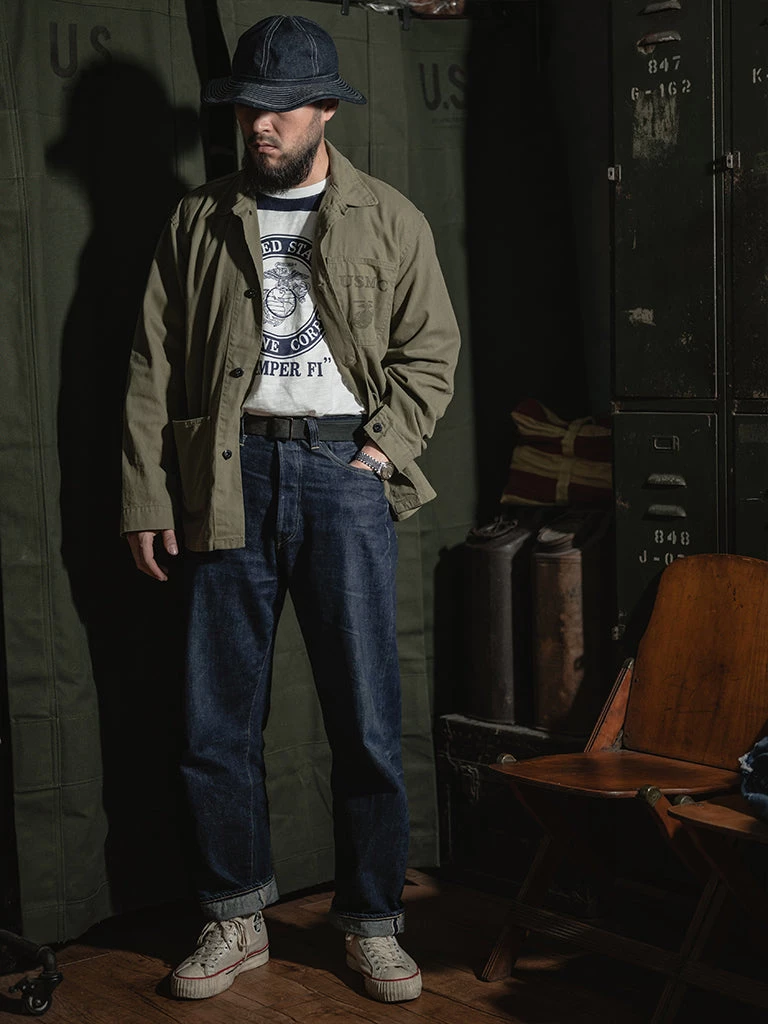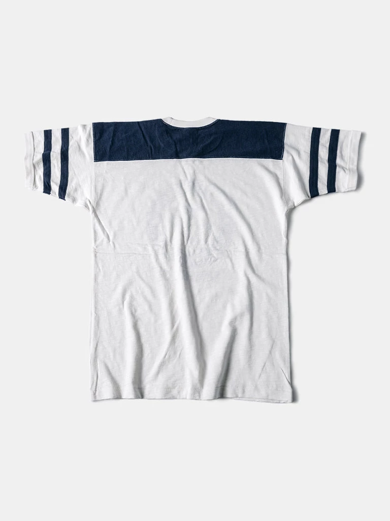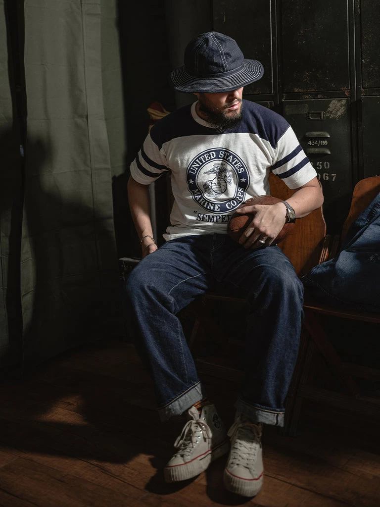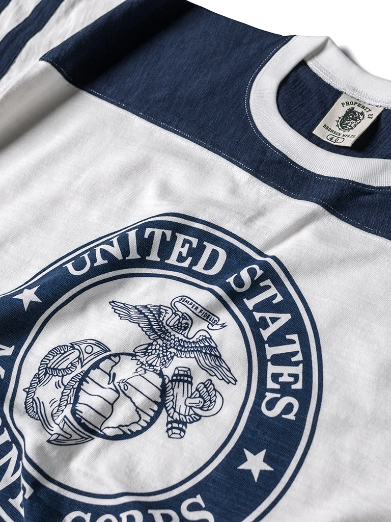 This t-shirt prototype taken from a 1970-1980s vintage USMC t-shirt. It adopts the exterior features of a football t-shirt, with the USMC logo and “SEMPER FI” print on the front. Cut from about 6.2 oz (175 gsm) slub yarn fabric with good air permeability and moisture absorption. It is not only suitable for daily wear but also for sports wear.