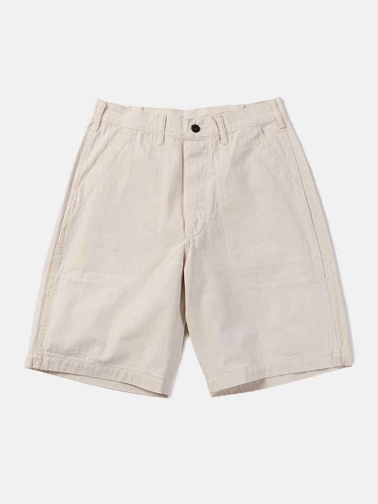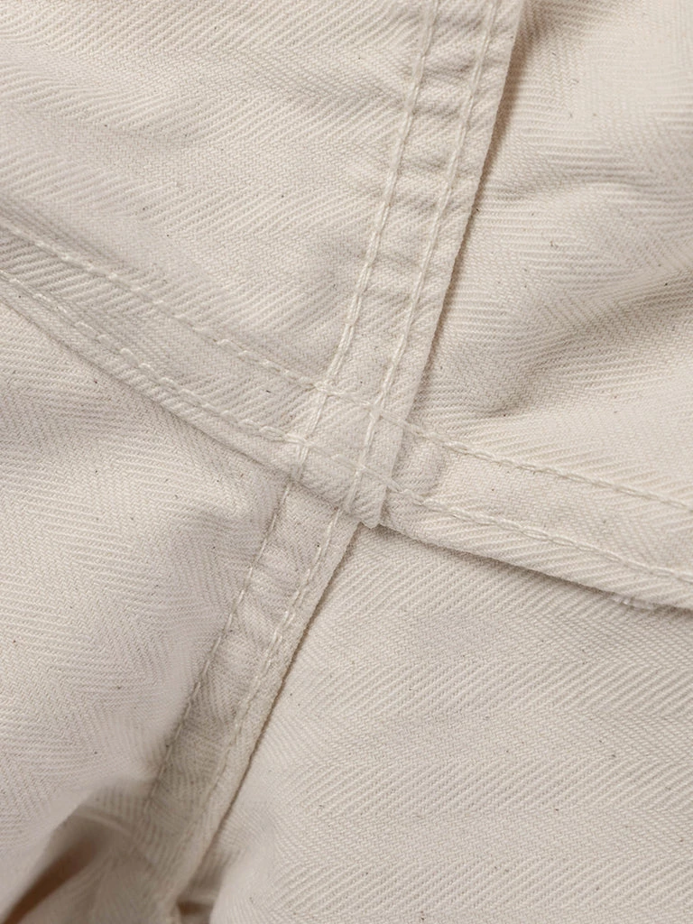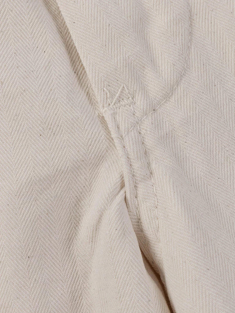 Based on the 1940s deck work pants, made of 12 oz herringbone twill (HBT) cloth. Because it is a greige fabric, there are cottonseed particles on the surface. It is a high waist, and loose straight cut, as the original version. It uses cotton thread sewing, has been a garment wash, will not shrink.