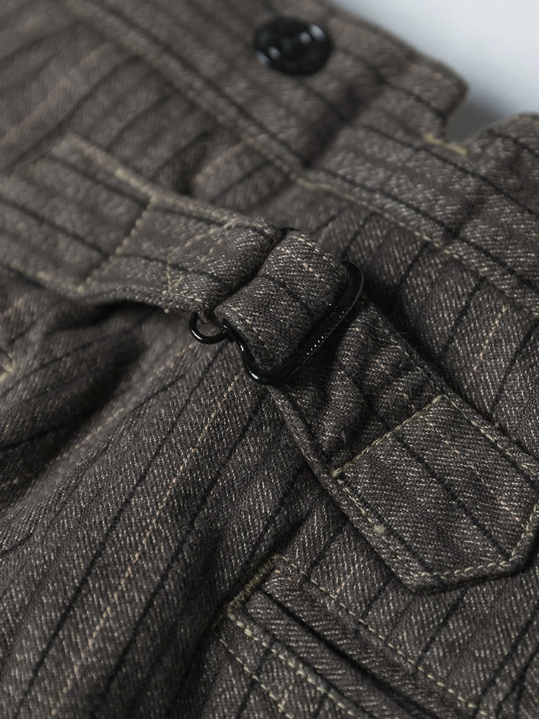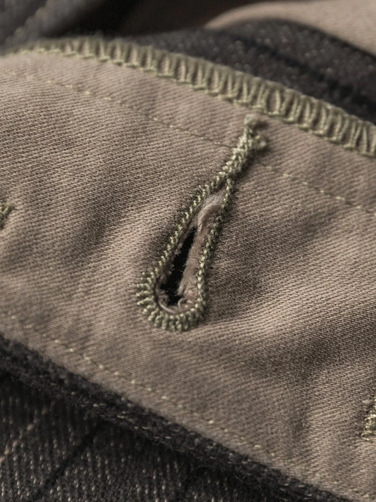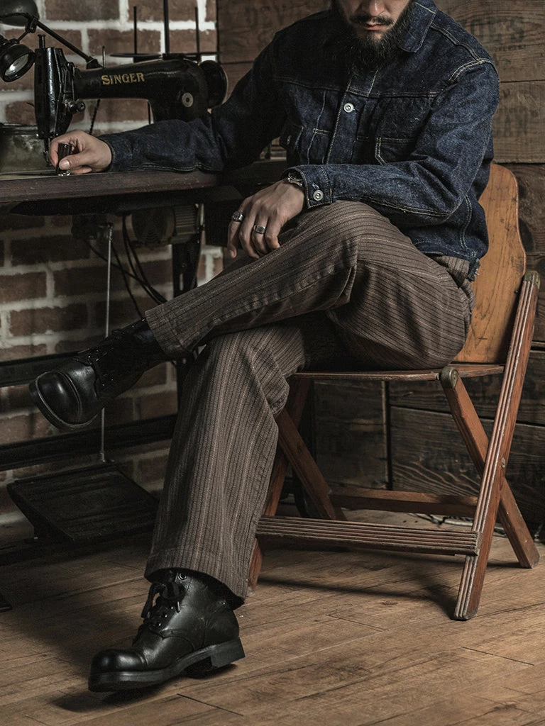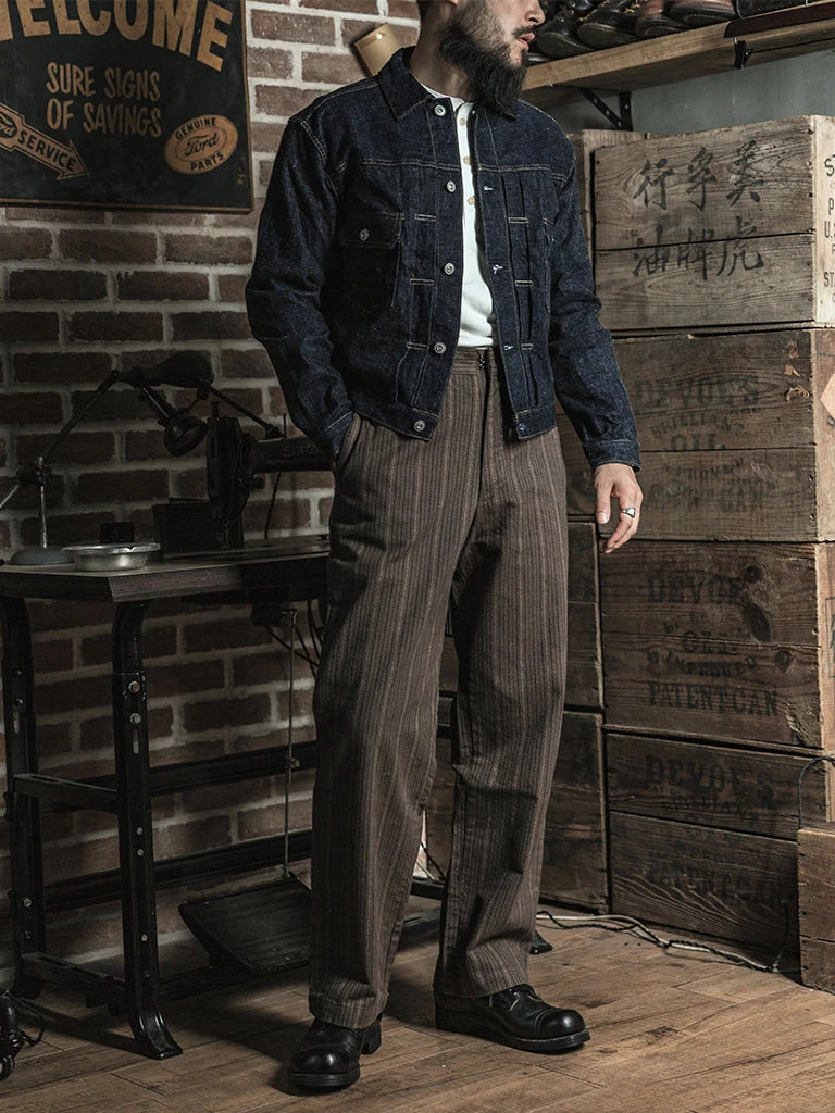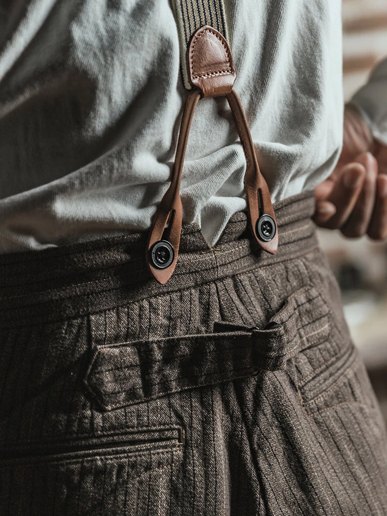 This prototype is taken from the daily pants of the European immigrants in the old times. Most of these trousers lack “YOKE”; there is no triangle stitching cut under the back waist. The waist of the trousers has buttons that can be used to tie the suspender, and there is an adjustment belt in the middle of the back waist to adjust the waist and hip circumference. It’s also called “Buckled back.” From the 1920s, belt loops appeared on trousers’ waist, waist buttons became dispensable, and buckle back was also at stake. By the mid-1930s, buckled back was also abandoned by workwear brands,such as Levis, and since then, it has gradually disappeared in the sight of the public.