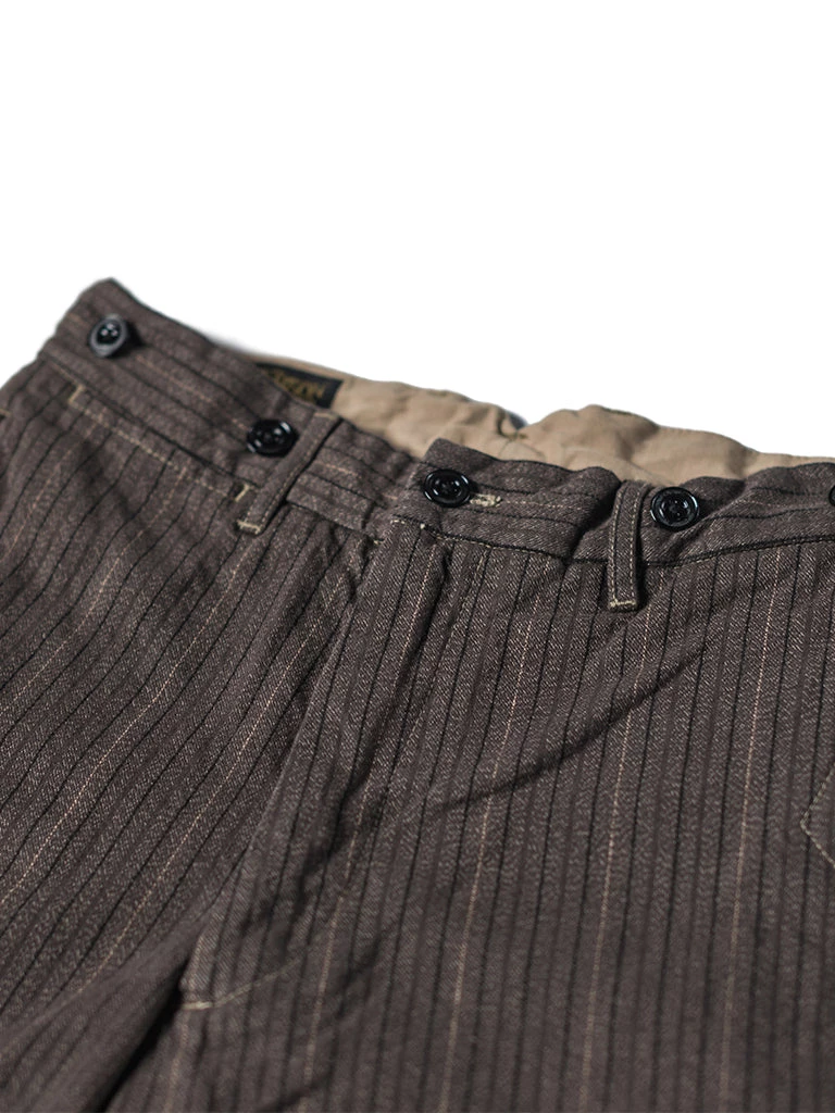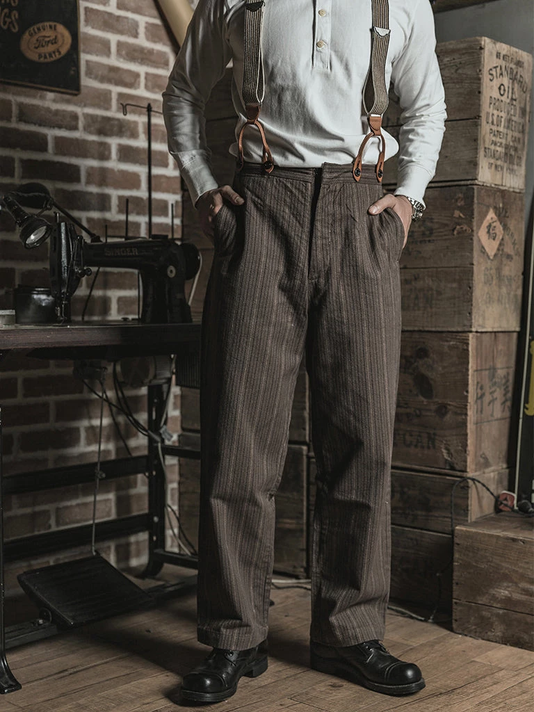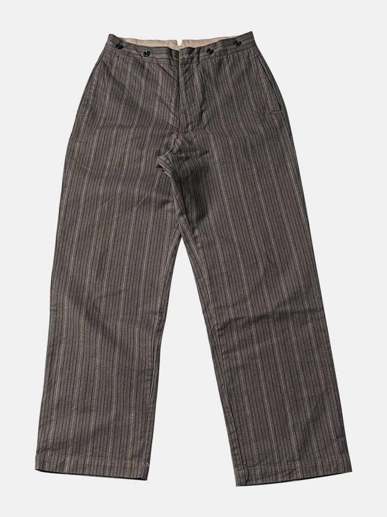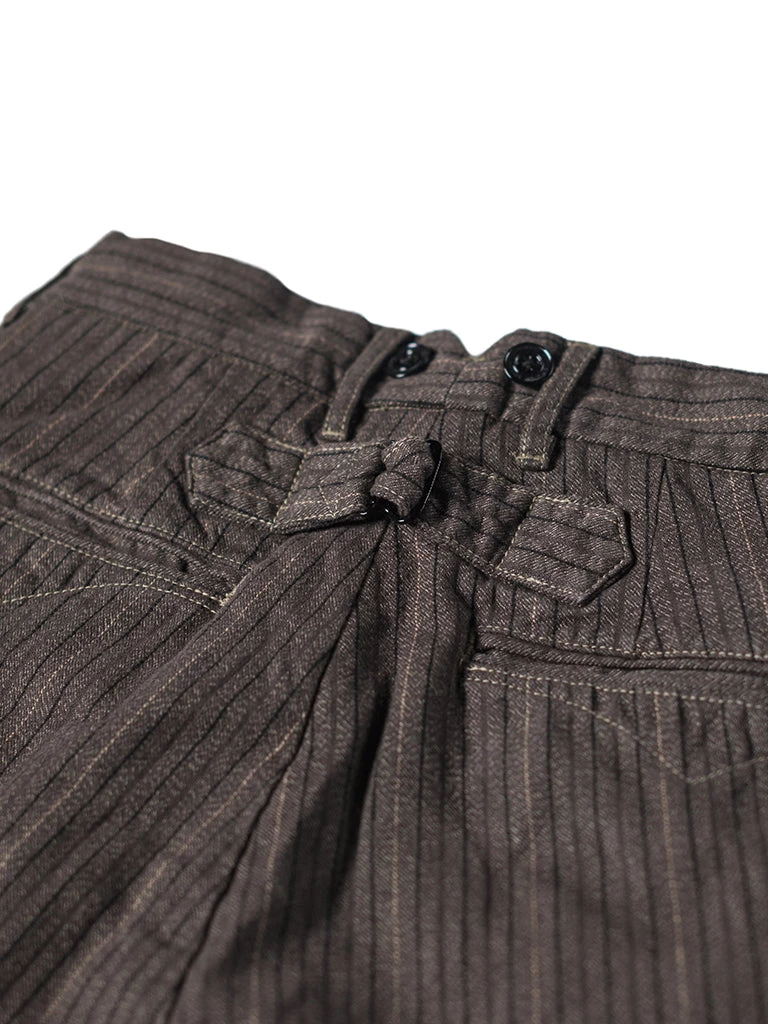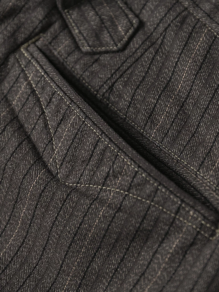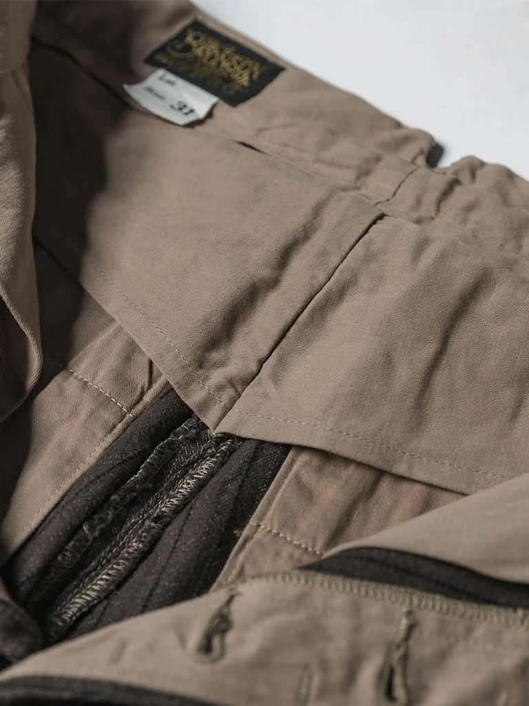 This prototype is taken from the daily pants of the European immigrants in the old times. Most of these trousers lack “YOKE”; there is no triangle stitching cut under the back waist. The waist of the trousers has buttons that can be used to tie the suspender, and there is an adjustment belt in the middle of the back waist to adjust the waist and hip circumference. It’s also called “Buckled back.” From the 1920s, belt loops appeared on trousers’ waist, waist buttons became dispensable, and buckle back was also at stake. By the mid-1930s, buckled back was also abandoned by workwear brands,such as Levis, and since then, it has gradually disappeared in the sight of the public.