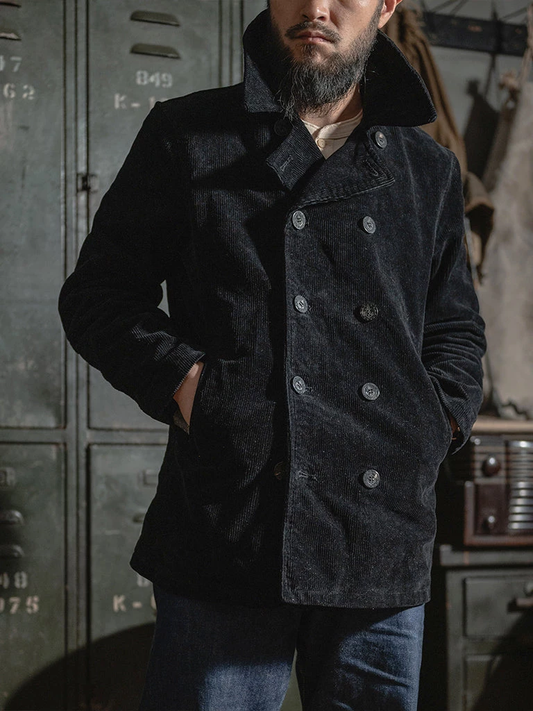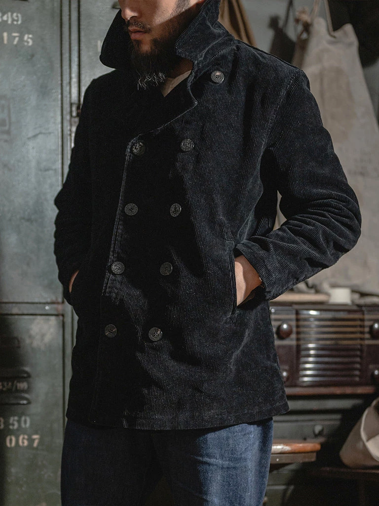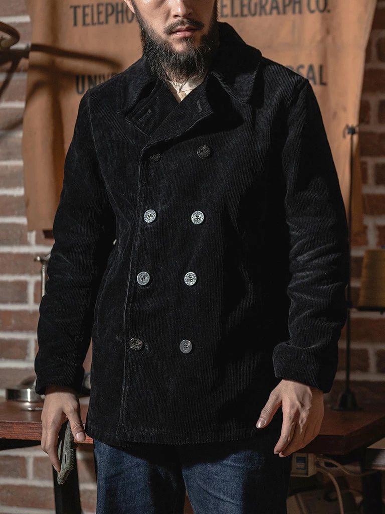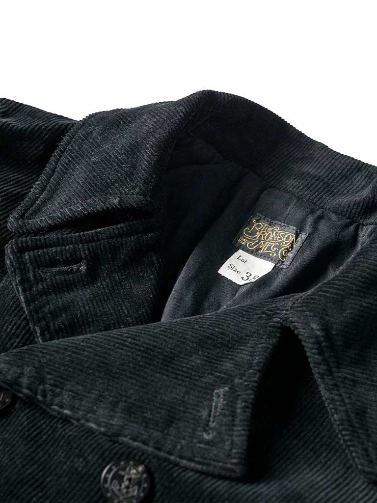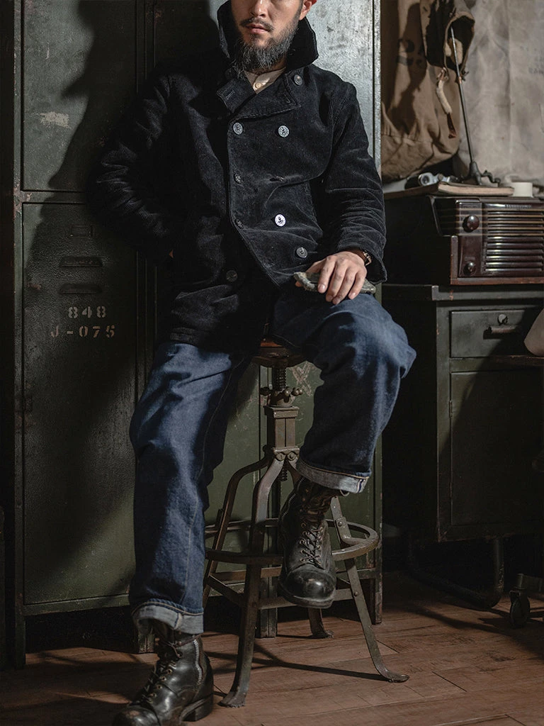 Bronson’s this peacoat is Based on a vintage “Montgomery” double-breasted peacoat from the late 1930s, it is made of custom-made heavy corduroy, and the fabric is crisp and reproduces the large lapel with a slight arc in the old time, which can easily create a standing collar style. The classic 10-button style, and the simple diagonal pocket are used to warm hands, and the natural horn button is used to create a retro atmosphere. The black cotton satin material is used in the interior, making it smooth and easy to wear and take off.
