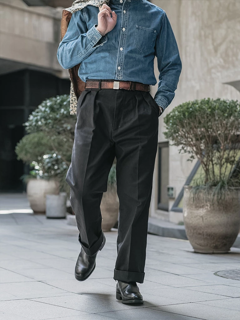 Custom-made heavyweight fabric, extremely thick twill fabric, weight up to 420gsm, about 15~16 oz, heavier than ordinary jeans. Because of the excellent texture, the sense of hanging and shaping forces is extreme.