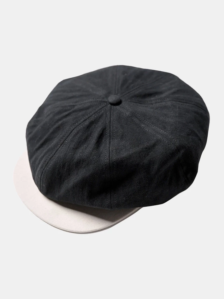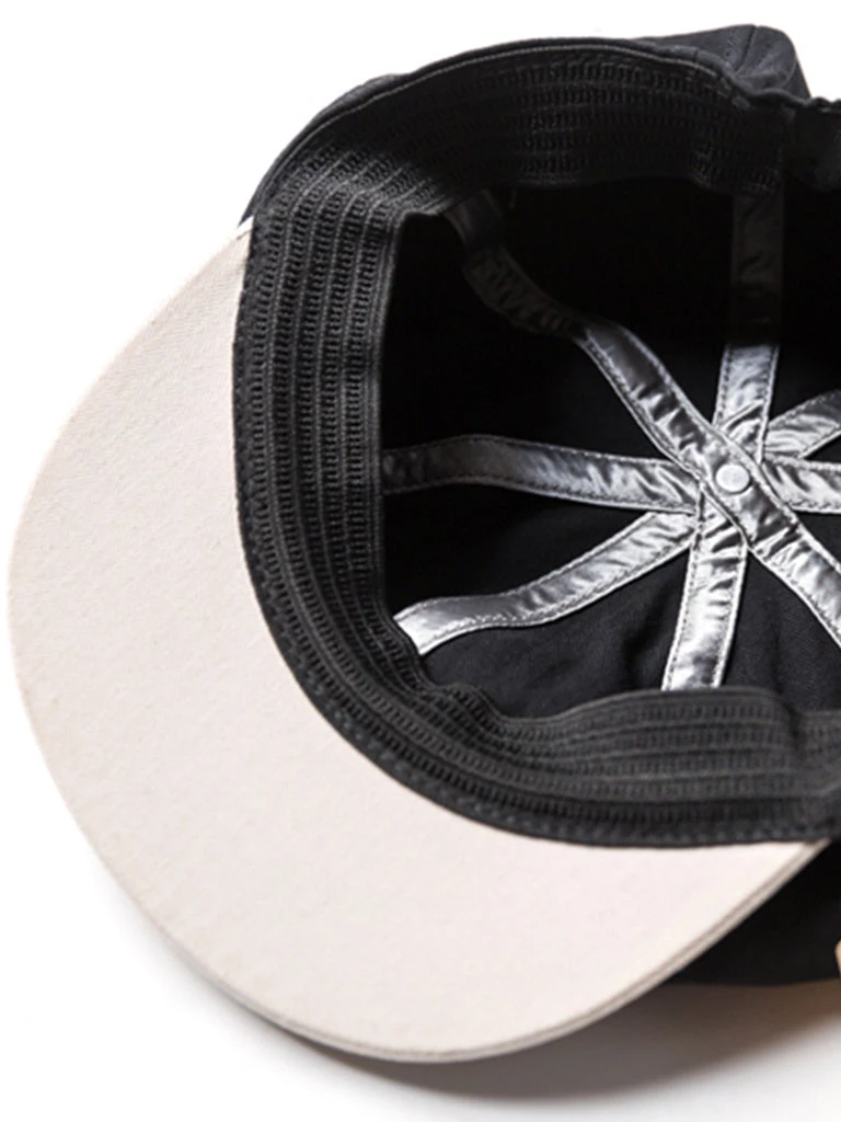 Sports locomotive hat derived from newsboy hat, same dome, flat cap. The brim of this hat is stiff, and it’s cool to wear. Because the fabric is stiff, you need to push the material forward after wearing it to look smoother. Combination of front and brim with snap closure, If you open this button and pull back the hat body, you can also make a shape similar to Brando’s “police hat.”