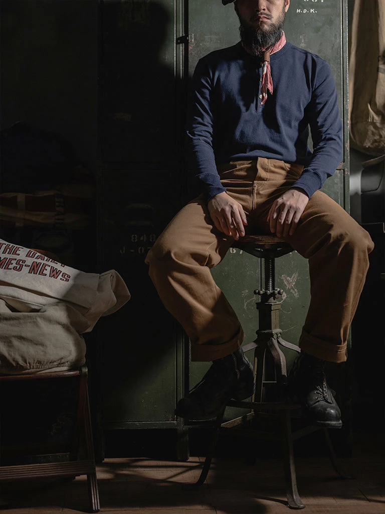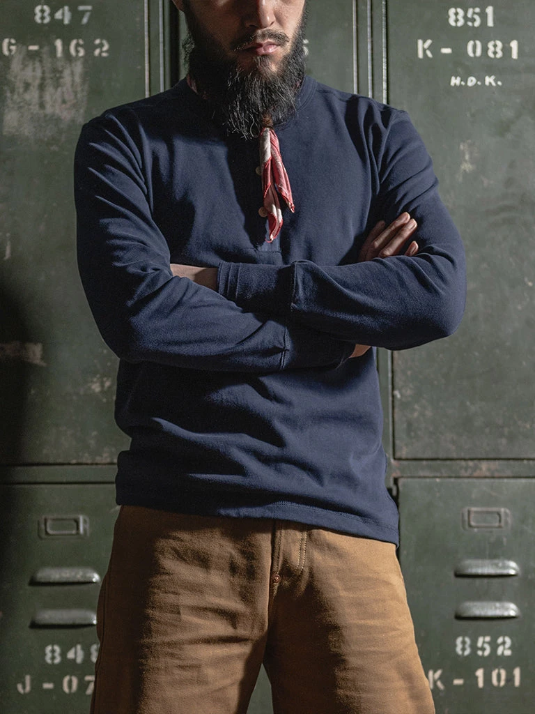The Henley T-Shirt was designed as a rowing shirt two hundred years ago before hitting its stride in combat. This Henley is 3 buttons style, made of heavyweight 10.6 oz cotton fabric, standard fit, not too tight, not too loose, easy throughout the body, has a great texture, is comfortable to wear, and will look more retro after long wear and multiple washes.