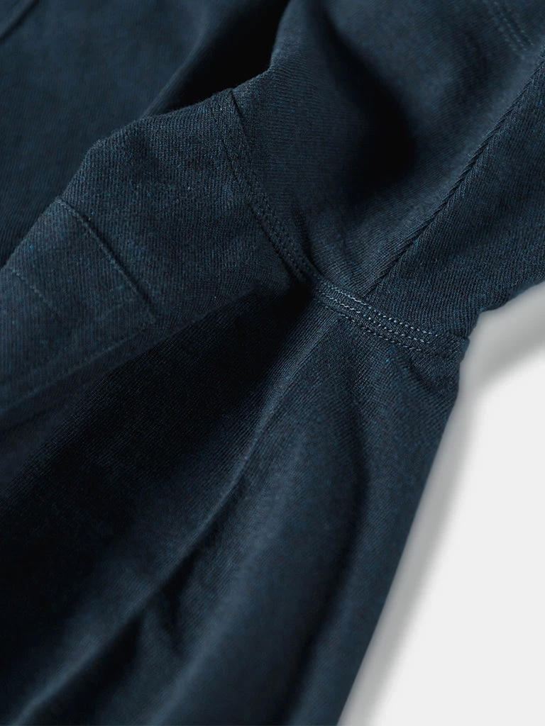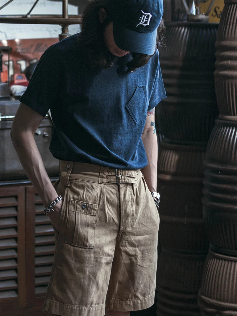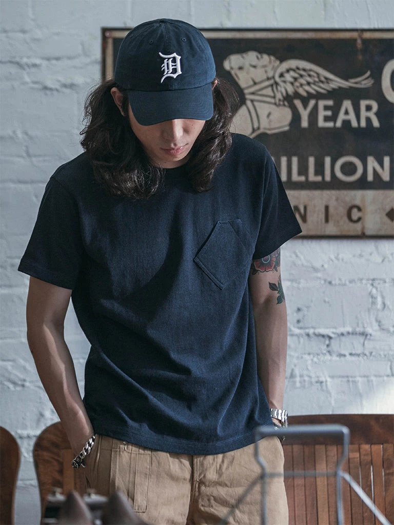 The unique feature of this T-shirt is the front pocket design. It refers to the slanted pocket design of 1930s SWEET-ORR workwear, which is practical and very characteristic, unlike the common square pocket design. It’s is a tubular t-shirt, made of 10.5 oz heavyweight ringspun cotton fabric, the fabric texture is strong, also very comfortable.