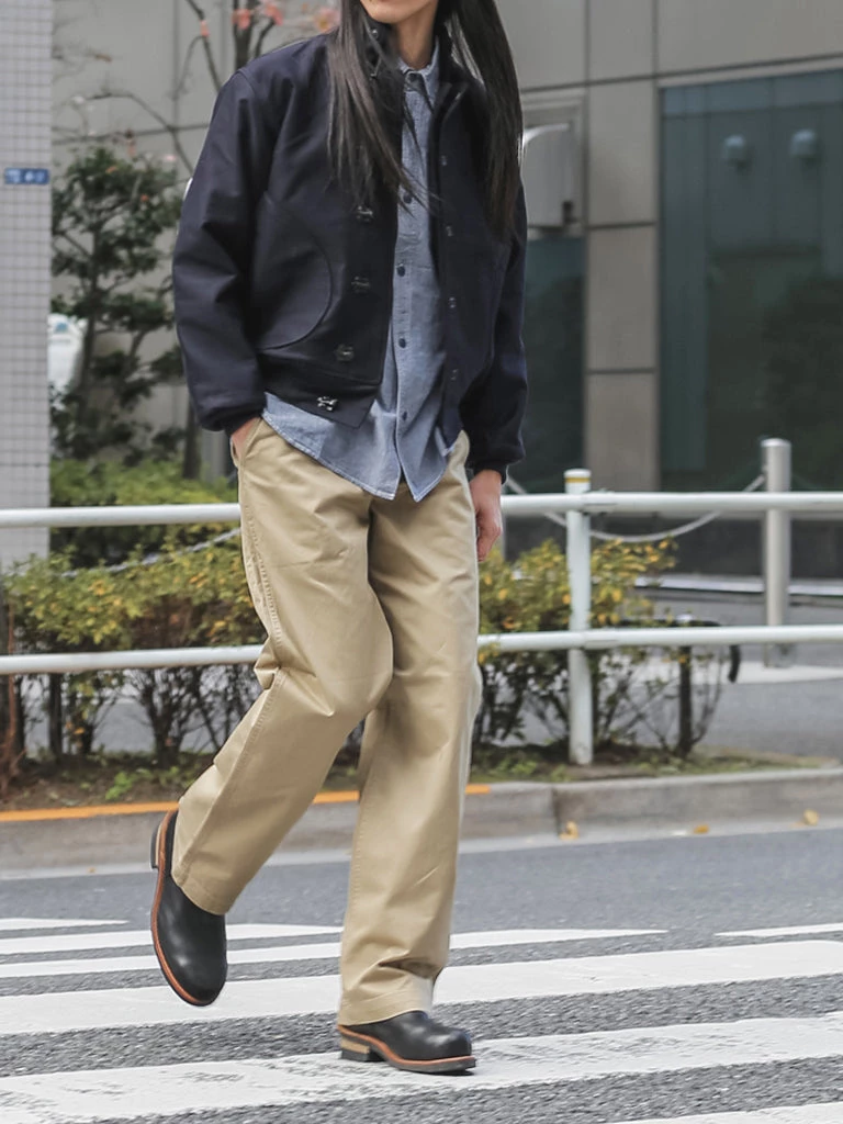 This is a reproduction of the 1942 version, and it features are double welted pockets, and twin-needle chain stitch craft. It comes in 11.5 oz of high-density single-yarn drill fabric, which is very close to the texture of the original.