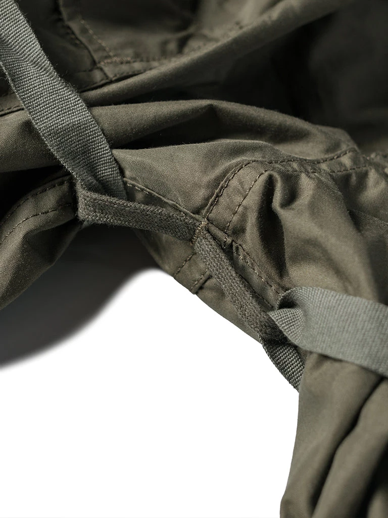 We restored the detail of the original as much as possible, such as two side open hand pockets, a right hip pocket with a flap, leg cargo pockets with a flap and tie (all having snap closures), straps at the bottom of the crotch, ankle and the waist tightener, internal buttons for attaching the liner.