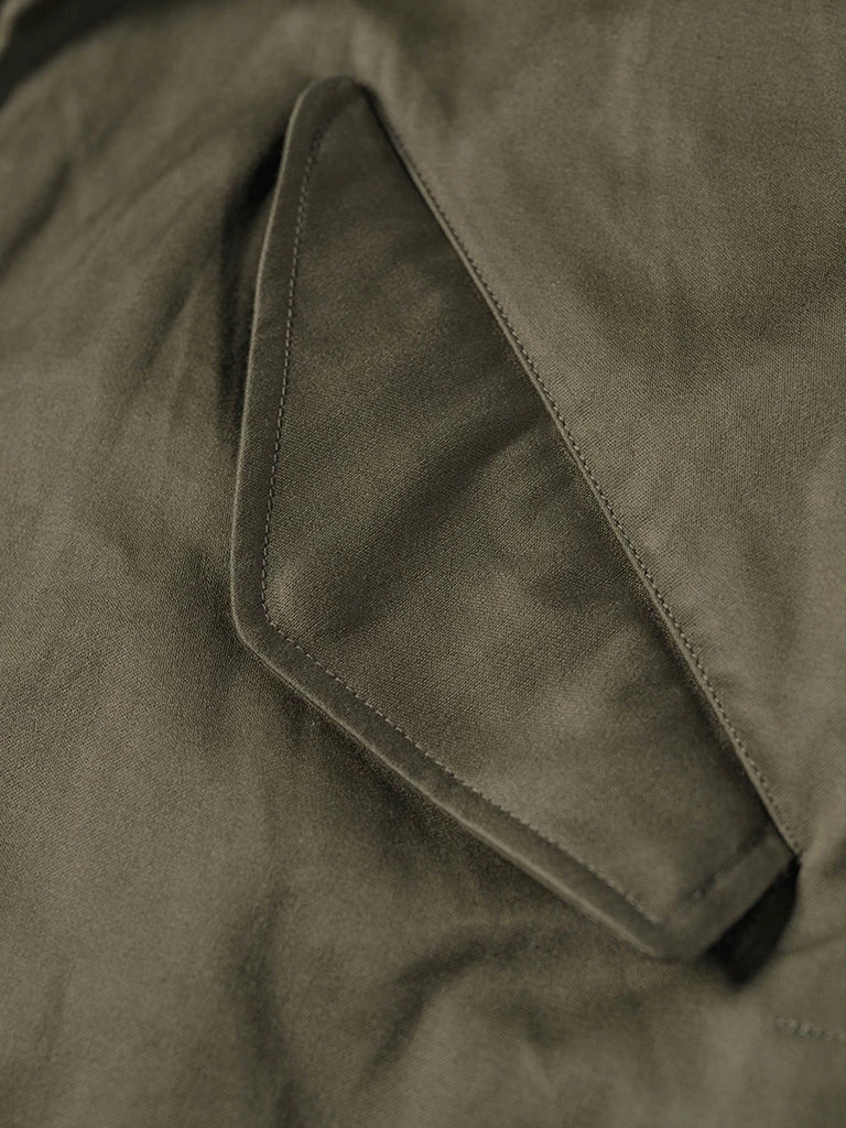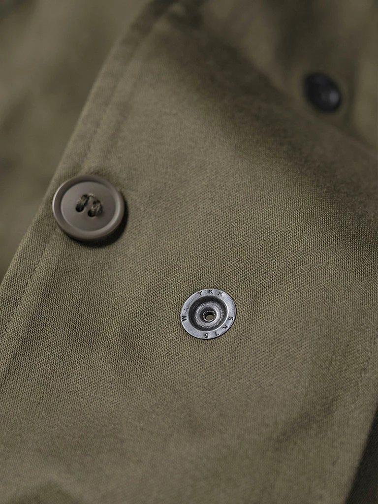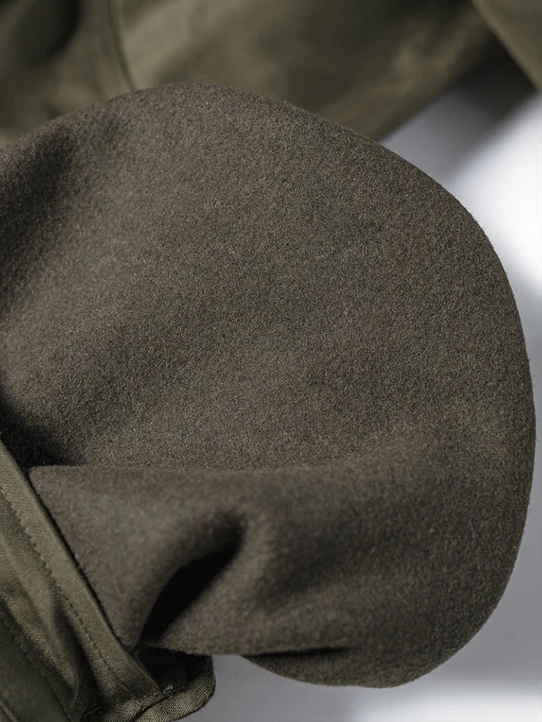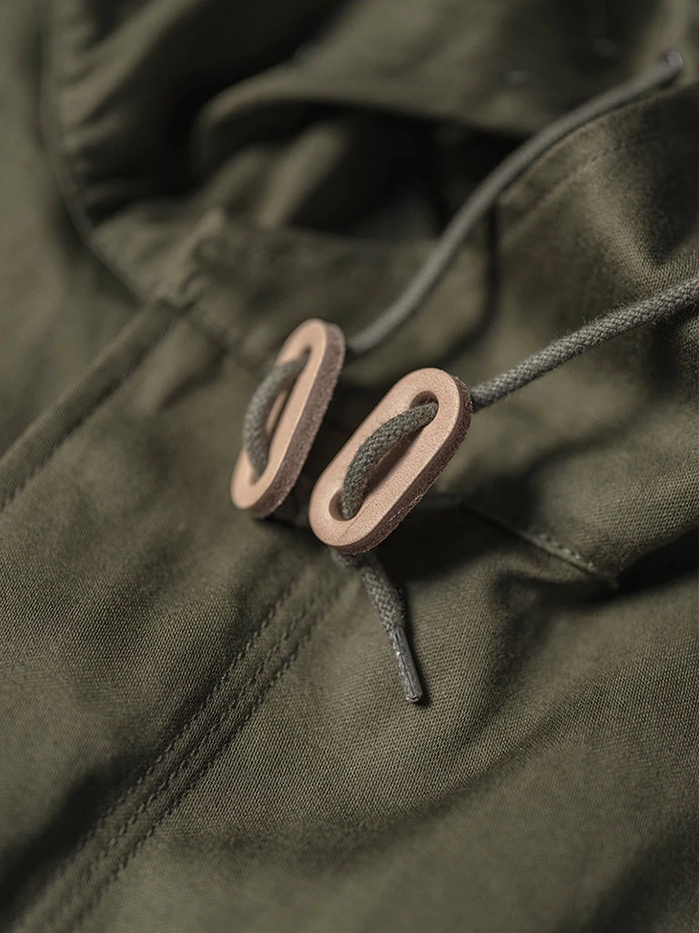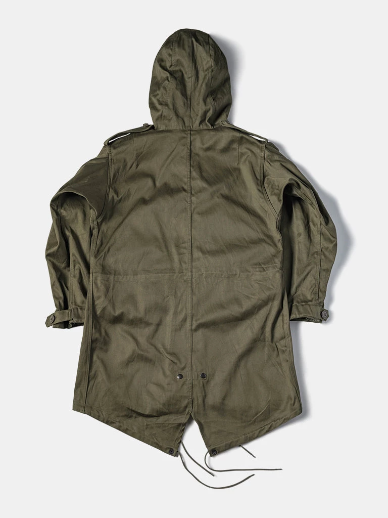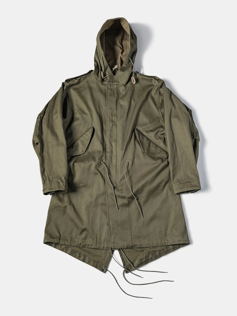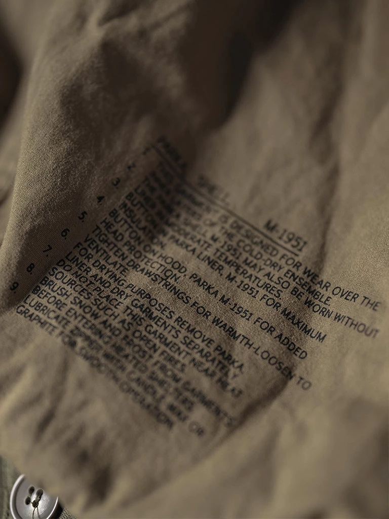 The M-1951(or M51) Parka, commonly known as the fishtail parka. It was designed by the US Army during the Korean War to cope with severe cold weather. It was a replacement for the M-48 Parka. The early M-51 Parka was made of heavy cotton sateen fabric, which was thicker. The fishtail was intended to be tied around soldiers’ legs for additional cold-weather protection. The M-51 parka can add a wool liner to the inside.