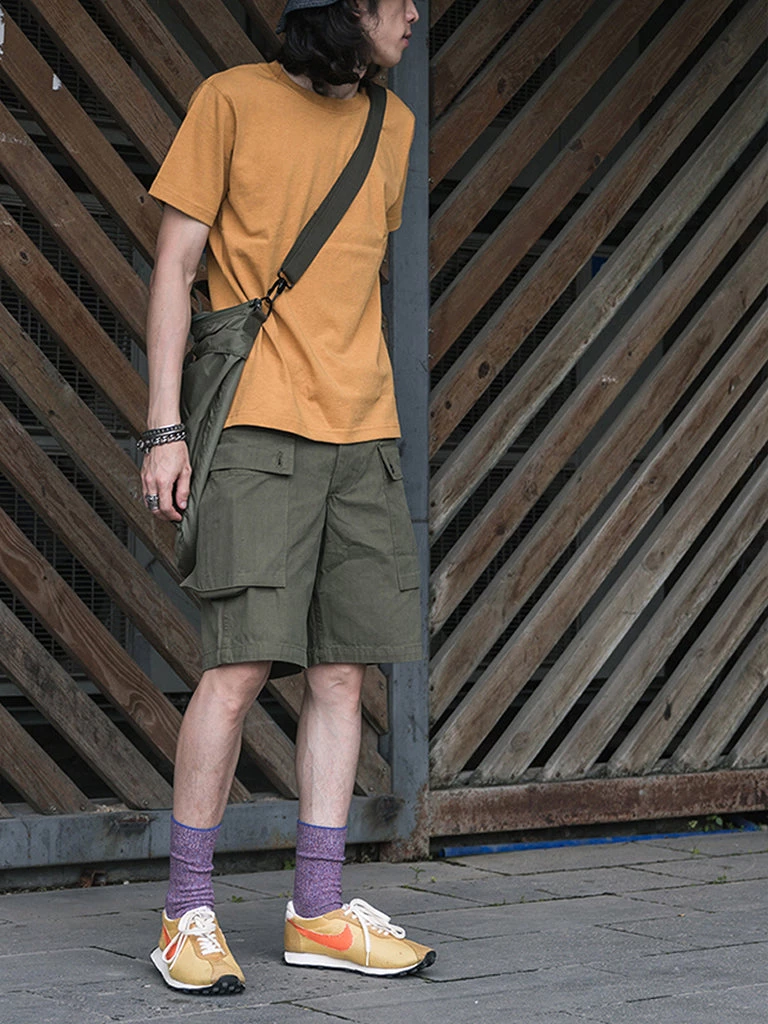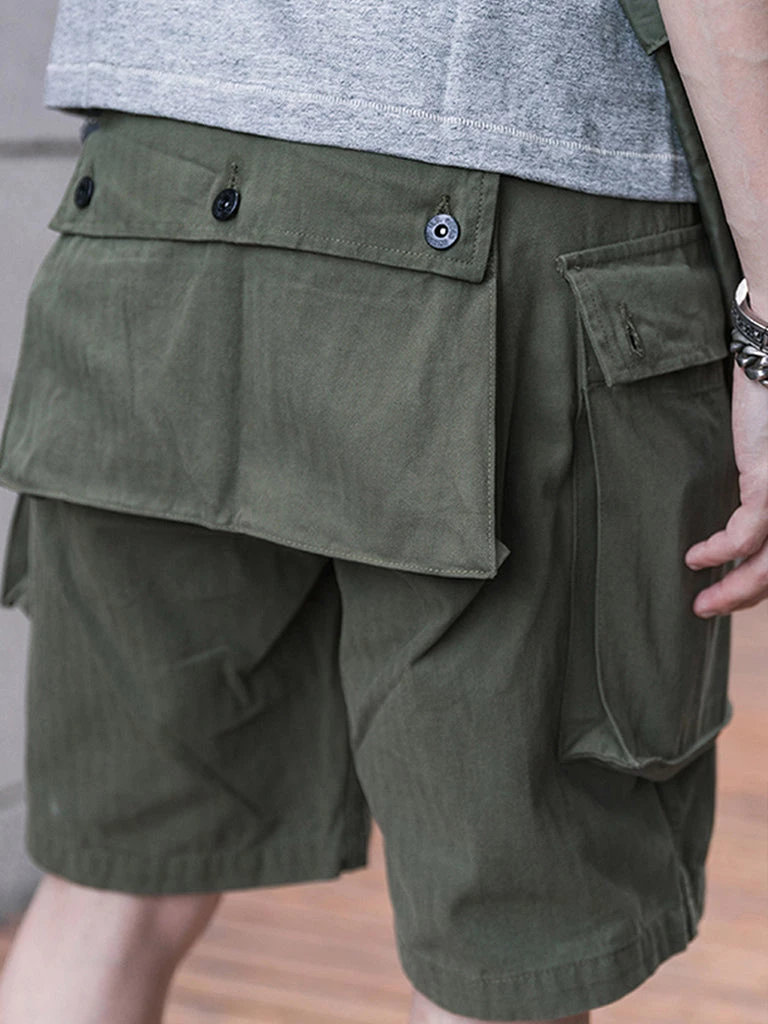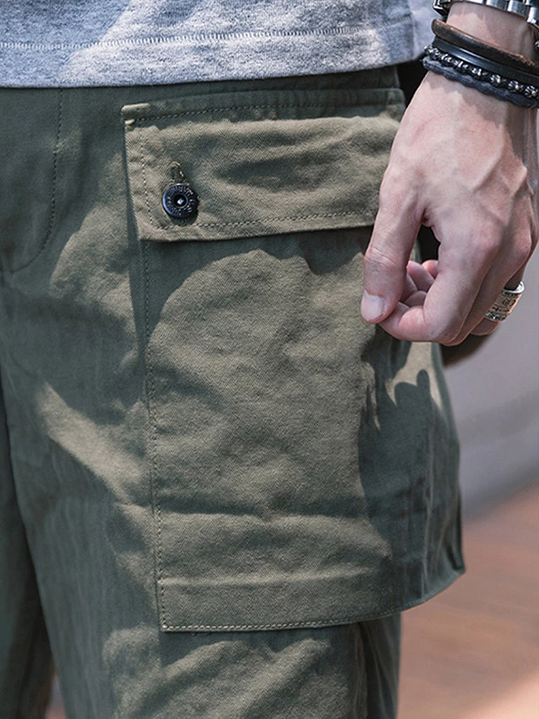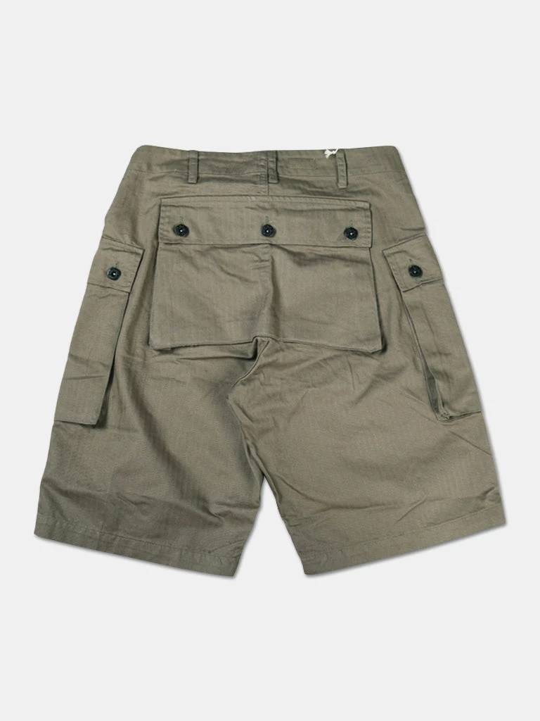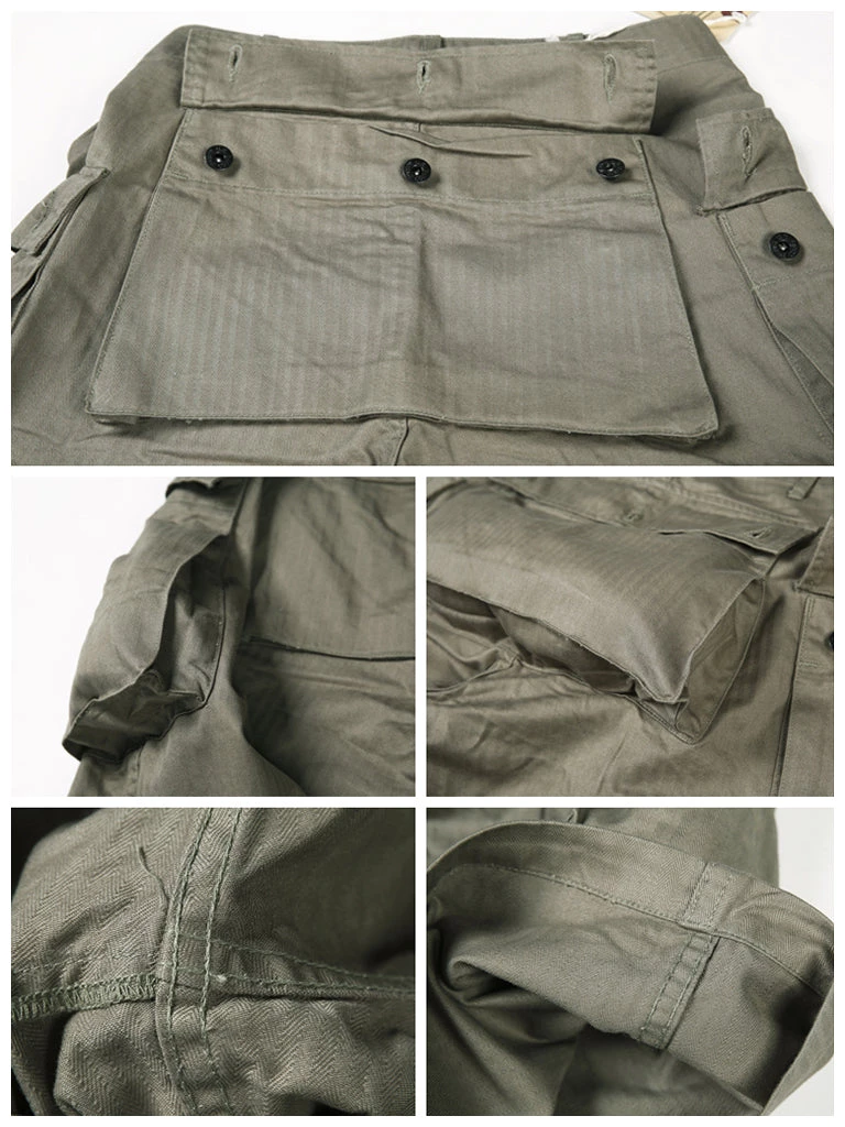 In 1944, USMC (US Marine Corps) started using the P-44 pants, also known as the “Monkey Pants.” They are the most well-known and distinctive trousers within the USMC. It significantly differs from the previous P-41 model with large cargo pockets on both the back and sides. The pockets on the sides were made large to fit k-ration boxes (military food rationing box), and the back pocket was to pack a camouflage poncho. With multiple pockets allowing a large amount of storage, reinforced holes were placed on the belt band to fit P-1941 suspenders to avoid the weight pulling marines trousers down.
