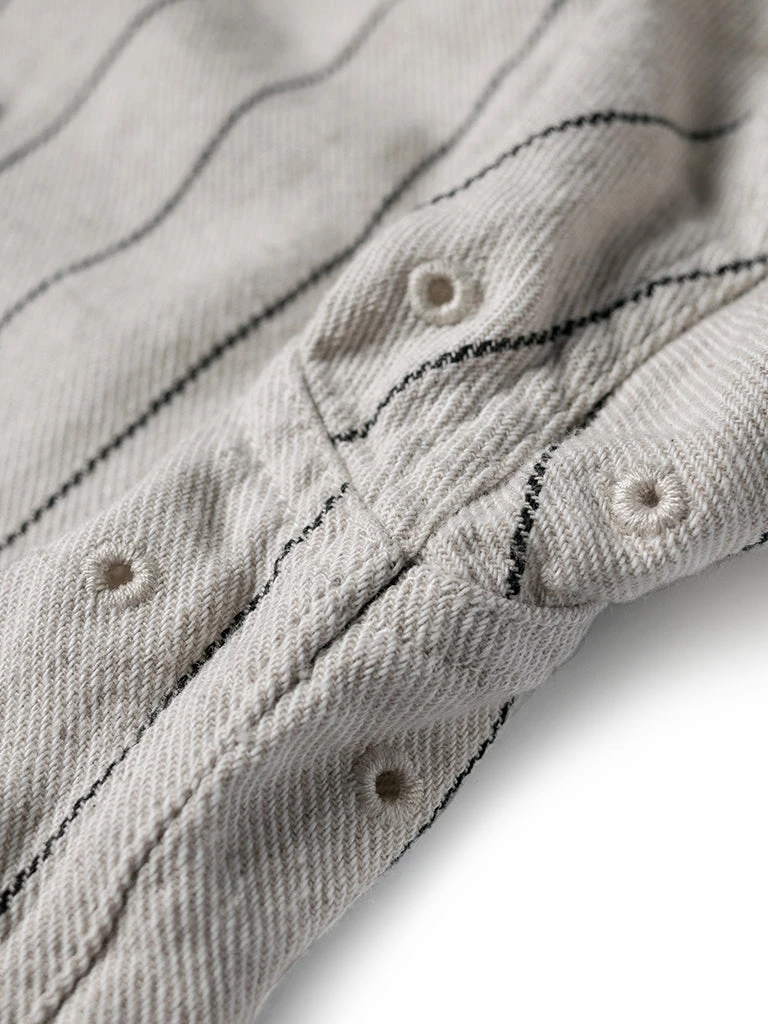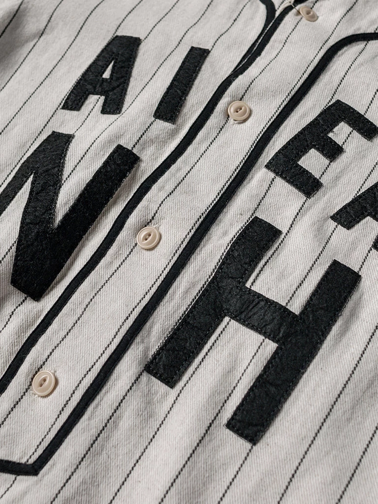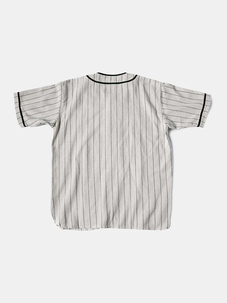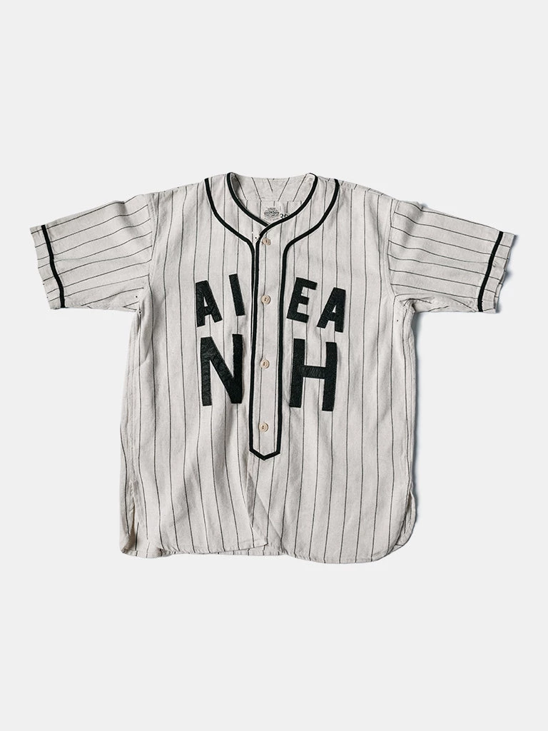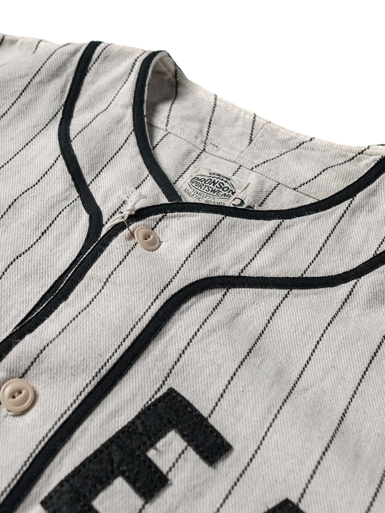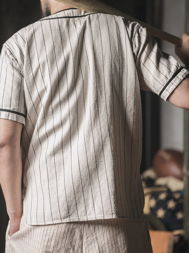 This 1940s style military baseball shirt is made from cotton and linen, and moderately thick and breathable. Its wide-spaced vertical stripes and color scheme give it a rustic retro vibe. The flat seam was adopted, and the side body was overlocked by handmade instead of chain seam, restoring the vintage sense.