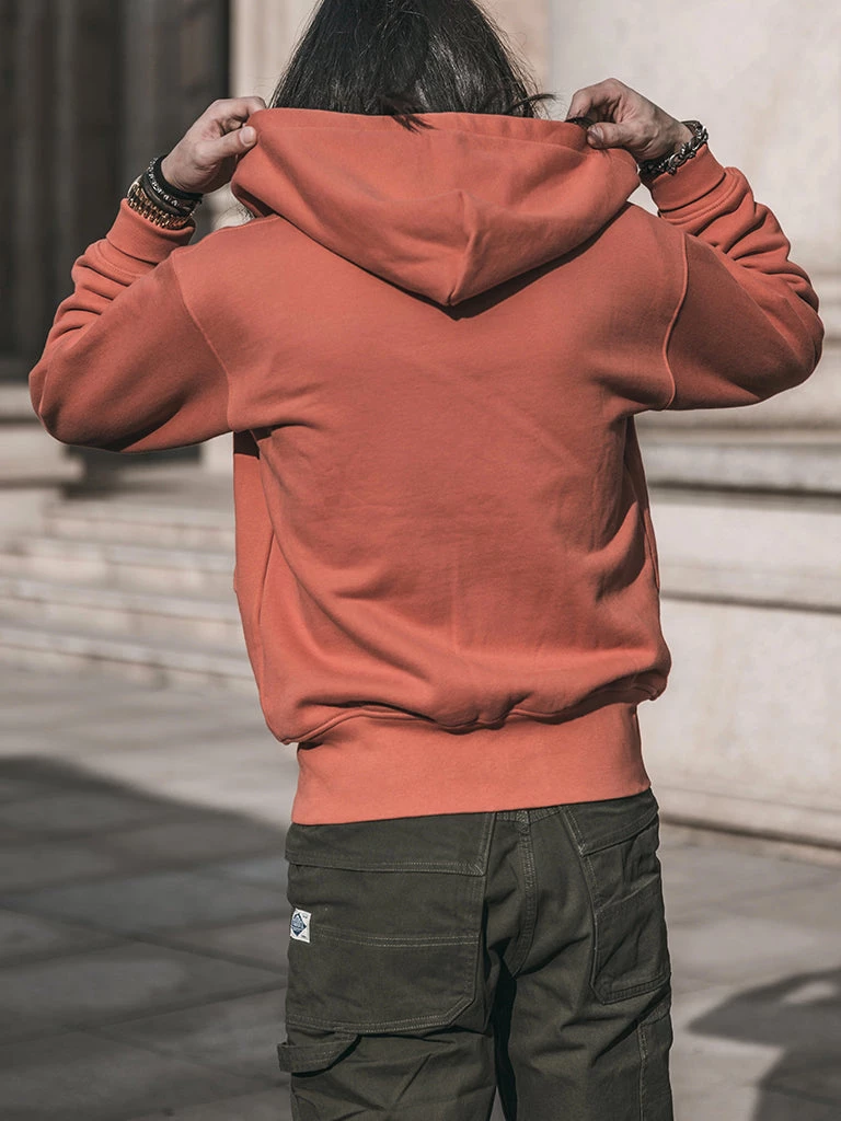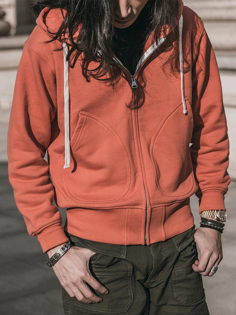 This zip-up hoodie is made of heavyweight 17.5 oz terry cloth, allowing the fabric to have a heavier and denser handle. It is soft, comfortable, and durable.
