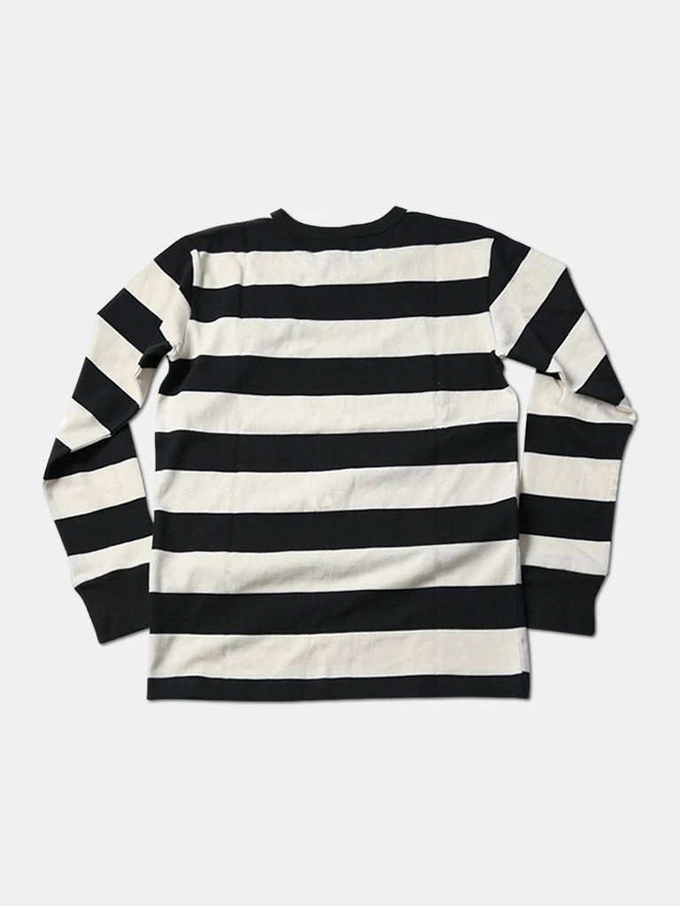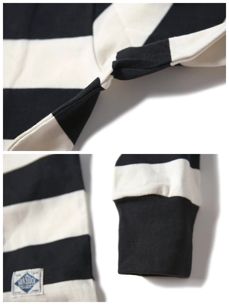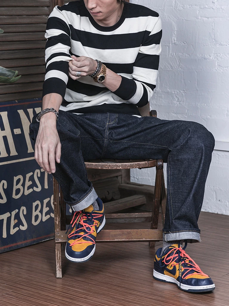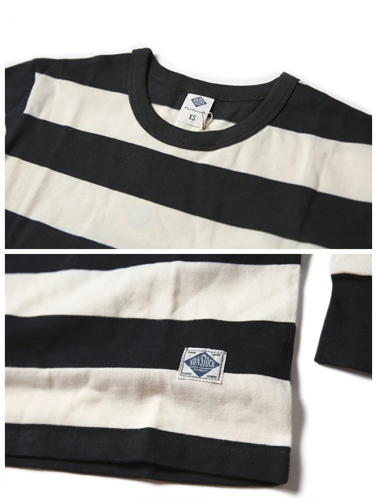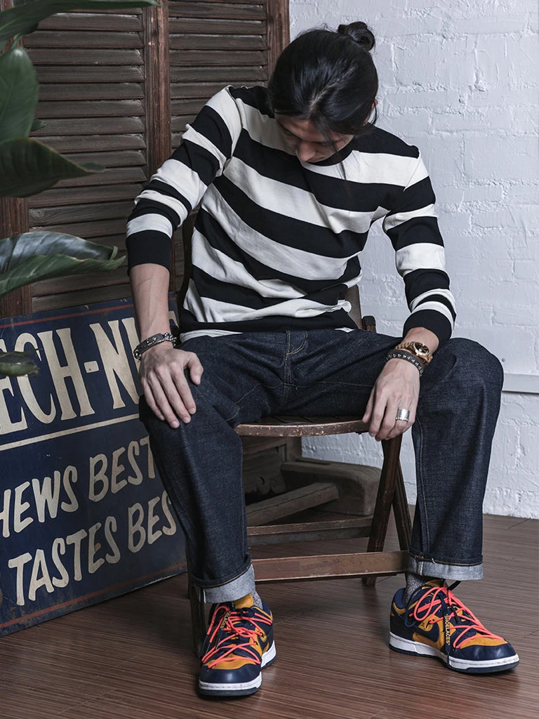 This is a prisoner-style t-shirt, it’s popular with motorcyclists. It is made of 9.17 oz heavyweight 21s double-yarn cotton fabric. The stripe color is carbon black plus beige. It is primitive and durable.