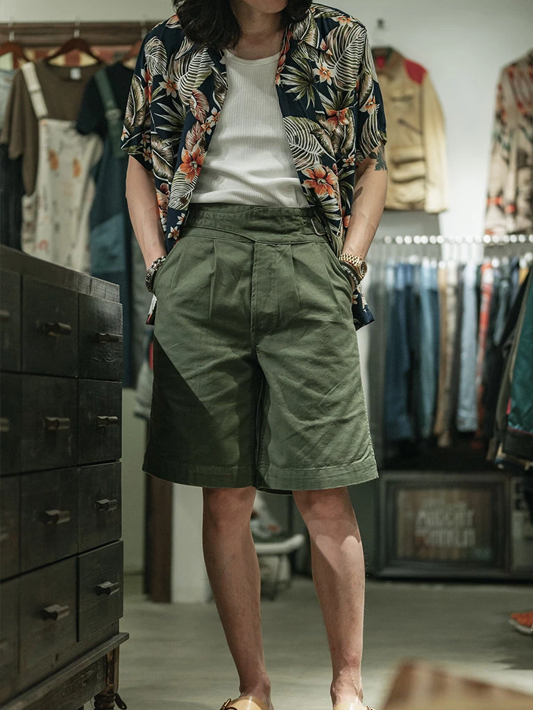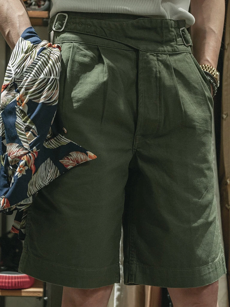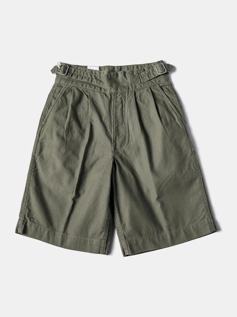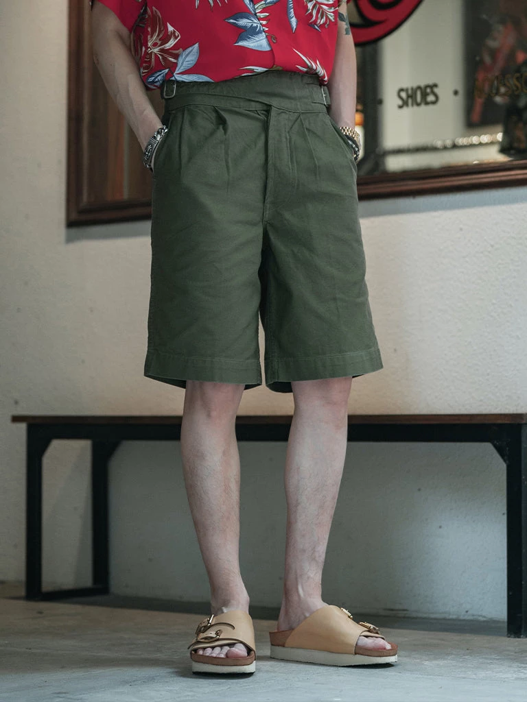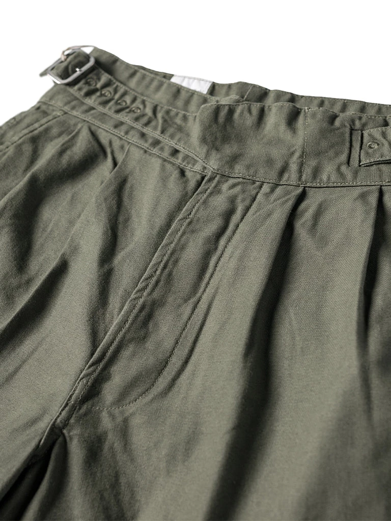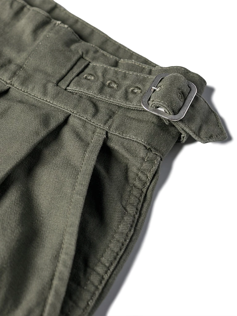 The Gurkha trouser was borne out of this alliance as well – rooted in British military tradition but explicitly modified for use by the Nepalese. The pant is defined by its double-pleated front and high, cummerbund-style waistband with buckle fastenings.