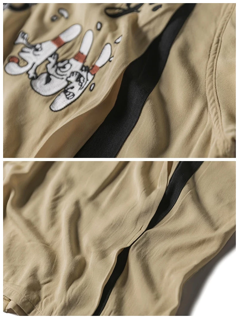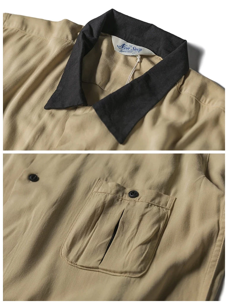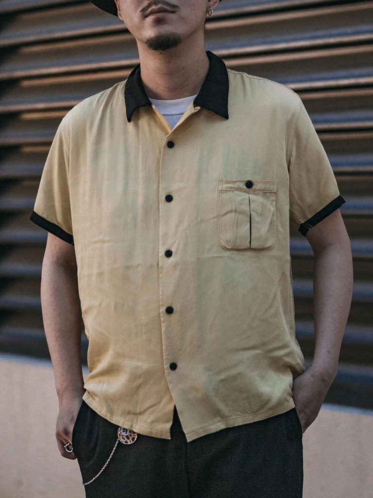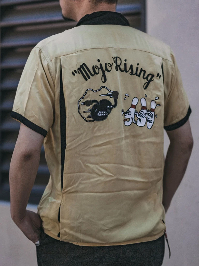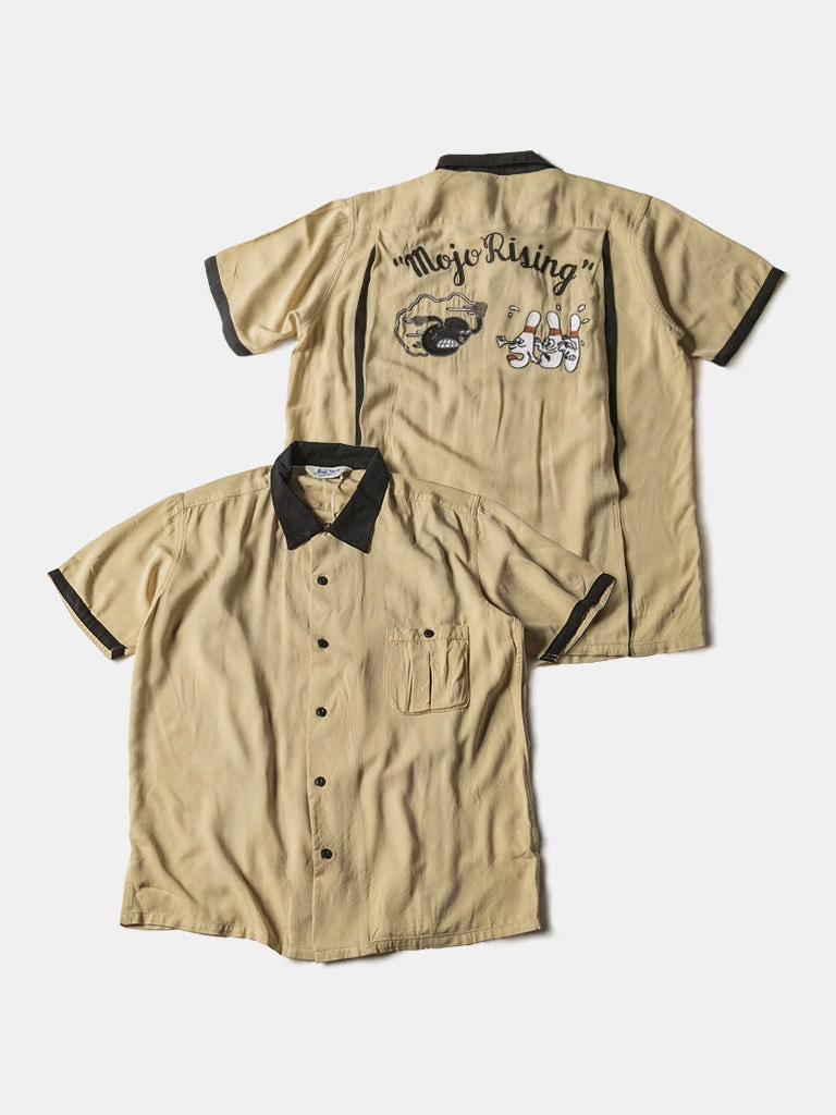 Classic bowling shirts with contrasting necklines and cuffs, sporting ruffles on the back, also feature contrasting colors.