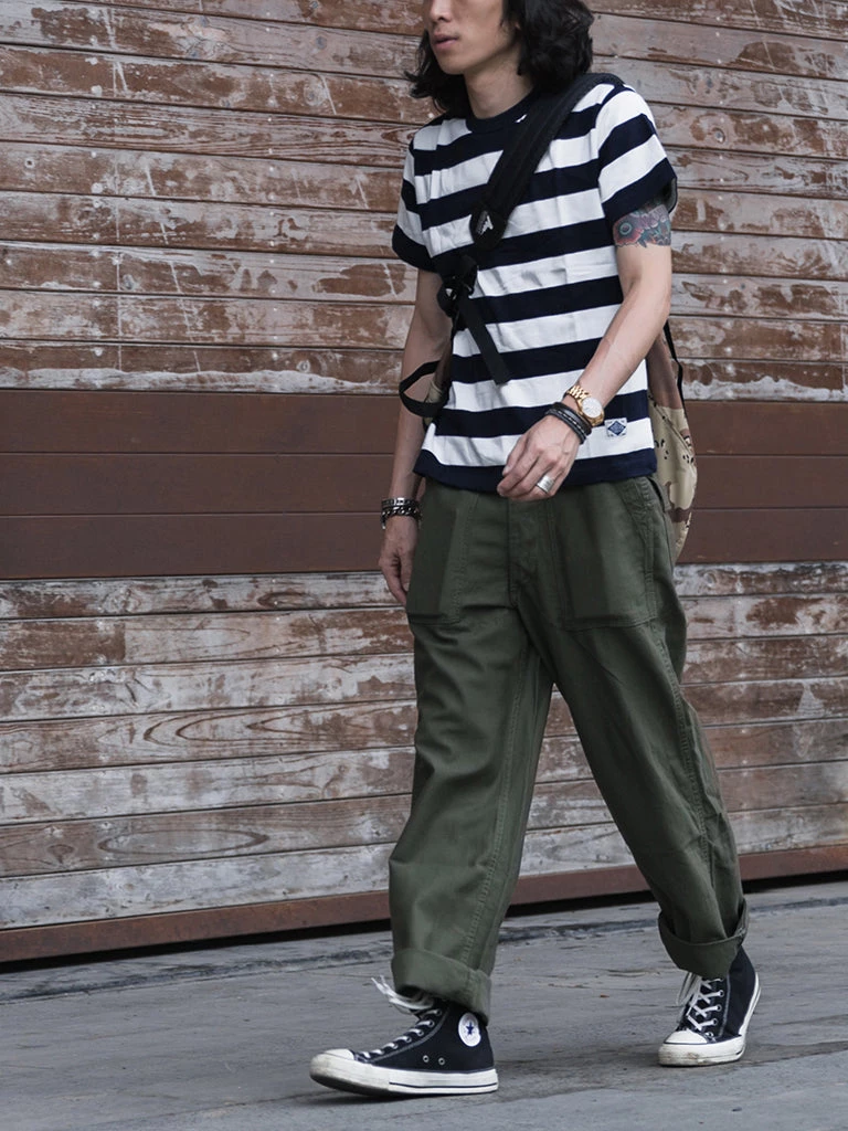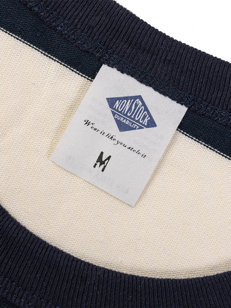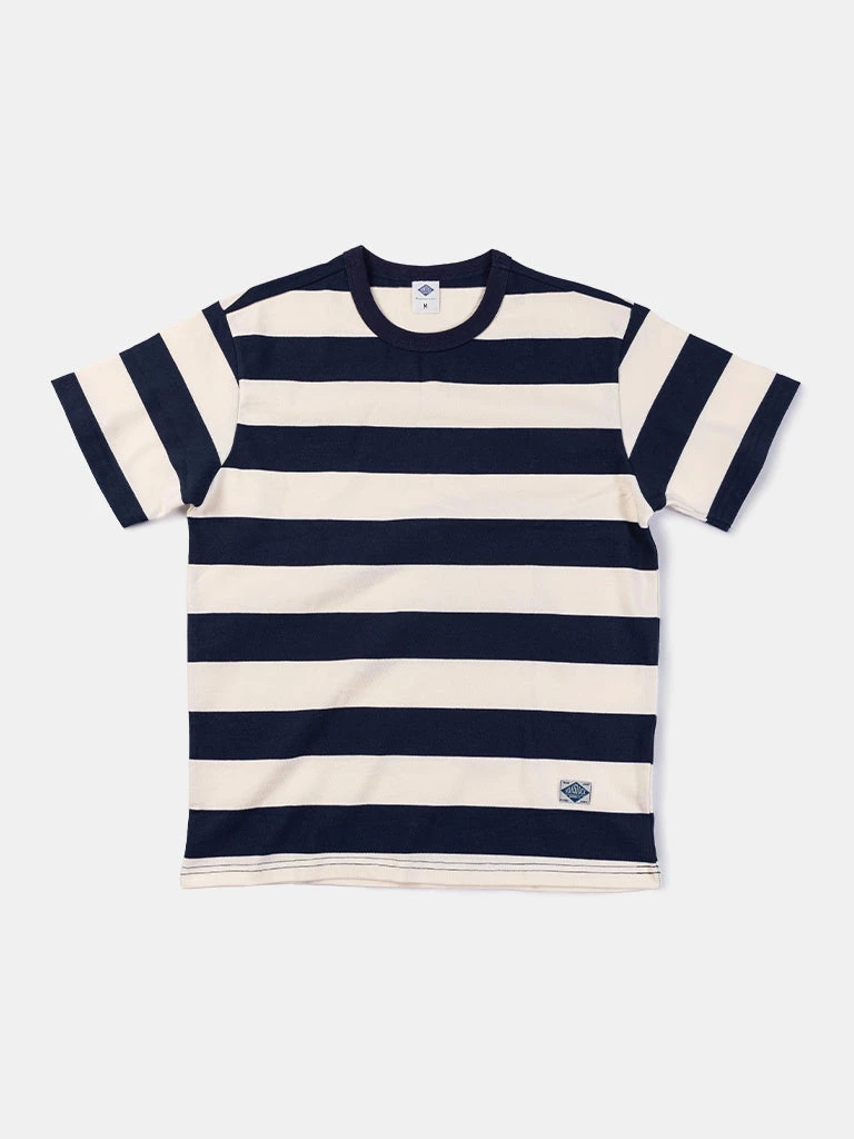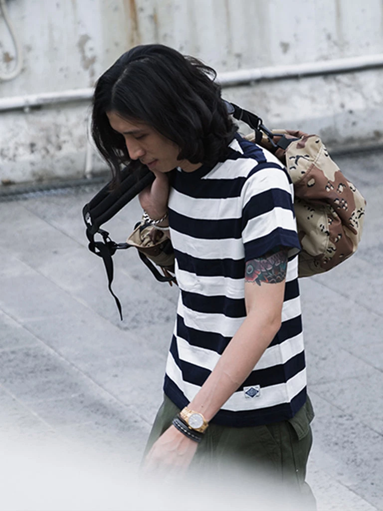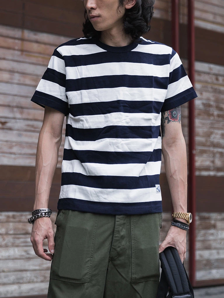 A 1950s inspired stripe tee made popular by motorcyclists in mid-century America. This Stripe Tee is made of heavyweight 9 oz cotton fabric.