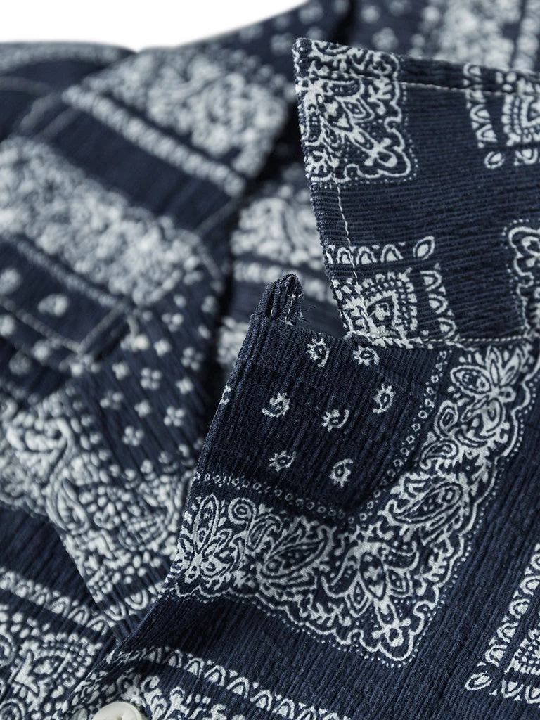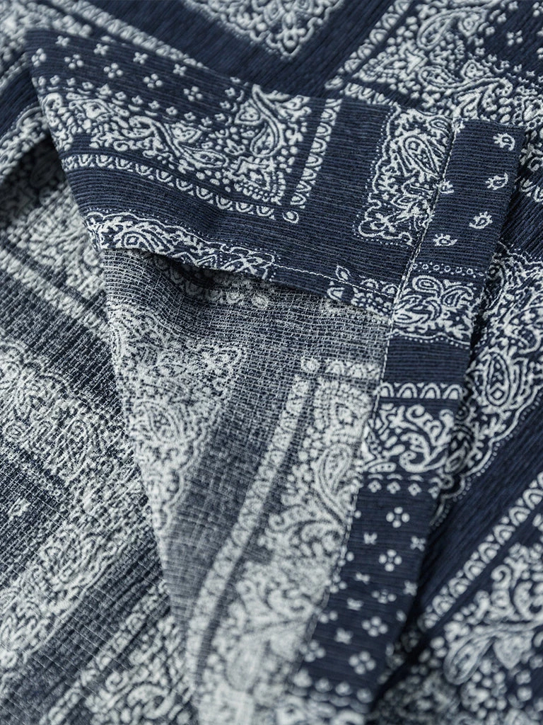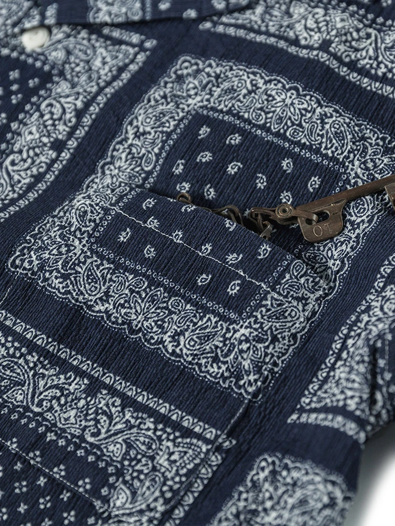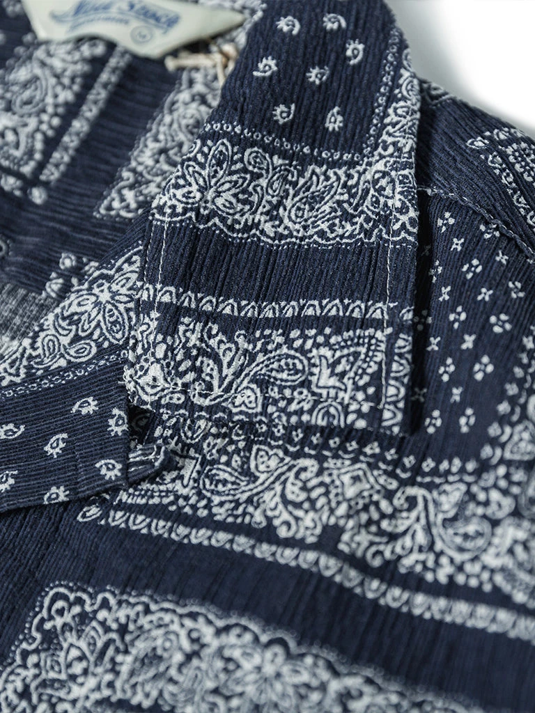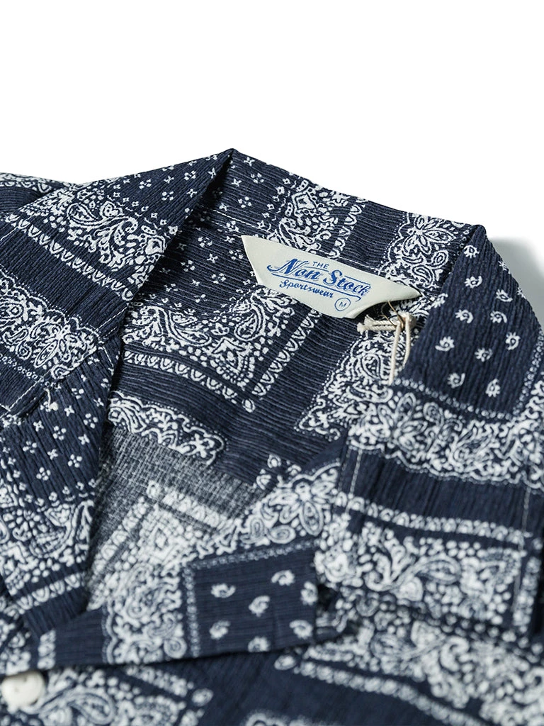 This shirt is reminiscent of the open collar shirts of the 1950s, made of rayon seersucker, uses paisley print, has navy & sky blue, two colors.