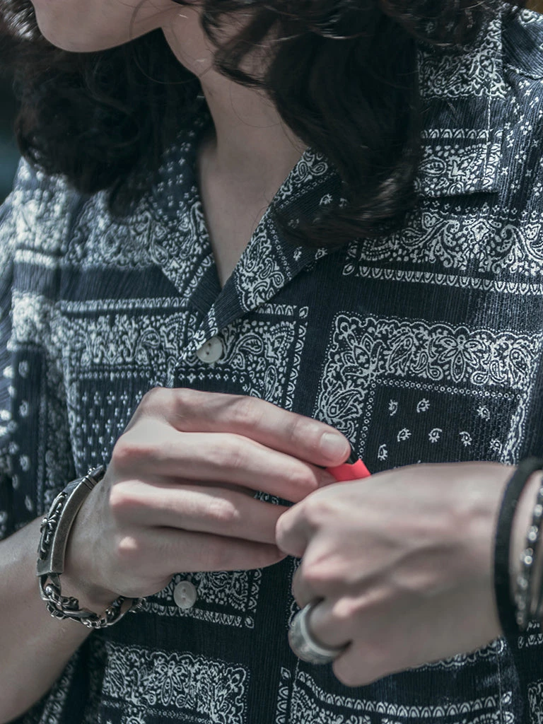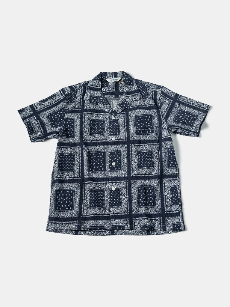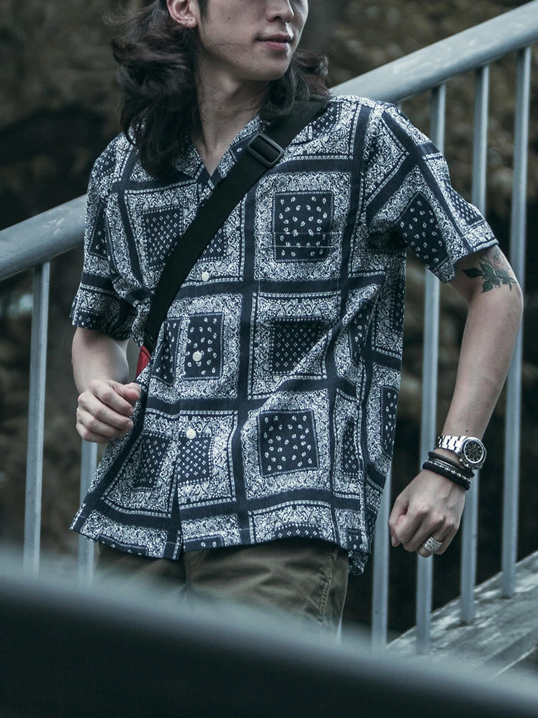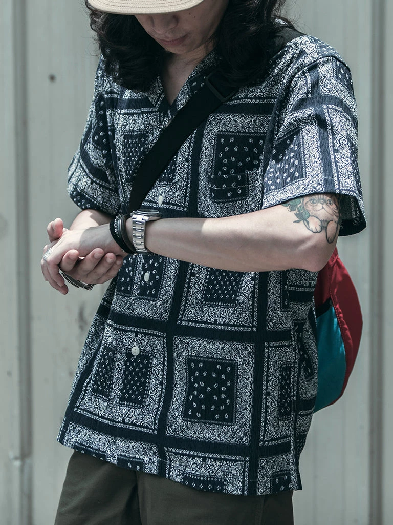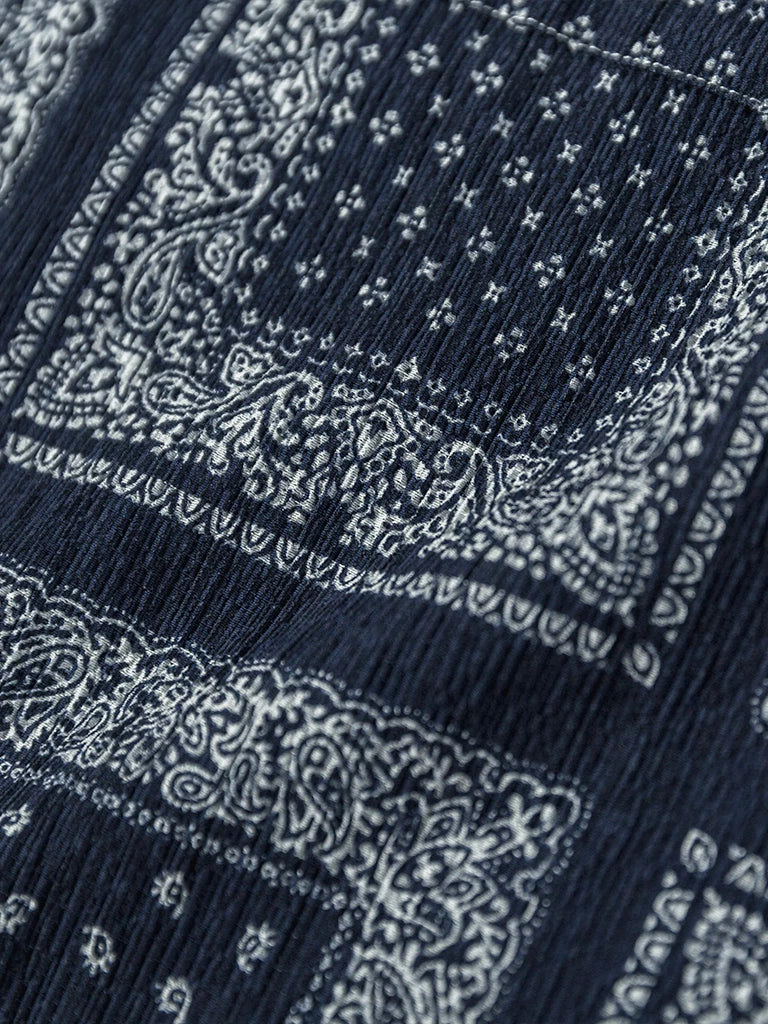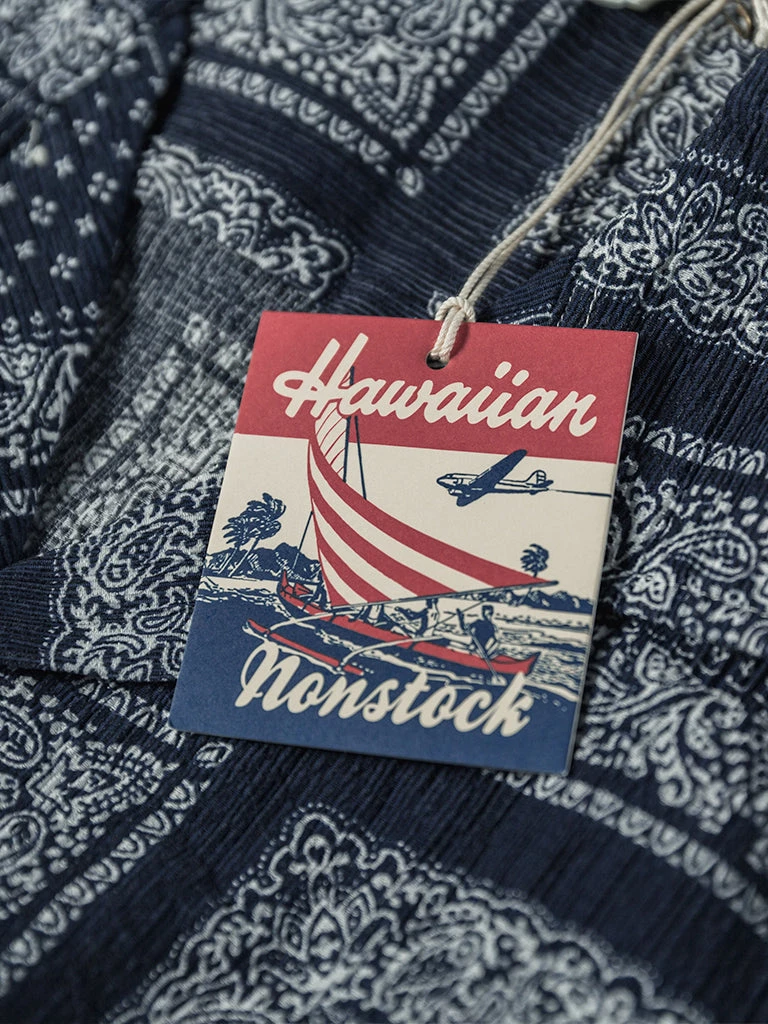 This shirt is reminiscent of the open collar shirts of the 1950s, made of rayon seersucker, uses paisley print, has navy & sky blue, two colors.