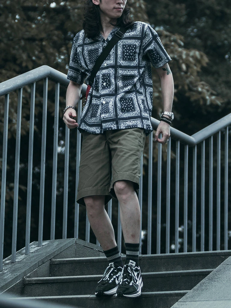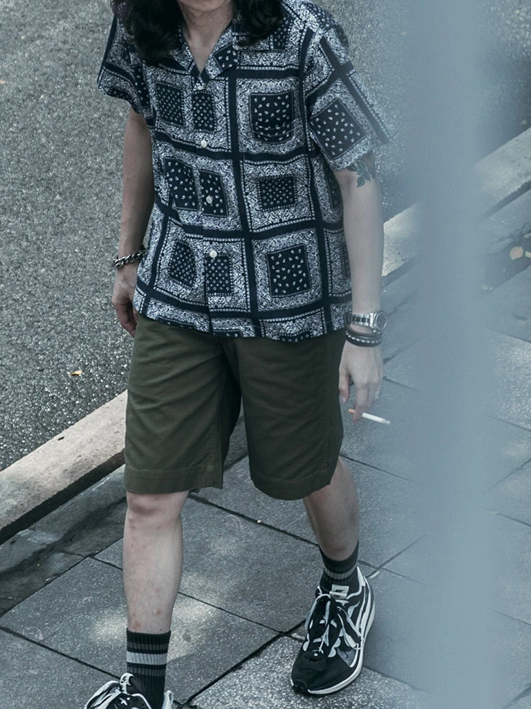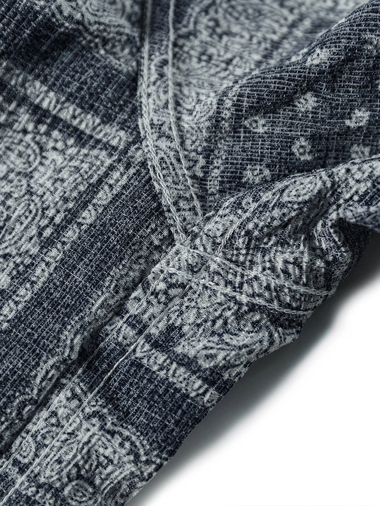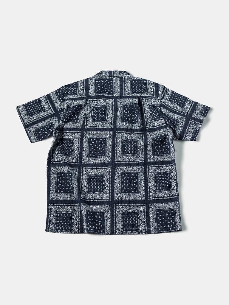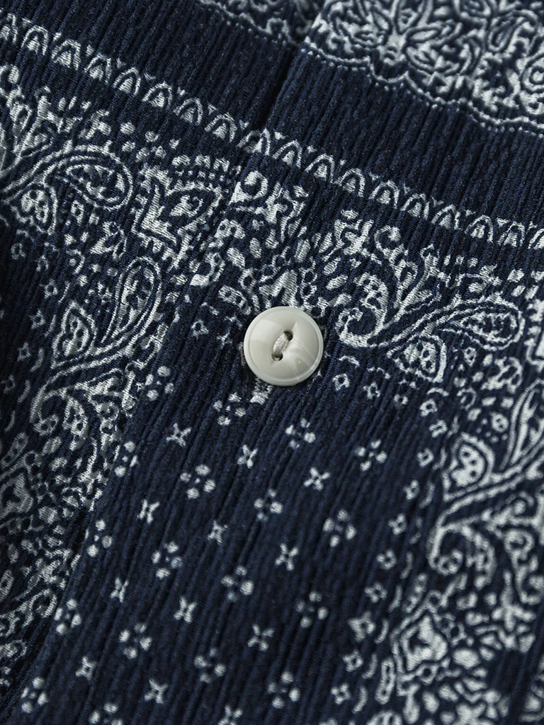 This shirt is reminiscent of the open collar shirts of the 1950s, made of rayon seersucker, uses paisley print, has navy & sky blue, two colors.