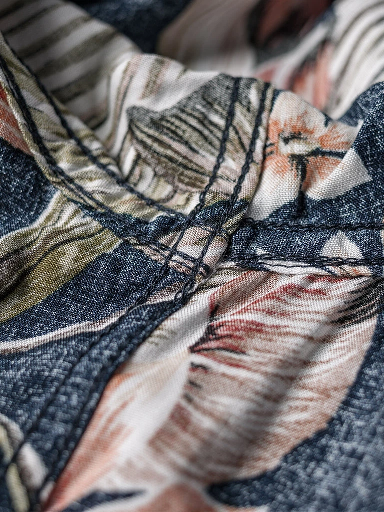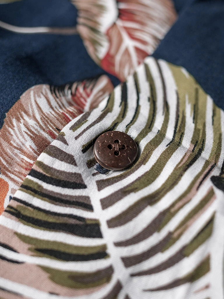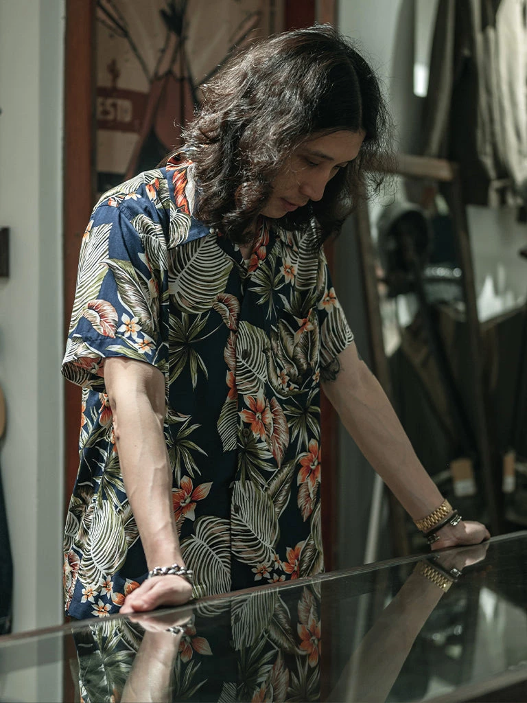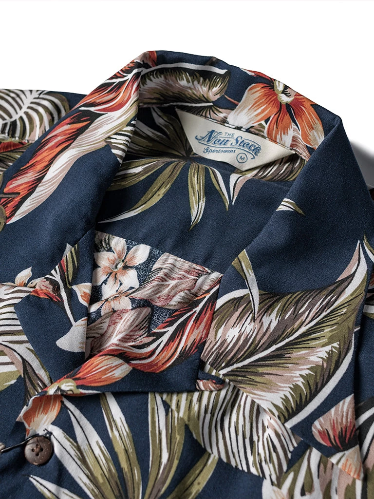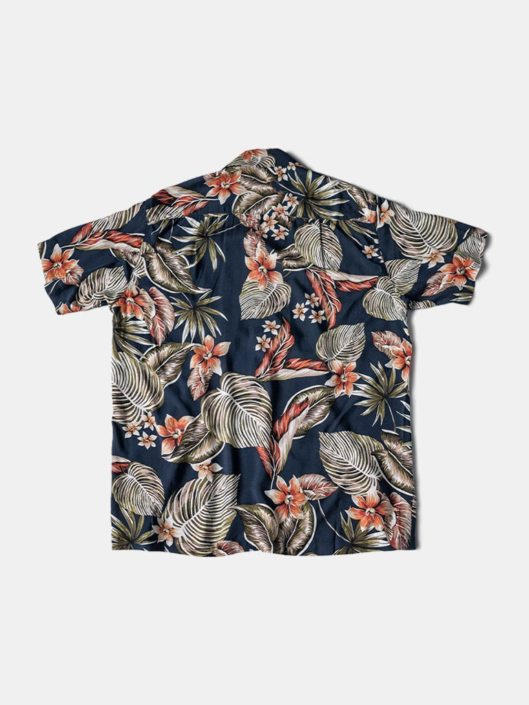 The shirt’s design retains the authenticity and quality of Hawaiian shirts from the golden era of the style. It is made from rayon which has a tactile quality and liveliness to it like no other fabric, and with plants and flowers pattern. There’s a single chest pocket, a great place to put sunglasses or a similarly sized object. It can be worn alone or open over a tee.