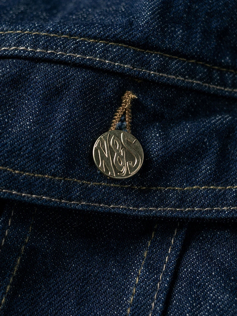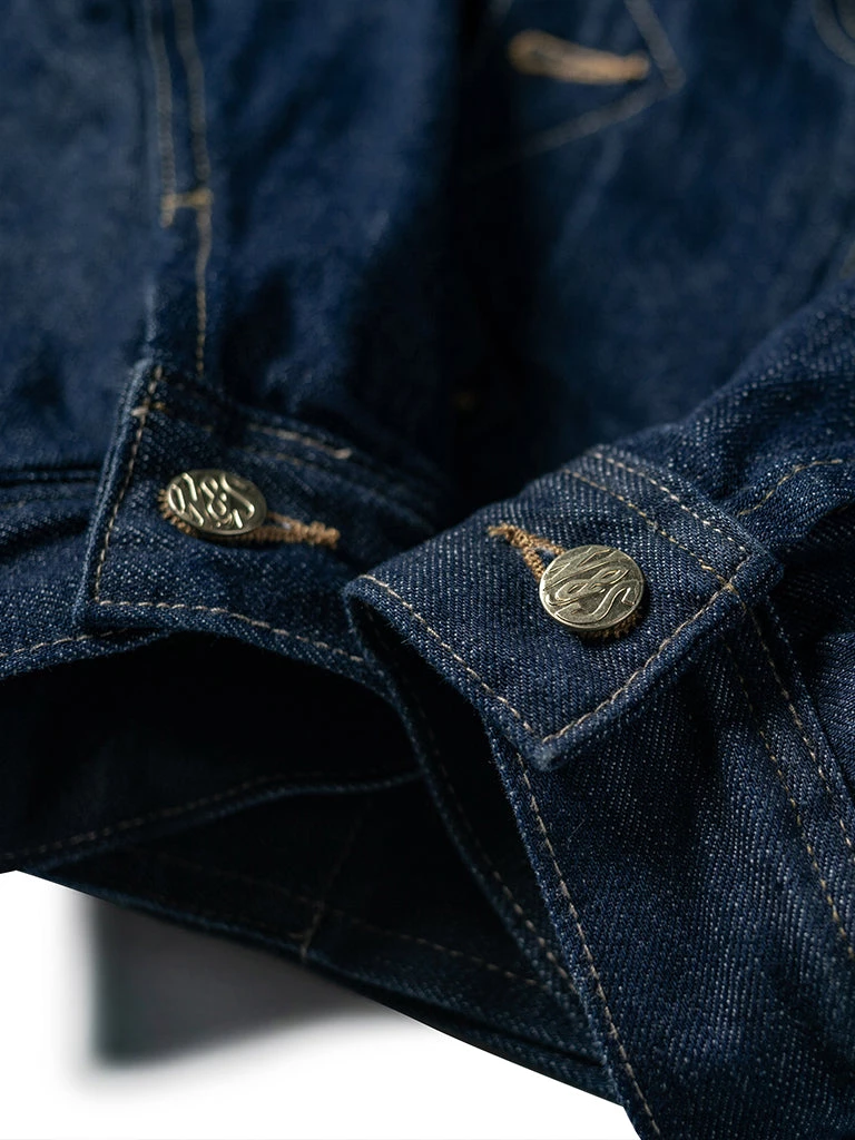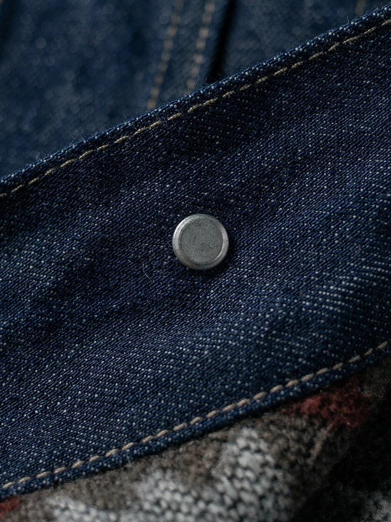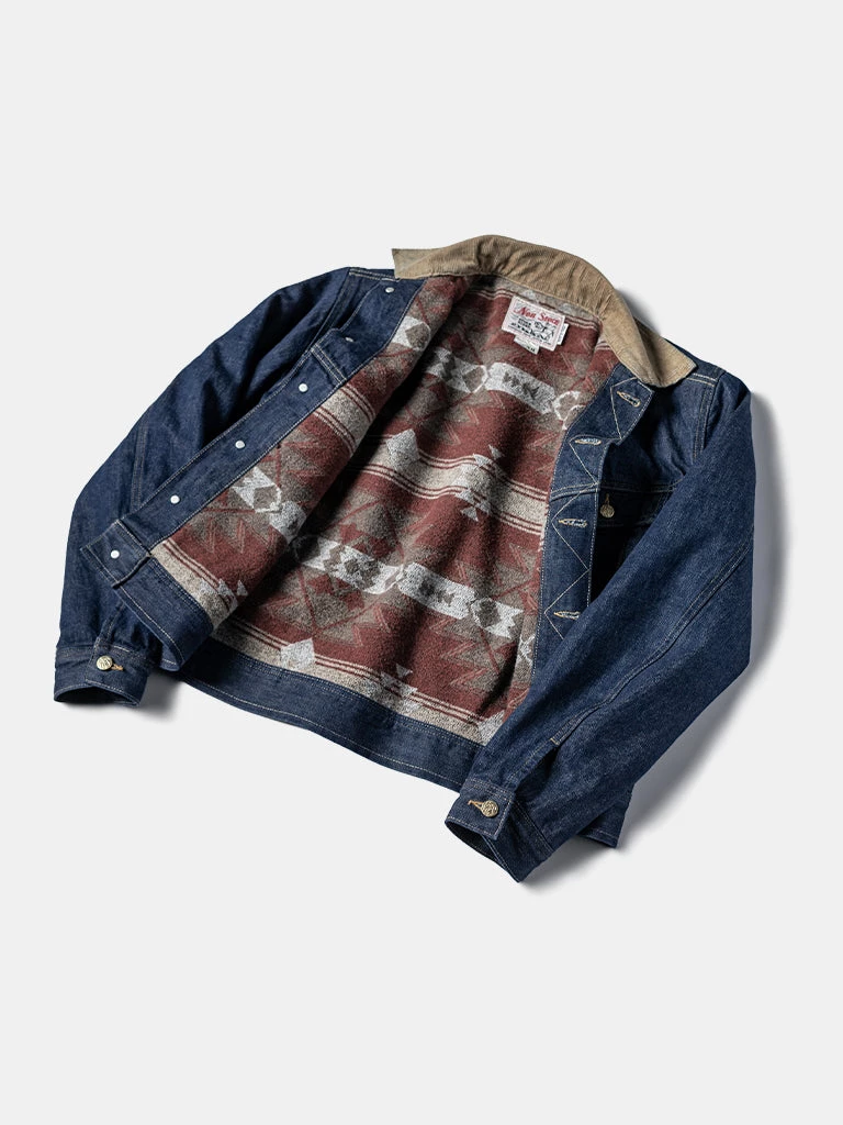 This denim jacket uses the traditional ring spinning fabric, with a soft and comfortable texture, and uses indigo dyeing. The lining uses the American Indian style woven blanket cloth, the same cut as the original, the spirit is able. To use NON STOCK new brass cowboy buckles. The jacket hem adjustment buttons are natural corozo buttons.