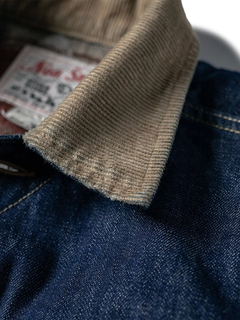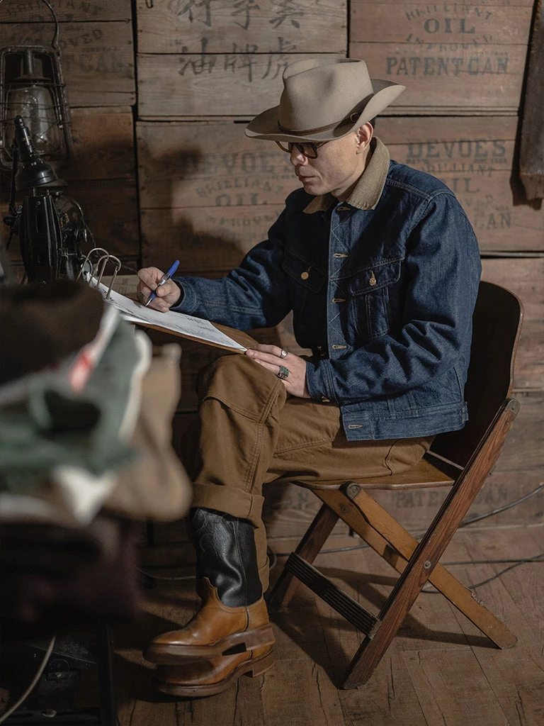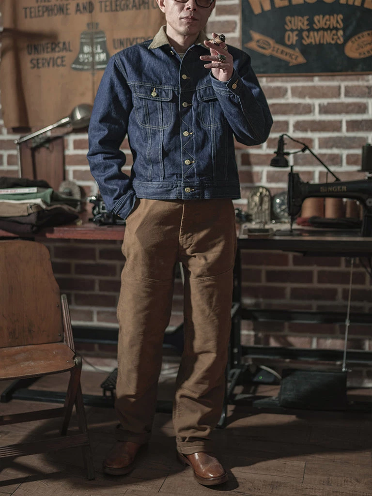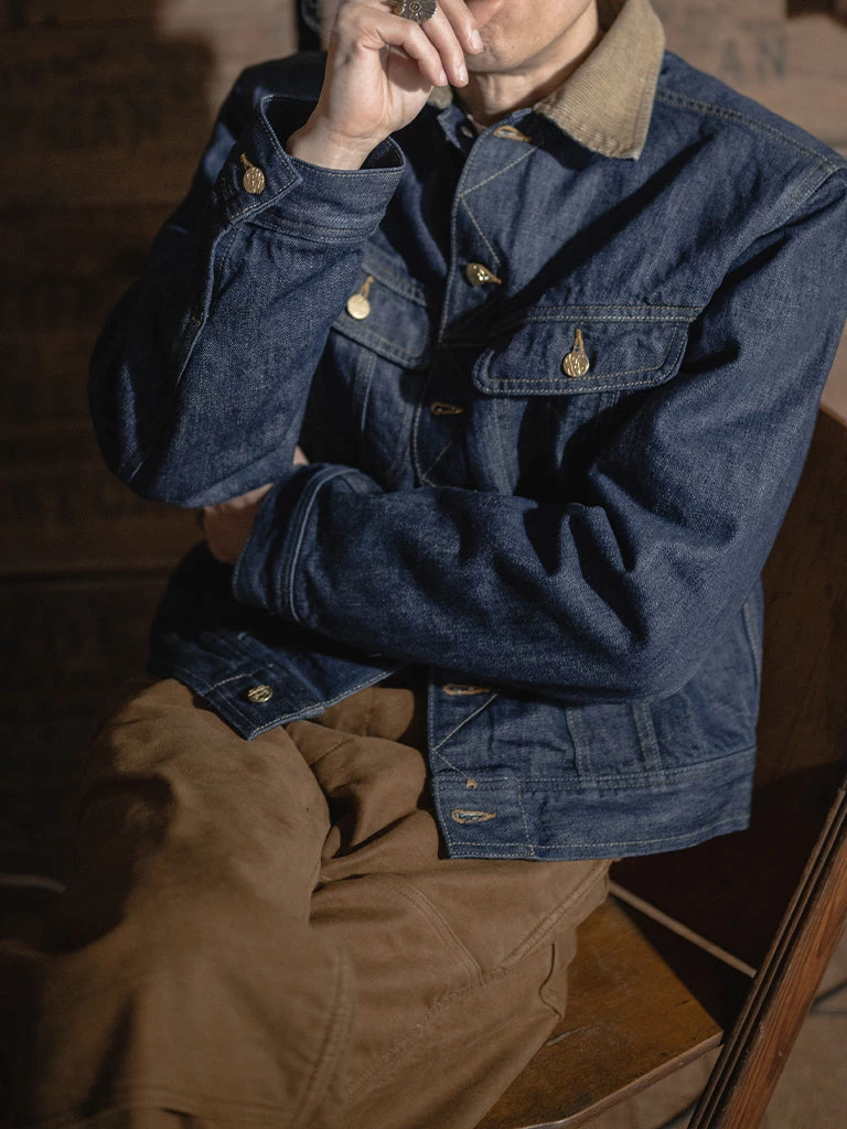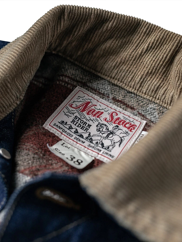 This denim jacket uses the traditional ring spinning fabric, with a soft and comfortable texture, and uses indigo dyeing. The lining uses the American Indian style woven blanket cloth, the same cut as the original, the spirit is able. To use NON STOCK new brass cowboy buckles. The jacket hem adjustment buttons are natural corozo buttons.
