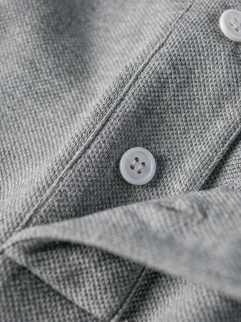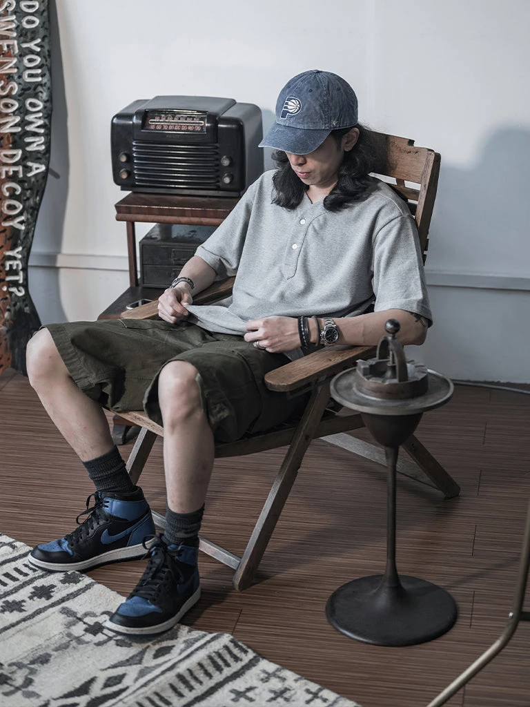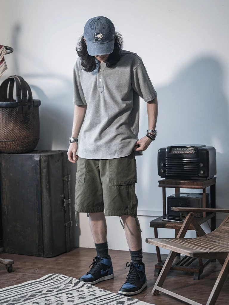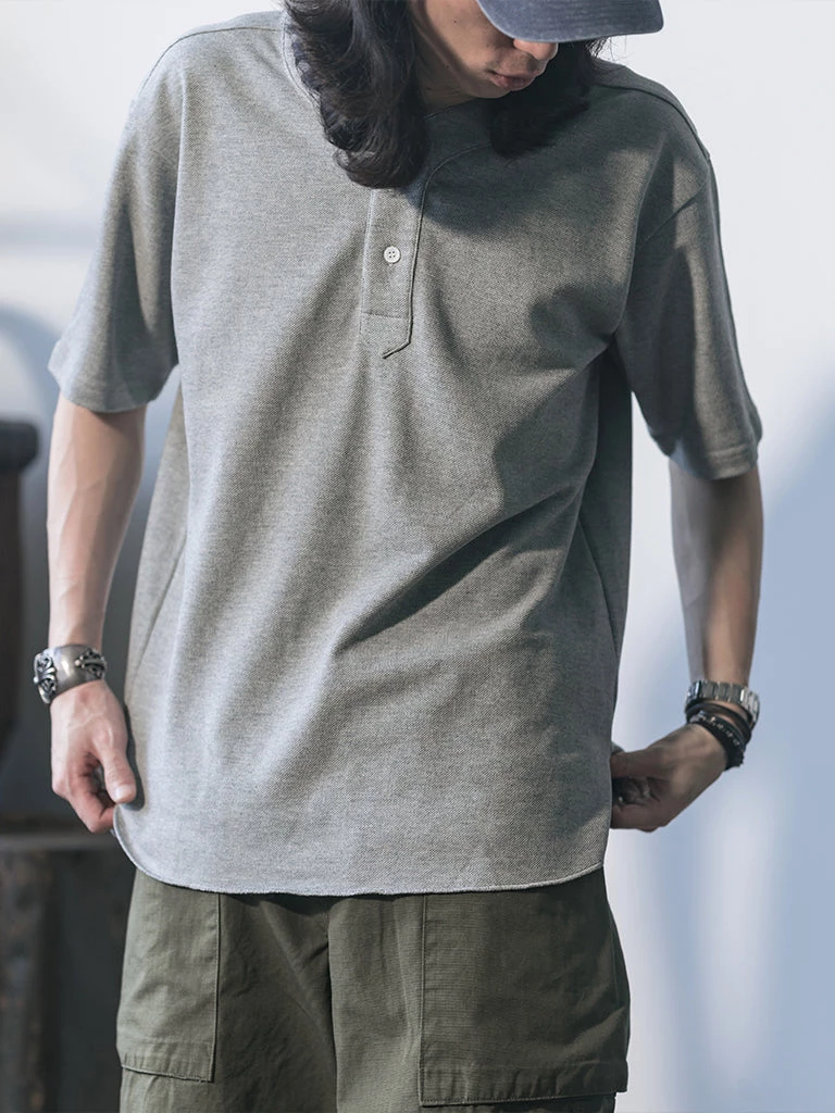 This T-Shirt is made of cotton pique, breathable and durable, with two white natural shell buttons fastening. Classic baseball shirt front placket, and dropped shoulders cut. Create casual style modeling easily.