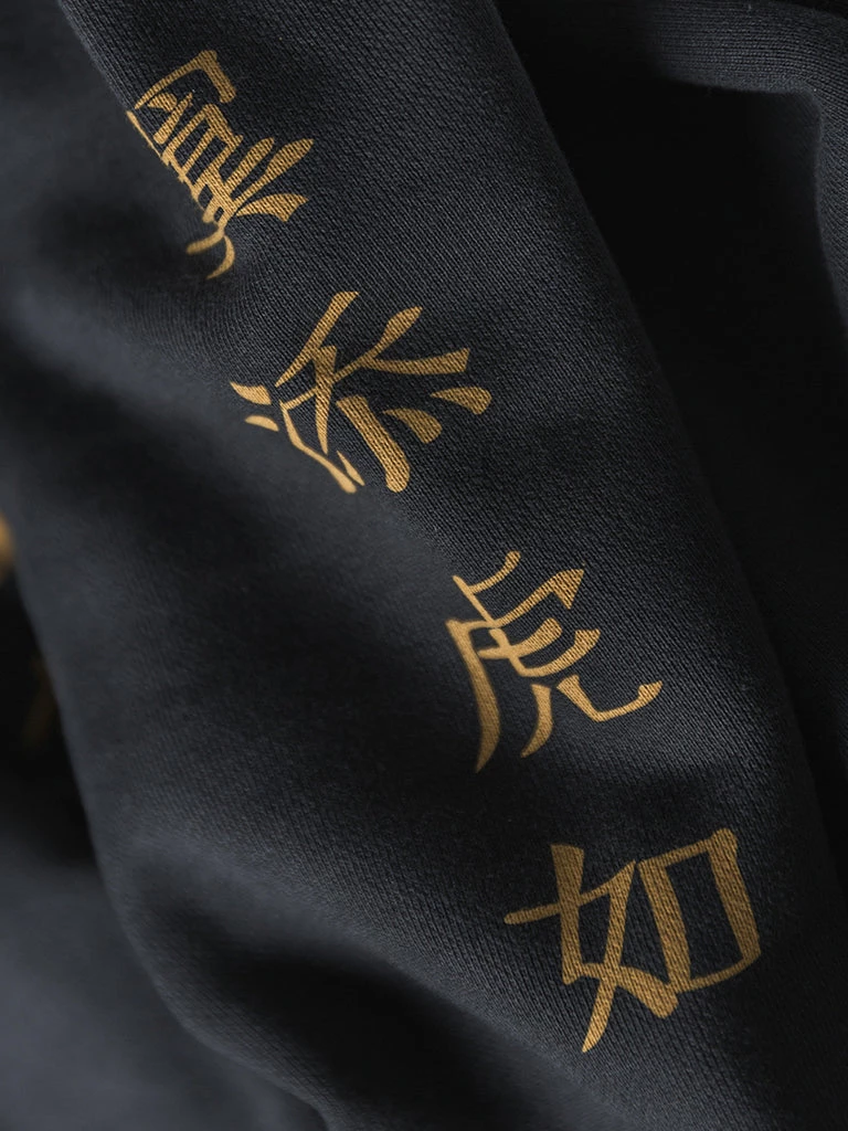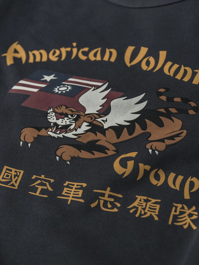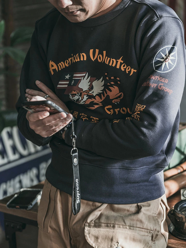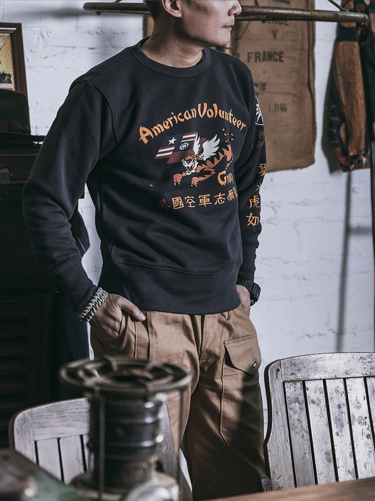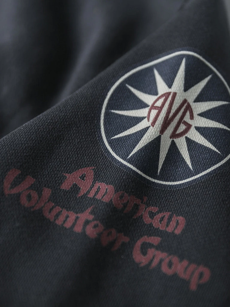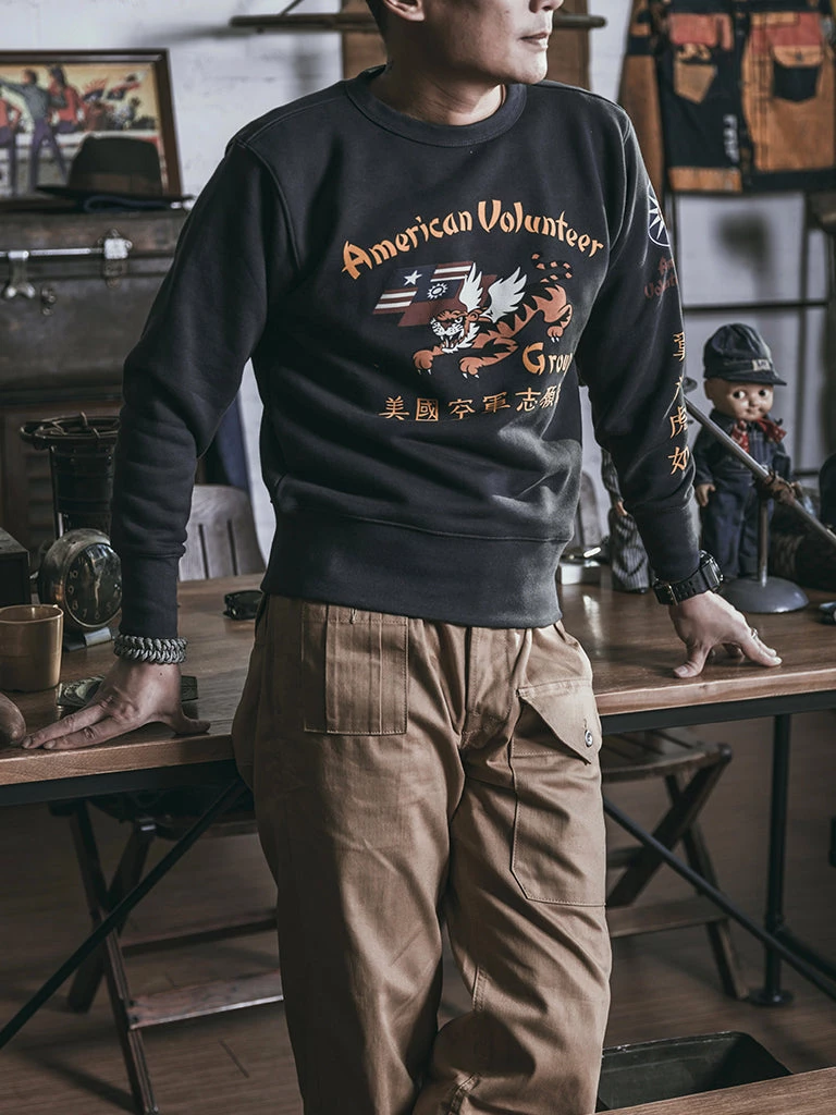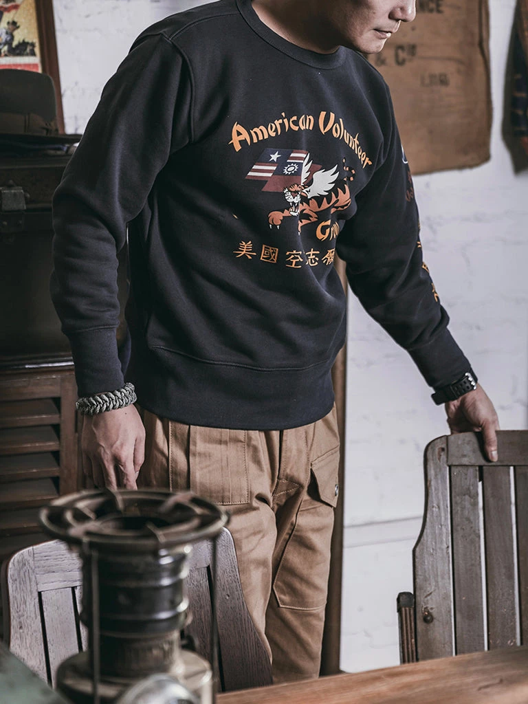 This sweatshirt is made of 17.5 oz terry cloth with a “Flying Tigers” pattern printed on the chest. It’s soft, has no static electricity, can be worn close to the skin, and has good elasticity. The sewing technology adopts the classical sewing process: overlocking and then interlocking. Compared with an ordinary single overlock, it’s stronger and more beautiful.