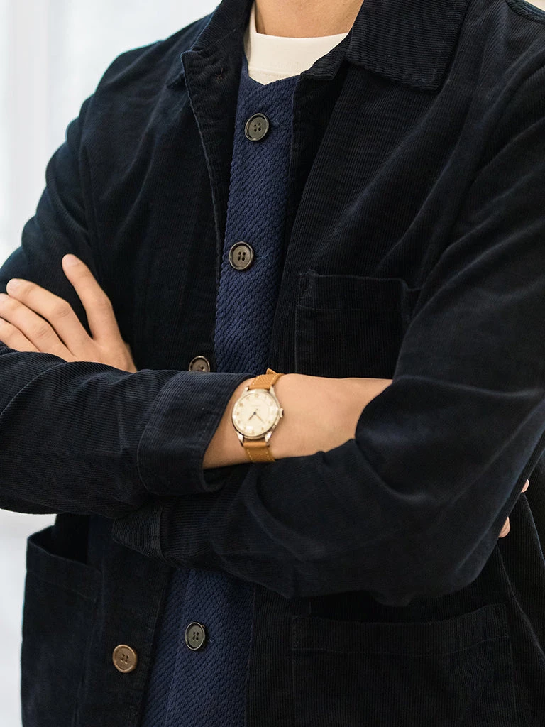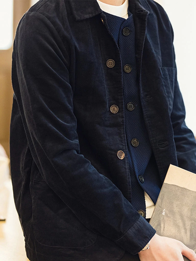 Inspired by the classic 1940s French 3-pocket workwear jacket (Bleu de Travail), Fit cut, and made from indigo-dyed corduroy fabric with a light wash process, it feels comfortable and textured, and paired with natural horn buttons, is a jacket you can’t miss.