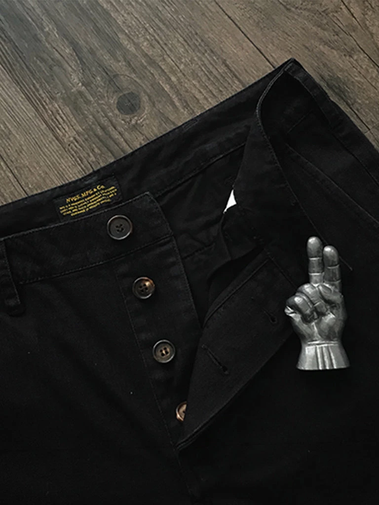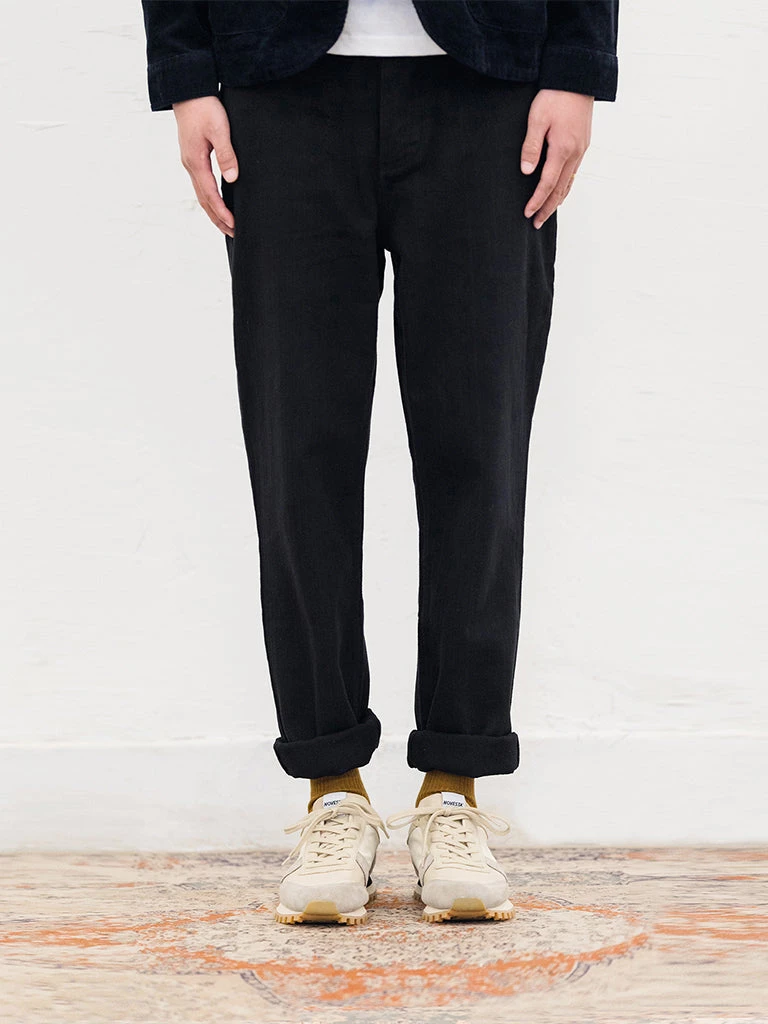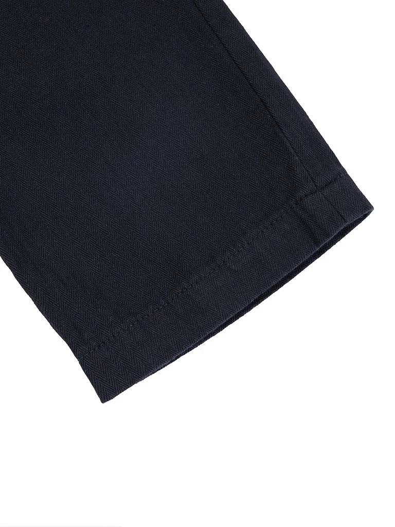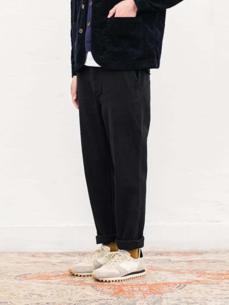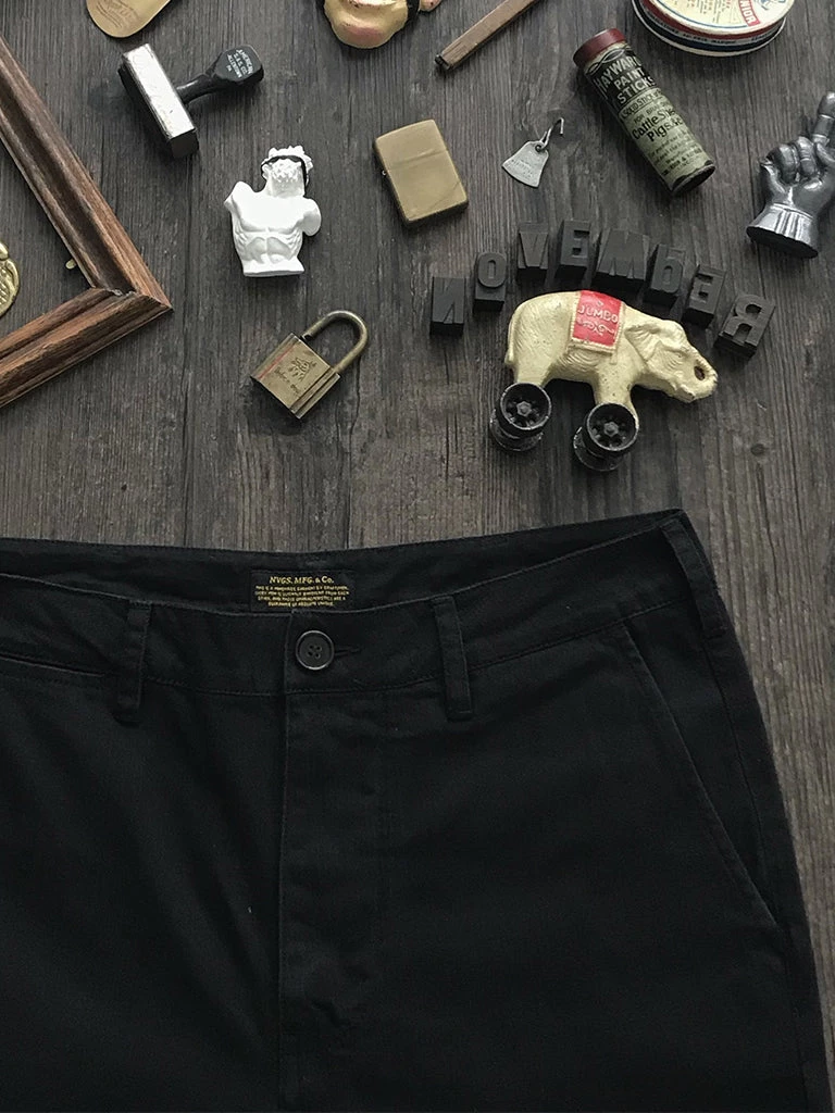 Based on the US Army officer chino pants in the 1940s. It’s made of black herringbone twill (HBT) fabric, high waist cut, and has undergone a slight garment wash process, with a slight vintage look. Each pair of trousers is made by artisans using antique sewing machines, including the Union Special 43200G machine made in the 1930s.