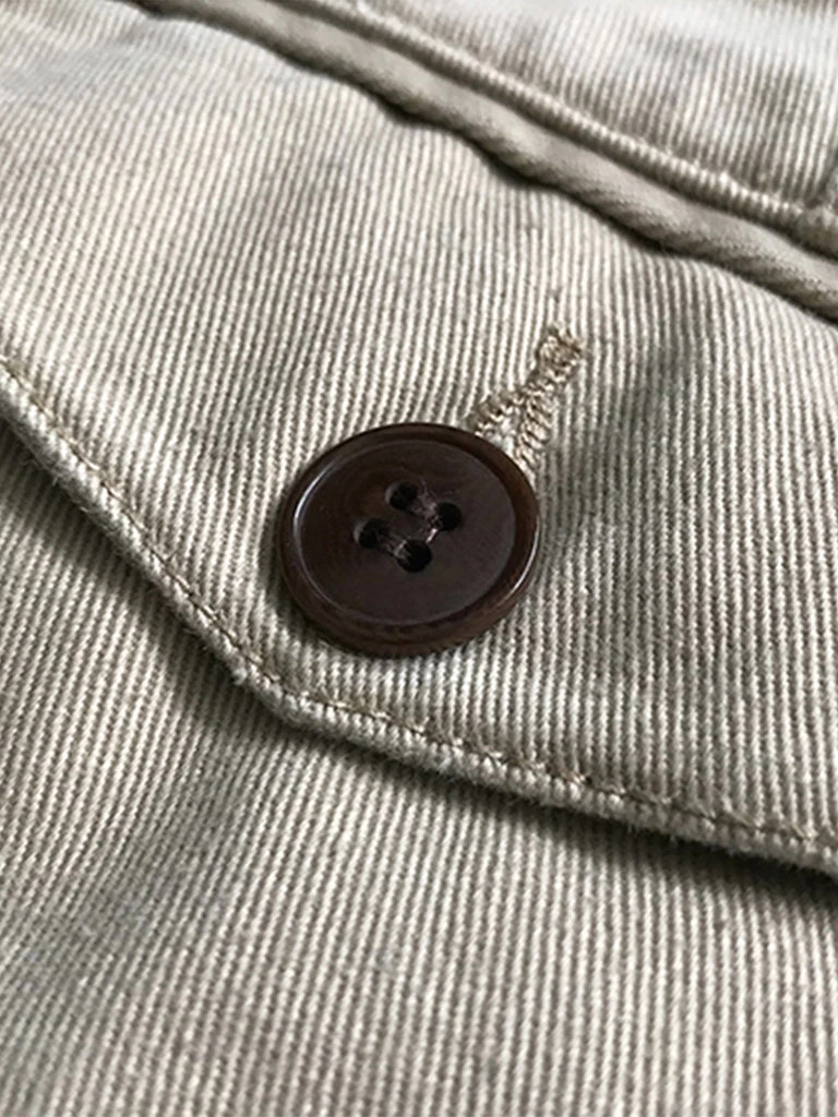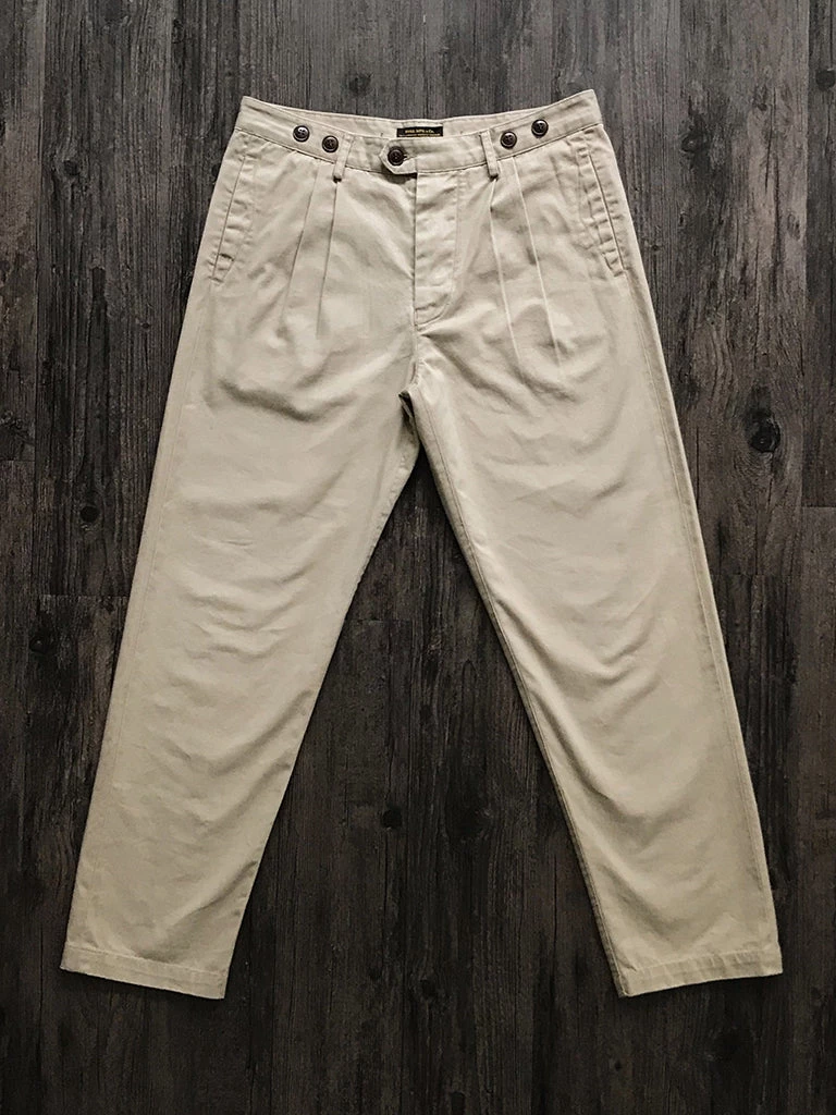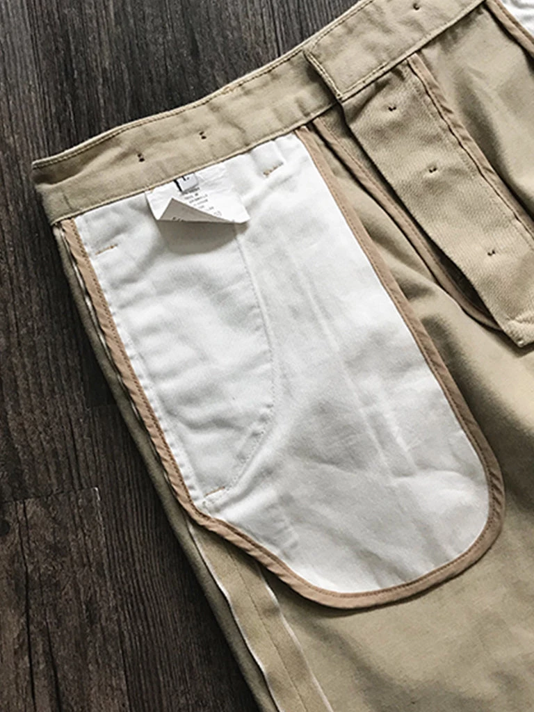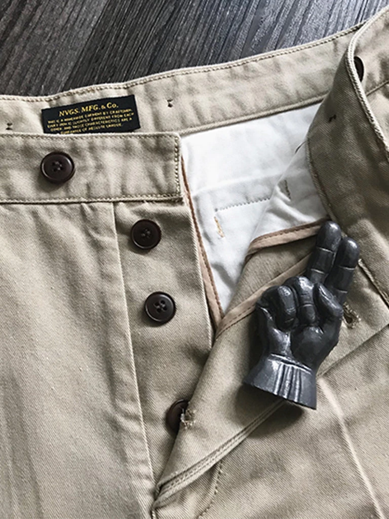 Based on the British Army officer chino pants in the 1940s. It’s made of 14 oz twill canvas, middle waist cut, and has undergone a slight garment wash process, with a slight vintage look.