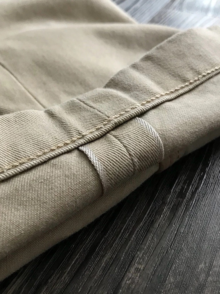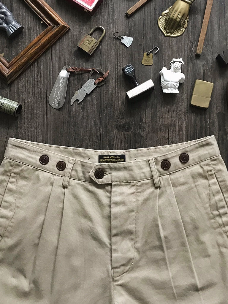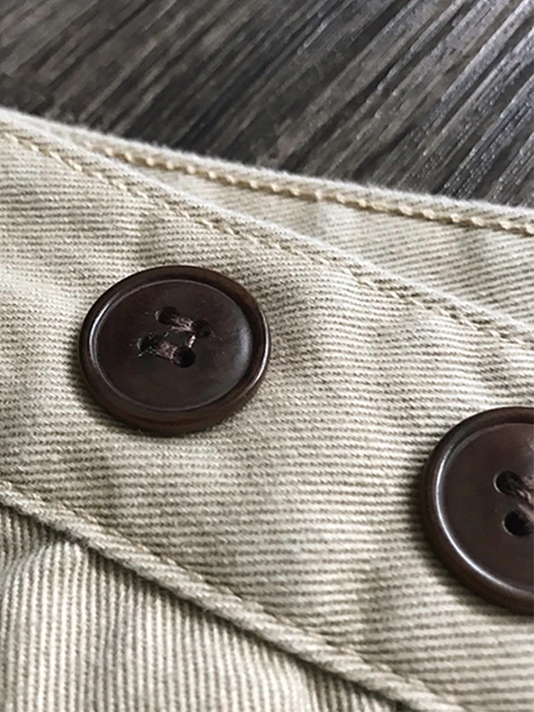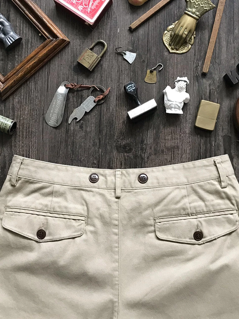 Based on the British Army officer chino pants in the 1940s. It’s made of 14 oz twill canvas, middle waist cut, and has undergone a slight garment wash process, with a slight vintage look.